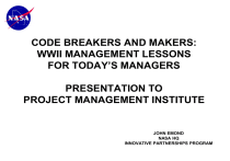 CODE BREAKERS AND MAKERS: WWII MANAGEMENT LESSONS FOR TODAY’S MANAGERS PRESENTATION TO PROJECT MANAGEMENT INSTITUTE JOHN EMOND NASA HQ INNOVATIVE PARTNERSHIPS PROGRAM PRESENTATION OUTLINE • CODES IN HISTORY • CODE BREAKING, CODE MAKING, WWII IMPORTANCE OF PROTECTING/CRACKING CODES BLETCHLEY PARK CODE BREAKERS AND THE GERMAN ENIGMA, LORENZ MACHINES NAVAJO CODE TALKERS/MAKERS • PROJECT MANAGEMENT THAT FOSTERED CODE BREAKER, CODE MAKER SUCCESS AND LESSONS FOR TODAY’S MANAGERS 2 ANCIENT CODES Disc of Phaistos Source: Wikipedia The disc of Phaistos was found in 1903 in the ancient city of Phaistos, southern Crete and is believed to date to ~1700 B.C. Several reference sources indicate the meaning of its symbols remains unknown. 3 17TH CENTURY CODE Written August 31, 1645. • Prince Maurice to Lord Digby; both senior commanders in armies of Charles I. • Much of code remains a mystery but enough is known that the message regards Royalist town of Hereford about to be attacked by Parliament forces during English Civil War. 4 (Source: U.K. National Archives) AMERICAN REVOLUTION AMERICAN TRAITOR July 12, 1780 -- Benedict Arnold to British Major John André (Code) I 293.9.7 to C_t. B. 103.8.2. the 7th 152.9.17. that , a F__ 112.9.17. and 22.8.29 were 105.9.50 to / 4 9.71 in 62.8.20 with , 163.8.19 A 22.8.19 at with 230.8.13. 263.8.17 I gave Mr. S--y a 164.8.16 / 147.8.261 to be 209.9.216 in C----a and have from 163.8.17 to .163.8.17 .58.8.27 to him. / Such 147.8.21 as I 164.9.5 147.9.16 s which he 24.9.125 me has 169.9.23'd to you / I 129.8.7 .46.9.22'd no 19.8.29 to 175.9.17 . 158.8.8 - or any 177.8.13 . 168.9.13 . ------- / I 105.9.5. soon to 57.9.7 .at 288.9.8 , 198.9.26, and most . 230.8.12. by --- / 291.8.27 an 149.8.27 with ---255.9.11 . 148.8.22, 182.4.28 in whom a 175.9.12 / 67.8.28 could be .196.9.16 --- the 177.8.8 is .103.8.19 to 22.9.3, and / to 66.8.15 -- are 182.8.28, 169.8.25 be . 260.8.5 , 205.9.3 near / that 209.9.18. --- and 192.9.9'd to 224.9.9 on ,188.8.13 or some ---- / 182.8.28 on 188.8.13 sent 185.6.24 to 95.9.124 an .104.8.1 120.9.7, W------- 105.9.5's on the .22.9.14.---- / of 163.8.19 F---- 172.8.7s to 56.9.8 |30.000| 172.8.70 to 11.94. in / 62.8.20. If 179.8.25, 84.8.9'd, 177.9.28. N---- is 111.9.27.'d on / 23.8.10. the 111.9.13, 180.9.19 if his 180.8.21 an .179.8.25., 255.8.17. for / that, 180.9.19, 44.8.9 --a-- is the 234.8.14 of 189.8.17. I --/ 44.8.9, 145.8.17, 294.9.12, in 266.8.17 as well as, 103.8.11, 184.9.15.---- / 80.4.20. ---- I149.8.7, 10.8.22'd the 57.9.71 at 288.9.9, 198.9.26, as, a / 100.4.18 in 189.8.19-- I can 221.8.6 the 173.8.19, 102.8.26, 236.8.21's--- / and 289.8.17 will be in 175.9.7, 87.8.7--- the 166.8.11, of the .191.9.16 / are .129.19.21 'of --- 266.9.14 of the .286.8.20, and 291.8.27 to be an ---163.9.4 / 115.8.16 -'a .114.8.25ing --- 263.9.14. are 207.8.17ed, 125.8.15, 103.8.60--- / from this 294.8.50, 104.9.26 -- If 84.8.9ed -- 294.9.12, 129.8.7. only / to 193.8.3 and the 64.9.5, 290.9.20, 245.8.3 be at an, 99.8.14 . / the .204.8.2, 253.8.7s are 159.8.10 the 187.8.11 of a 94.9.9ing / 164.8.24, 279.8.16, but of a .238.8.25, 93.9.28. From the Clinton Collection, Clements Library 5 AMERICAN REVOLUTION AMERICAN TRAITOR July 12, 1780 -- Benedict Arnold to British Major John André (Selected Deciphered Passages) I wrote to Captn B[eckwith]-on the 7th of June, that a F[rench]--- fleet and army / were expected to act in conjunction with the A[merican]--- army. - I expect soon / to command W[est] P[oin]t and most seriously wish an interview with some / intelligent officer in whom a mutual confidence could be placed. • • I have accepted the command at W[est]. P[oint]. As a Post in which / I can render the most essential Services, and which will be in my disposal. / The mass of the People are heartily tired of the War, and wish to be on / their former footing They are promised great events from this / year's exertion -- If - disappointed - you have only to persevere / and the contest will soon be at an end. • As Life and fortune are risked by serving His Majesty, it is / Necessary that the latter shall be secured as well as the emoluments / I give up, and a compensation for Services agreed on and a Sum / advanced for that purpose - which I have mentioned in a letter / which accompanies this, which Sir Henry will not, I believe, think / unreasonable. 6 From the Clinton Collection, Clements Library AMERICAN REVOLUTION AMERICAN TRAITOR July 12, 1780 -- Benedict Arnold to British Major John André (Deciphered) I wrote to Captn B[eckwith]-on the 7th of June, that a F[rench]--- fleet and army / were expected to act in conjunction with the A[merican]--army. At the same time / I gave Mr. S[tansbury]-a manifesto intended to be published in C[anad]---a, and have / from time to time communicated to him such intelligence as I thought / interesting, which he assures me he has transmitted to you. I have / received no answer from my Letter, or any verbal Message - I expect soon / to command W[est] P[oin]t and most seriously wish an interview with some / intelligent officer in whom a mutual confidence could be placed. The / necessity is evident to arrange and to cooperate - An officer might / be taken Prisoner near that Post and permitted to return on parole, / or some officer on Parole sent out to effect an exchange. General W[ashington]--- expects on the arrival of the F[rench]--Troops to collect / 30,000 Troops to act in conjunction; if not disappointed, N[ew]. York is fixed / on as the first Object, if his numbers are not sufficient for that Object, / Can-a- is the second; of which I can inform you in time, as well as of / every other design. I have accepted the command at W[est]. P[oint]. As a Post in which / I can render the most essential Services, and which will be in my disposal. / The mass of the People are heartily tired of the War, and wish to be on / their former footing - They are promised great events from this / year's exertion -- If - 