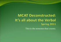 This is the semester that counts. The Overview & Practice Test 3 It’s serious now The next few months will have the most significant impact on your success or failure in your application to medical school Applying to Medical School 1st thing they look at: GPA and MCAT score Your GPA is pretty much set by this point Your MCAT score is still wide open For TEXAS EY 10 For Texas, EY 2010: 4044 applied, 1563 accepted GPA MCAT Averages for the Applicant Pool 3.52 27.6 Averages for the Acceptance Pool 3.77 31.1 Applying to Medical School 2nd thing they look at: What else do you have? Clubs and Organizations Student Athlete Work Family Volunteer Mentoring / Shadowing Summer Programs Letter of Recommendation Personal Statement Applying to Medical School 3rd step: The Interview About 600 – 800 people invited per school All who are invited are eligible and qualified applicants to medical school Workshop: around the first weekend of school in the fall Now - it’s all about the MCAT Four Sections Physical Sciences Verbal Reasoning Writing Sample Biological Sciences Computer Based Test (CBT) 25 tests scheduled in 2011 www.aamc.org/mcat MCAT Scores This is a distribution of scores from recent MCAT administrations in El Paso; those in red are accepted. Under 20: 2 0/2 ACCEPTED 20-21: 2 22-23: 9 24-25: 8 26-27: 4 28-29: 4 30-31: 3 32-33: 1 0/2 AC 4/9 AC 4/8 AC 1/4 AC 3/4 AC 2/3 AC 1/1 AC (5/9 interviewed) (7/8 interviewed) (3/4 interviewed) (4/4 interviewed) (3/3 interviewed) And these Are the 2011 dates. Pick a date. Pick it now. Pay for it now. Stick to it. Prepare for it. Do not change it. Do not postpone it. Revel in it. Celebrate it. Look forward to it. Study for it. Smash it. January 28, 29 March 26 April 9, 16, 29 May 7, 20, 21, 26 June 16 July 6, (16, 28, 29 August 5, 6, 12, 18, 19, 23 September 1, 2, 8, 10) Physical Sciences 70 minutes 52 multiple choices questions 7 passages followed by 4 – 7 questions each Passages average 200 words in length and are often accompanied by one or more charts, diagrams, or tables 13 stand alone questions Physics and General Chemistry http://www.aamc.org/students/applying/mcat/preparing/ Followed by a 10 minute break Verbal Reasoning 60 minutes 40 questions 7 passages followed by 5 – 7 questions About 500 words each Topics include the humanities, social sciences and natural sciences http://www.aamc.org/students/applying/mcat/preparing/ Followed by a 10 minute break Writing Sample Two 30-minute essays No break is given between the essays You are given a statement and asked to write three tasks Explain the statement Introduce a situation in which the statement would not legitimately apply Come up with a guide for judging whether statement applies or not in individual cases Read & scored twice; different readers; avg. converted to letter score Followed by a 10 minute break http://www.aamc.org/students/applying/mcat/preparing/ Biological Sciences Same format as Physical Sciences 70 minutes 52 multiple choices questions 7 passages followed by 4 – 7 questions Passages average 200 words in length and are often accompanied by one or more charges, diagrams, or tables 13 stand alone questions Biology, organic chemistry, and genetics http://www.aamc.org/students/applying/mcat/preparing/ 3 Main Factors to Success Budgeting enough time to practice Practicing correctly Committing to the importance of strategy Our Focus Meet only 8 Saturdays in spring semester Provide you with best preparation materials available Close examination of MCAT structure Strategy-apply your knowledge to unique testing situation Practice to become test taking machine Success = ½ content ½ strategy This is one of the hardest things for good science students to believe But IT’S TRUE. You all earned A’s or B’s in all the prereq classes, so why don’t you all do really well on this test? Because it’s not all about the content. And ATTITUDE I’m so scared of the MCAT. I’m afraid I’m going to bomb this test. The MCAT is a difficult test. However, I am preparing very well. I know how the test is structured. I know what content needs extra attention and I am developing strategies to get a great score. I am going to do well on this test. Do you want to go to medical school? Then you have to do this and do it well. Group Work A good group can significantly enhance your ability to study and improve your skills A bad group can, well, you know. Advantages of a good group: Broaden the range of expertise Provide additional structure to your studying Encourage responsibilities to the group Use your group to discuss answer choices, listen to each other’s critical thinking Time Management Different than Timing (that’s per passage, per section) This is the big picture – day by day, week by week For each week, select specific days and times when you will study. Treat it as a serious commitment – just like a class or a job. Make it reasonable so you will stick to it. Thoughts about homework and strategy Compare strategy to going to the gym The purpose, especially in the beginning, is to learn technique, strategy – NOT speed First, work slowly, thoughtfully, and consistently to understand the idea behind the strategy. Then, move toward increasing speed Make a plan to work every single day on MCAT. Because this is not school Does one kind of shoe serve for every occasion? Why the focus on Verbal Reasoning? 1. It is most students’ weakest subject area. 2. It is the area of greatest interest to admissions committees. 3. The strategy for successful navigation of VR passages can be applied to the other subject areas. Verbal Reasoning Content Content tested is reasoning ability Your ability to appreciate the main idea and points the author makes, and recognize the implications Need no content knowledge for this section Answers are in the passage or implied therein Why aren’t you getting each one right? Verbal Deconstruction Verbal section has 3 components Passages Questions Answers There i