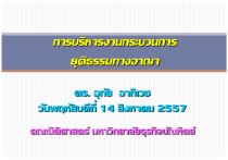 การบริหารงานกระบวนการ ยุติธรรมทางอาญา ดร. อุทัย อาทิเวช วันพฤหัสบดีท่ี 14 สิงหาคม 2557 คณะนิติศาสตร์ มหาวิทยาลัยธุรกิจบัณฑิตย์ ดร.กิตติพงษ์ กิตยารักษ์ ปลัดกระทรวงยุตธิ รรม ประมวลปัญหาของกระบวนการยุติธรรมทางอาญาของไทยไว้ ต้งั แต่ปี 2544 ระบบการบริหารงานยุติธรรมไม่มีโครงสร้ างของการบริหารงานยุติธรรมใน ภาพรวม และขาดทิศทางและความร่วมมือกันระหว่างหน่วยงาน องค์กรในระบบยุ ติธรรมมีโครงสร้ างที่ใหญ่ เกินไป ขาดการกระจายอานาจ อาทิ สานักงานตารวจแห่ งชาติ มีผลต่อการทางานอย่างมีประสิท ธิภาพและ ต้ นทุนสูง มีการนาคดีเข้ าสู่ระบบยุ ติธรรมมากเกินสมควร เนื่องจากมีกฎหมายอาญา กาหนดความผิดไว้ จานวนมากเกินไป แม้ ว่าพฤติกรรมเหล่านั้นจะเป็ นเพียง การกระทาที่กฎหมายกาหนดว่าเป็ นความผิดที่ไม่ใช่เป็ นอาชญากรรมโดยแท้ ระบบการกลั่น กรองคดีขาดประสิทธิภาพ การดาเนินคดีมีความล่ าช้ า จน ก่อให้ เกิดปัญหาคดีล้นศาลและผู้ต้องขังล้ นเรือนจา สภาพปัญหากระบวนการยุติธรรมทางอาญาของไทย รศ.ประเทือง ธนิยผล 1. ระบบการบริหารงานยุติธรรมขาดเป้ าหมาย ทิศทาง โครงสร้ าง 2. ระบบการดาเนินคดีอาญา 3. ระบบการปฏิบัติต่อผู้กระทาความผิด 4. ปัญหาที่เกิดจากการปฏิบัติโดยไม่ชอบธรรมจากบุคคลในกระบวนการ ยุติธรรม อันเป็ นการล่วงละเมิดสิทธิเสรีภาพของประชาชน 5. กระบวนการยุติธรรมขาดการมีส่วนร่วมและการสนับสนุนจากประชาชน 6. กระบวนการยุติธรรมขาดองค์ความรู้และศักยภาพในการพัฒนา 7. บุคลากรในกระบวนการยุติธรรมขาดจิตสานึกและขาดทัศนคติท่ดี ีในการ ให้ บริการความยุติธรรมแก่ประชาชน ปัญหาหลักในกระบวนการยุตธิ รรมทางอาญาของไทย ศ.ดร.สุ รศักดิ์ ลิขสิ ทธิ์วฒ ั นกุล 1) ปริมาณคดีเข้ าสู่ การดาเนินคดีมาก เพราะ ก. มีการกาหนดการกระทาที่เป็ นความผิดมาก เกินไป (Overcriminalization) ข. ไม่ มีระบบการผันคดีทพี่ อเพียง (Diversion) 2) ความล่าช้ าในการดาเนินคดี เพราะ ก. แต่ ละคดีใช้ เวลานาน ข. ความยุติธรรมทีล่ ่าช้ า คือ ความอยุติธรรม Justice delayed = Justice denied 3) ความเสมอภาคในกระบวนการยุติธรรม ก. ระบบอุปถัมภ์ ในสั งคมไทย : การช่ วยเหลือ/การทุจริต ข. ฐานะทางเศรษฐกิจทีแ่ ตกต่ าง - ระบบการประกันตัวผู้ต้องหา/จาเลย - ระบบการกักขังแทนค่ าปรับ ค. ระบบการช่ วยเหลือด้ านกฎหมาย (Legal aid) 4) ทัศนคติของบุคลากรในกระบวนการยุตธิ รรม ก. ขาดความเข้ าใจบทบาทของตนเอง (ทาขาด/ทาเกิน) - พนักงานสอบสวน - พนักงานอัยการ - ศาล ข. ความซื่อสั ตย์ ต่อหน้ าที่ - คดี เชอรี่แอน ดันแคน ค. แย่ งอานาจ 5) บุคลากรขาดการปรับตัวกับภาวะโลกาภิวฒ ั น์ (Globalisation) เนื่องจากความผิดอาญาซับซ้ อนขึน้ มีคดีไม่ เฉพาะแต่ ค