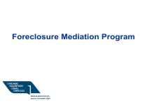 Foreclosure Mediation Program Mortgage Foreclosure Filings in Cook County 2000 2001 2002 2003 2004 2005 2006 2007 2008 2009 12,705 16,228 17,450 15,815 15,632 16,494 22,248 32,651 43,876 47,049 Mortgage Foreclosure Filings in Cook County 2010 – Estimated foreclosure case filings: 48,000 – 52,000 – 60,766 mortgage foreclosure cases were pending as of March 31, 2010 Chicago Volunteer Legal Services “CVLS” – Funded in 1964 – Largest, non-government funded – Over 2,900 volunteers – In 2009, CVLS provided free legal services to 17,427 low income people in the Chicago area CVLS Contact Information Patricia Nelson, Director of Foreclosure Mediation Program 312-332-5539; pnelson@cvls.org Natalie Weidemier, Attorney Support Supervisor 312-332-1687; nweidemier@cvls.org Rebekah Rashidfarokhi, Staff Attorney 312-332-7399; rrashidfarokhi@cvls.org Shirley Chiu, Staff Attorney 312-332-8239; schiu@cvls.org Veronica Rodriguez, Foreclosure Mediation Administrator 312-332-3508; vrodriguez@cvls.org Access to Justice – Court appointed by the Chancery Division – Full legal representation for pro-se litigants – 150-200 cases/year – Possible representation for foreclosure cases that do not settle in mediation Default Foreclosure Timeline January – March Pre-Complaint: 3 missed payments April Complaint: Filed Late April Jurisdiction: Service June Case Mgmt Date: No Appearance filed July Motion for Default Judgment entered November December Sale: No notice if default Sale Confirmed: OP stayed for 30 days Contested Foreclosure Timeline January – March Pre-Complaint: 3 missed payments April Complaint: Filed Late April Jurisdiction: Service June Case Mgmt Date: No Appearance filed July Motion for Default Judgment: Borrower appears and requests time to file Appearance & Answer. Judge grants 30 days Contested Foreclosure Timeline August Borrower files Appearance & Answer Late August Borrower issues Discovery to Lender Late April Jurisdiction: Service November Lender partially responds to Discovery December Borrower sends 201(k) letter January, 2011 Lender complies w/ Discovery Contested Foreclosure Timeline February Motion for Summary Judgment: Borrower requests Briefing Schedule (28 days to Respond, 14 to Reply) and Hearing Date May Summary Judgment entered – sale cannot take place for 90 days September Sale October Confirmation of Sale, OP stayed for 30 days November Borrower must relinquish possession of property Mediation Process Timeline January – March Pre-Complaint: 3 missed payments April Complaint: Filed Late April Jurisdiction: Service Early May Borrower calls Hotline on Summons, receives appt. to meet w/ HUD and CLC Mid-May Borrower meets w/ HUD counselor & begins loan mod process. Borrower meets w/ CLC attorney who reviews for legal defenses & assists with Appearance, Answer, Mtn Mediation Mediation Process Timeline June Case Mgmt Date: Mediation Order entered, CVLS appointed June CVLS and Plaintiff’s attorney receive Notice of Mediation date. Date will be scheduled w/in 5 weeks of Case Management Date June CVLS volunteer (YOU) agree to accept case July You meet w/ client – either personally or over phone Mediation Process Timeline July Email Plaintiff’s attorney to negotiate loan mod. No agreement reached August Mediation- case settles w/ a desired loan mod August Receive final written agreement, client executes September 12 Week Post-Mediation Status: You are not required to attend. Plaintiff dismisses case Retention Options Borrower Remains in the Property Loan Modification – Lender modifies one or more of these terms: - Interest Rate - Term of the Loan - Principal – Two types: HAMP & Non-HAMP Retention Options Borrower Remains in the Property HAMP Loan Modification – Federal program – Monthly mortgage payment no more than 31% of gross income – Modification sequence: reduce interest rate, extend term of the loan, forbear principal Retention Options Borrower Remains in the Property Forbearance - Lender agrees not to accept payments for a specified period of time - Unemployed borrowers or those experiencing a temporary, finite loss of income - UP Program Retention Options Borrower Remains in the Property Repayment - Borrower pays arrearages (missed payments, attorney’s fees, lender’s costs) over a period of time, usually 6-12 months - Borrower must make regular mortgage payment in addition to repayment amount - Unrealistic for most borrowers Retention Options Borrower Remains in the Property Chapter 13 Bankruptcy - Stays foreclosure if filed before the sale - Borrower’s debt, including mortgage arrearages, consolidated and borrower makes monthly payment to trustee - Borrower must make regular mortgage payment as well - Last alternative – negative impact on credit Non-Retention Options Borrower Surrenders Possession of Property Deed in Lieu of Foreclosure - Borrower deeds property to lender and lender agrees not to pursue personal deficiency - Why? Credit score, cannot reinstate, no equity - Why not? Cook County judges rarely grant personal deficiency judgments, less time in the property, credit still negatively impacted Non-Retention Options Borrower Surrenders Possession of Property Consent Judgment - Similar to DIL except 2nd mortgage on property – 2nd mortgagee bound if proper notice & does not object – 2nd mortgagee can later file a collection case based on the Note even though mortgage foreclosed Non-Retention Options Borrower Surrenders Possession of Property Short Sale - Sale price does not cover outstanding mortgage - Lender approval required - Amount forgiven IS taxable if investment property Non-Retention Options Borrower Surrenders Possession of Property Cash for Keys - DIL variation - Lender pays Borrower to timely vacate home w/out destroying property - Lender avoids incurring eviction costs Non-Retention Options Borrower Surrenders Possession of Property Exit w/ Post-Foreclosure Rental - Lenders’ inventory of foreclosed homes ar