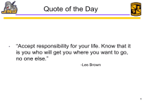 Quote of the Day • “Accept responsibility for your life. Know that it is you who will get you where you want to go, no one else.” -Les Brown 1 S1: Battalion Strength Report Contracted MS 1 MS 2 MS 3 MS 4 MS 5 Totals 11 20 26 36 3 96 Grand Totals Non-Contracted MS 1 MS 2 MS 3 Totals 33 13 0 46 Contract: 96 NC: 46 Total: 142 2 S1 - Projects Task Last Update Project “Finish” Notes Basic Lab Rosters 1 FEB 2013 Complete Update When Needed. Company Rosters 5 MAR 2013 Complete Update When Needed. Master Accountability Spreadsheet 12 April 2013 Always In Progress Updated Daily 3 S2 Current Events • Two explosions at Boston Marathon Finish Line Multiple deaths, casualties, and amputees Shrapnel found in victims • More explosives found on scene by police • No news on yet who was responsible Jihadists? Domestic Terrorists? Single Lone Actor? As of 1600 15 April 13 4 Weather Warm weather all week with small chance of precipitation. Key Weather: 40% chance of Thunderstorms on Friday. 5 T 15APR13-19APR13 Monday, 15 April Tuesday, 16 April Wednesday, 17 April JFTX RECOVERY PT: A Co: 0550 Memorial TBD B Co: 0550 Memorial TBD PT: A Co: 0550 Godwin Core/Upper B Co: 0550 UREC Run, Upper PT: A Co: 0550 UREC Run, Upper B Co: 0530 Godwin Ruck March Ranger Group: Joins BN PT Ranger Group: 0530 Memorial KB Circuit Ranger Group: 0530 Memorial Run circuit Choices 0915-1030 1030-1130 l l l \/ 1330-1430 Co Meetings: 2000 IVs: Supply Turn-In 0530 Memorial Thursday, 18 April Friday, 19 April GUTS Competition: 1535 Elliott/Roessel Maisel/Betourne Squad Competition 6 T-1 22APR13-26APR13 Monday, 22 April Tuesday, 23 April Wednesday, 24 April PT: A Co: 0550 Godwin Core/Upper/Run B Co: 0550 UREC Core/Upper/Run PT: A Co: 0550 Memorial TBD B Co: 0550 Memorial TBD PT: A and B Co: 0550 Godwin APFT Standards, Prep Ranger Group: 0530 Godwin Sprints Ranger Group: Joins BN PT Thursday, 25 April Friday, 26 April APFT: All Units: 0520 Bridgeforth Co Meetings: 2000 7 8 Basic Lab (10APR13) AAR • Issue • Discussion • Teach class earlier Discussion • Pitch an OPORD to the class following the block of instruction IOT assess their comprehension and understanding of subparagraph location and meaning Issue • The Cadets wanted an opportunity to apply their freshly learned tips Recommendation • No OPORD practical exercise Cadets felt it would have been more useful to hold this lab earlier in the semester Recommendation Hold the OPORD lab practical IAW the OPORD class 9 8 Step Training Plan the Training Certify Leaders Recon the Site Issue the Plan Rehearse Execute Conduct an AAR Retrain Date 17 APR 2013: SQUAD Competition 04 APR 13 05 APR 13 05 APR 13 08 APR 13 17 APR 13 17 APR 13 17 APR 13 TBD Concept of the Operation: Cadets and BCC’s will conduct a squad competition Phase 1- Preparation: Cadets will form up in the parking lot under the baseball fields for FF. Cadets will be split into 9 squads with an assigned MSIII as squad leader. An assigned MSIV will move with each squad in order to evaluate Phase 2- Movement: Each squad will move out to assigned starting lane where two MSIV’s will be stationed Phase 3- Execution: Each lane will begin at the sound of the horn. Squads will have 5 minutes to complete task. Each lane will be timed/graded for speed, accuracy, and quantity by assigned MSIV’s. After 5 min squads will have 2 min to rotate to next lane, in numerical order. Phase 4- Exfil: Cadets will regroup at FF cite, turn in weapons, and conduct a final AAR (Elliot, Roessel). Winners will be awarded Risk Assessment TRAINING EVENT: Squad Competition OIC: Maisel NCOIC: Betourne 8 MISSION: Cadets will compete in squads at multiple training exercises IOT demonstrate what they have learned throughout the year, apply skills in a variety of situations and to build camaraderie through competition. 9 7 1 6 2 1PLT 32 PLT End state: Cadets and BCCs will be scored on performances at each station and winning squad will be rewarded 4 5 LOW COORDINATION Location: Chestnut Ridge Resources: Dummy M16s, Water Jugs, CLS bag, litter, cones, pull up bar, maps, Claymores Req Soldier Equip: Cadets- ACUs. BCCs-civilians. All-water source, notebook, pen or pencil. LBV Key Personnel: Cadets and Lab participants with MSIVs as graders Administrative Control: Attendance will be taken IOT track Accountability. Check on learning and retraining will be conducted following training. Lab AAR will be conducted with class immediately following Completion of Training. References FM 7-92 Key Tasks: •Cadets perform LANDNAV skills •Cadets perform first aid , create and report a 9-line •Cadets perform a push and pull up contest •Cadets perform a Lane Tactics test •Cadets perform a claymore set up practical •Cadets conduct movement relays (low/ high crawl and buddy carries) •Conduct a final lab AAR for overall improved retraining in the future TIMELINE 13 FEB 13 •1530 First Formation •1535-1600 Designation of squads and movement to lane •1600-1705 Competition •1705-1710 Movement back to parking lot •1710-1720 AAR/ Grading and determination of winners •1720-1730 Award ceremony (winner for each lane and overall winner) T.M.U: Squad 1: Crisler Lane 1: Riscassi, Roessel Squad 2: Triplett Lane 2:Terry, Zero Squad 3: Elliot Lane 3: Gregorio, Florio Squad 4: Mueller Lane 4: Engle, Karski Squad 5: Baxter Lane 5: Gio, Fanning Squad 6: Bracero Lane 6: Cary, Pisano Squad 7: Pardue Lane 7: Fida, Anzalone Squad 8: Langan Inclement WeatherLane Plan8: Mraw, Wolfe Squad 9: Rankin Lane 9: Henderson Bruc competition will take place in the rain or Injured Soldier: Park Squad shine. The only change that will be made is that cadets will not run in between lanes, they will RANGE walk. Also, if there is lightening there will not be a pull up lane. This lane will be turned into sit-ups instead. 10 SQUAD COMPETITION BREAK DOWN 17 APR 2013 11 GENERAL • ALL MS4’s should have pencil on them • • • • • • Must keep track of grades for e