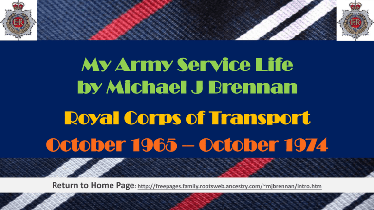 My Army Service Life by Michael J Brennan Royal Corps of Transport October 1965 – October 1974 Return to Home Page: http://freepages.family.rootsweb.ancestry.com/~mjbrennan/intro.htm The Royal Corps of Transport The Royal Corps of Transport (RCT) was a British Army Corps formed in 1965 from the transport (land, water and air) elements of the Royal Army Service Corps (RASC) and the movement control element of the Royal Engineers (RE). The Royal Corps of Transport Photo: Buller Barracks c.1965. Source: Hantsweb. After joining the army my first posting in 1965 was to the home of the RCT in Buller Barracks in Aldershot. Hampshire where we completed 12 weeks initial training. In 1993 the Royal Corps of Transport was disbanded and the Royal Logistic Corps (RLC) was formed by the amalgamation of The Royal Corps of Transport, Royal Army Ordnance Corps, Royal Pioneer Corps, Army Catering Corps, and Postal and Courier elements of the RE. Source: http://en.wikipedia.org/wiki/Royal_Corps_of_Transport The Royal Corps of Transport Royal Waggoner's History The Royal Corps of Transport The Corps was Raised in 1794 as the Royal Waggoner's, the Corps then became: The Land Transport Corps in 1855-1869 The Army Service Corps in 1869-1918 The Royal Army Service Corps in 1918-1965 The Royal Corps of Transport in 1965-1993 Royal Logistic Corps 1993 Source: http://www.54sqnrct.co.uk/waggoners.html The Royal Corps of Transport Royal Waggoner's Headquartered in Buller Barracks, Aldershot (above). Battle Honours: Peninsular; Waterloo; Lucknow; Takus Forts and Pekin. The R.C.T. has five Victoria Crosses and One George Cross. Regimental March: "Wait for the Wagon" Source: http://www.54sqnrct.co.uk/waggoners.html Intake 117, Smith Troop. 12 Training Regiment. RCT September 1965 I enlisted in British Army at the Army Recruitment centre in Edgware Road, London. I then had to go to the Home Office in Whitehall, London to be sworn in. October 1965 I was posted to 12 Training Regiment - Royal Corps of Transport, stationed at Buller Barracks Aldershot, Hants where I carried out my basic 12 weeks training. Intake 117, Smith Troop. 12 Training Regiment. RCT (1965) Back row—Wright, J., Page, Rond, Skipsey, Burling, Vincent, Low (Bobby), Carey, Sinclair, Mitchell, Lane, Toogood, Cooke, L'argent, Chaplin, Boll, McMullan, Winsborough, Brennan (Michael), Lowick, Murray, Holton, Lucas, Rockingham, Jolley, Morris. Centre row—Iliffe, Mason, Higson, Fletcher, Grieve, Bell, C. Nuttall, Brown, Arden, Wheeler, Ball, Herbert (Johnny), Hunter, Denton-Cox, Trollope, Lewis, Thomas, Royle, Hyley, Dew, McLean, Kinsella, Jones, Hawes, Burgess, Docherty, Spencer. Front Row—Anderson, Partlow, Clarke, R. G., Clarke. G. A., Flynn, Heanes, Maguire, Dearing, Dunlavey, Cpl Larvin (Wl), Cpl Blundell, S/Sgt Knight, Lt Hylden, Sgt Johnston, Cpl Drake, Cpl Pickup (WT), Bell W., Wood, Murray M., Rushworth, Wright C., Burgin, Adams, Ridley, Grant. Houndstone Camp Yeovil Somerset After a short R&R I then went to 6 Driver Training Regiment, Houndstone Camp, Yeovil, Somerset in December 1966 where I completed my driver training and passed my driving test in an Austin K9 in March 1966. Guard House Cookhouse Source of images: http://www.oocities.org/houndstone_camp/index.html The Globe Cinema Houndstone Camp Yeovil Somerset 6 Driver Training Regiment, Houndstone Camp, Yeovil, Somerset . I completed my driver training in an Austin K9 in March 1966. Source of images http://www.milweb.net/webvert/75932 In Apr 1966 my first posting was to BAOR 17 Sqn RCT St. David's Barracks, Hilden. Dusseldorf. West Germany. Source of photos: http://www.baor-locations.org/wrexhambks.aspx.html MT Park in 1950 Main Camp in 1950 Guard House in 1950 Cookhouse in 1950 Between Apr 1966 and February 1970 I visited a number of different places around Germany on various exercises and detachments. Bad Fallingbostel From Wikipedia, the free encyclopedia Bad Fallingbostel is the district town (Kreisstadt) of the Heidekreis district in the German state of Lower Saxony JHQ Rheindahlen. Mönchengladbach. Postcard sourced from ebay seller JHQ Rheindahlen, latterly also called the Rheindahlen Military Complex, is a British forces base in Mönchengladbach, North Rhine-Westphalia, Germany. JHQ stands for Joint Headquarters and the base has functioned as the main headquarters for British forces in Germany since it was built in the 1950s. Its German address is MönchengladbachJHQ with a post code of 41179. In 1967 I went with the squadron to West Berlin. We were based at Alexander Barracks with 62 Squadron RCT for 10 weeks. Source of photos: http://www.baor-locations.org/wrexhambks.aspx.html Patch of the British ground forces in Berlin. The red circle symbolizes the communist threat surrounding the city. It was introduced before 1950 and was worn on the left shoulder sleeve. Source: http://www.western-allies-berlin.com/insignia/gb/gb 62 Sqn (Berlin) RCT BAOR Training Camp, Sennelager, Germany Postcard from ebay seller 1970 - 27 March posted to Shajaha in the Middle East for 9 months. (Desert Rat) Deverall Barracks, Ripon In Dec 1967 - 17 Sqn RCT, was relocated to Deverall Barracks, Ripon in Nth Yorkshire. Returned to Ripon (due to defence cuts in BAOR). Deverall Barracks, Ripon Dempsey Barracks Sennelager 1968 - On exercise in Sennellager, Germany and made my second visit to Berlin with an Army Padre to attend a conference there. Drove an Austin 1300. 27th March 1970 - Travelled from Ripon to RAF Brize Norton. We flew to Sharjah (United Arab Emirates) via Bahrain (Persian Gulf) in a RAF VC10 16 December 1970 we returned to the UK flying from Sharjah to RAF Brize Norton on a RAF VC10 Flight No 2708 eventually returning to Ripon. Yorkshire. 16/12/70 - Travelled from Sharjah to RAF Brize Norton in a VC10 Flight No 2708 Apr 1971 - Borden on a Petrol/Stores Accounts course 1973 - 3 Jan - 6 Jul 'B' Troop, 38 Sqn RCT (Main) UNCYP Cyprus,(UN Meda) Jul 1973 - Aug 1974 'B' & 'C' Troop, 38 Squadron RCT, 