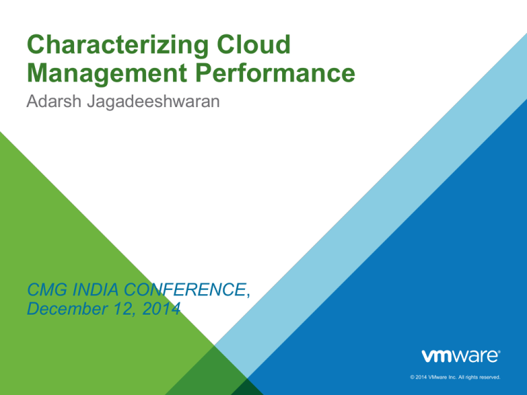 Characterizing Cloud Management Performance Adarsh Jagadeeshwaran CMG INDIA CONFERENCE, December 12, 2014 © 2014 VMware Inc. All rights reserved. Agenda •Building Blocks of VMware’s Cloud Infrastructure •The Software Defined Datacenter •Cloud Management Performance at VMware •Performance Challenges •Tools and Benchmarks •Role of Simulation •Performance Testing Methodology •Conclusion Building Blocks of VMware’s Cloud Infrastructure It all started with x86 virtualization Traditional Architecture Virtual Architecture CONFIDENTIAL 4 And features like.. • VM.migrate – Move the compute state of a Virtual Machine (VM) from one physical box to another – Typically used for resource load balancing • VM.snapshot – Preserve state and data of a VM at a specific point in time – Snapshots are very helpful in avoiding damages to VMs during patch or upgrade problems. • Distributed Resource Scheduling CONFIDENTIAL 5 Building the cloud The New Role for IT: IT as a Service Virtual Workspace Manage access to services, applications and data for any device Private Clouds Public Clouds 60% Hybrid Cloud Seamlessly extend your data center to the public cloud Software-Defined Data Center Virtualize the entire data center Management and Automation Storage and Availability Compute Network and Security CONFIDENTIAL 6 Cloud Infrastructure = Software Defined Data Center Compute : cpu, memory resources APP APP APP APP APP APP APP APP OS OS OS OS OS OS OS OS Compute CONFIDENTIAL 8 +Storage APP APP APP APP APP APP APP APP OS OS OS OS OS OS OS OS Storage Compute CONFIDENTIAL 9 +Networking/Security APP APP APP APP APP APP APP APP OS OS OS OS OS OS OS OS Network/Security Storage Compute CONFIDENTIAL 10 +Automation/Management – This is key APP APP APP APP APP APP APP APP OS OS OS OS OS OS OS OS Network/Security Storage Automation & Management Compute CONFIDENTIAL 11 =Virtual Datacenter APP APP APP APP APP APP APP APP OS OS OS OS OS OS OS OS Software-defined Datacenter VDC 1 Network/Security Storage VDC 2 Automation & Management Compute CONFIDENTIAL 12 Typical Deployment Finance R&D Grid Software-defined Datacenter Services Software-defined Datacenter Services Software-defined Datacenter CONFIDENTIAL 13 Cloud Management Performance at VMware SDDC Management Suite SDDC Cloud Service Virtual Networking Provisioning and Security Software-Defined Storage and Availability Operations Management VMware vCloud® Suite Virtual CONFIDENTIAL 15 VMware Performance R&D MEASURE instrument, benchmark, analyze PERFORMANCE OPTIMIZE design, fix code, tune settings PUBLISH white papers, blogs, kb articles, flings CONFIDENTIAL 16 Performance Challenges The Management Server UI Client UI Client Single SignOn vm UI Server Server 1 host_agent vm vm Server 2 Stats Processing Inventory DB (xml) host_agent vm Relational Database vm CONFIDENTIAL 18 Components affecting performance • VM Resources like cpu and memory – shared across other VMs on same physical server (host) • Virtual devices – storage, networking, VM devices – data stored in management server database • #Managed Objects – data stored in management server database – ESXi hosts – VMs – Resource Pools – Clusters • Performance statistics about objects – stored and processed in the database – Multiple levels of statistics from less to more detailed • Incoming tasks and queries – cpu/mem usage on mgmt. server CONFIDENTIAL 19 Deployment Size • Overall Size: – Small – Up to 150 servers, 3000 VMs – Medium – up to 300 servers, 6000 VMs – Large – up to 1000 servers, 10000 VMs • Single Cluster Size: – Resource Scheduling, Availability and Power Management work at a cluster level – Up to 32 servers or 4000 VMs in a single cluster • A setup with 50 servers and 2000 VMs with least detailed statistics can result in a database size of approx. 16GB CONFIDENTIAL 20 Identify Common Use Cases Cloud Solutions – Ex: vCloud Director (Spans multiple Management Servers) Cloud Management Workflow - 1 Instantiate vApp Deploy vApp Edit vApp Undeploy vApp Delete vApp Cloud Management Workflow - 2 Clone vApp Delete vApp CONFIDENTIAL 21 Identify Common Use Cases – Contd. Customer Usage Patterns • Customer Support Data • Software support bundle – logs, events, traces • Identify common operation pattern and frequency • Group patterns by deployment size CONFIDENTIAL 22 Build Tools for Stats and Monitoring • Monitor Resource Usage – Server level – Management level – Components of the Management Server • Build Internal Profiling Counters – Count of objects in memory – Aggregated stats about tasks, events, etc – Locking information CONFIDENTIAL 23 Tools and Benchmarks Microbenchmark • Simulates load on server from a given operation – Example: 256 VM.powerOn operations in sequence • Focus on specific operation (no background load) • Study scaling trend for a given operation (latency) • Study resource usage trend • Performance of a specific server component CONFIDENTIAL 25 Macro-benchmark • In-house benchmark: VCBench • Simulate (Admin) User Tasks – Issues management operations using public APIs • Simulate Multiple Users – Multiple threads issuing a series of operations • (User) Think time – User can specify “think” time between operations • Realistic work-load – Operation mix & frequency extracted from customer data • Measure throughput – Number of operations completed in given time • Measure latency of operation in the presence of load and corresponding resource usage CONFIDENTIAL 26 Benchmark Run Profile • Two primary modes – “Light”: around 100 operations issued per minute – “Heavy”: around 500 operations issued per minute • Light load slightly above most customer work loads – Lets us exercise the entire management stack – And anticipate increased realistic demand in the short term • Heavy load for saturating the management server – The point
