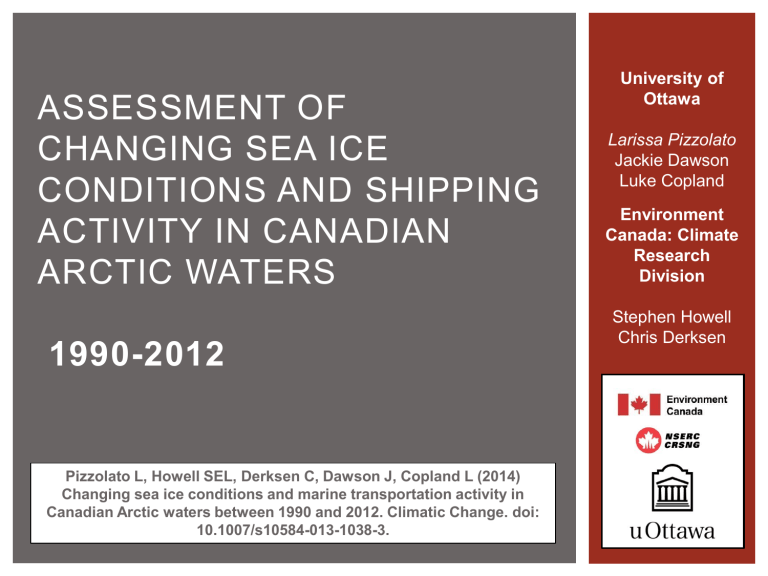 ASSESSMENT OF CHANGING SEA ICE CONDITIONS AND SHIPPING ACTIVITY IN CANADIAN ARCTIC WATERS 1990-2012 Pizzolato L, Howell SEL, Derksen C, Dawson J, Copland L (2014) Changing sea ice conditions and marine transportation activity in Canadian Arctic waters between 1990 and 2012. Climatic Change. doi: 10.1007/s10584-013-1038-3. University of Ottawa Larissa Pizzolato Jackie Dawson Luke Copland Environment Canada: Climate Research Division Stephen Howell Chris Derksen BACKGROUND Sep 1990 Sep 2012 NCEP-NCAR NSIDC, 2013 Maslanik et al., 2011 F U T U R E PR O J EC TIONS: MODELLED SHIPPING INCREASES Two climate forcing scenarios: RCP 4.5 (low – medium) and RCP 8.5 (high) Red: Fastest transArctic routes for Polar Class 6 ships Blue: Fastest transArctic routes for open water ships Smith & Stephenson, 2013 OBJECTIVES 1) Is shipping in the Canadian Arctic increasing? 2) Is sea ice (total ice, MYI, FYI) declining? 3) Is there a connecting between shipping activity and changing sea ice conditions? DATA DESCRIPTIONS Dataset Summary • 1990 to present • 82 555 spatial data records • Vessel name, call sign, IMO number, location • Canadian Ice Service Weekly regional ice charts across the entire Canadian Arctic Surface Air Temperature • NCEP-NCAR monthly SAT means Melt Season Length • Melt Onset, Freeze Onset, Melt Season Length Ships Sea Ice METHODOLOGY Data Acquisition Quality Control Correct for inconsistencies in vessel name, type, location Reclassification of Vessel Type 36 reported vessel types reclassified using AMSA report into 10 categories Regime Shift Detection Rodionov Statistical Regime Shift Detector Trend Analysis Zhang Method, Sen`s Slope of the Tr e n d M o n t h l y, A n n u a l l y, S h i p p i n g S e a s o n Correlation Analysis K e n d a l l ` s Ta u R a n k Correlation REGIME SHIFT DETECTION Step increase in total shipping activity in the Canadian Arctic in 2007 Confidence that change in reporting did not affect shipping dataset ANNUAL SHIPPING TRENDS Annual ship counts are increasing for some vessel types: Bulk Carriers and Passenger Ships 3 vessels decade -1 Government Vessels and Icebreakers and Pleasure Crafts 8 vessels decade -1 MONTHLY SHIPPING TRENDS Total ship increases are observed in some months: June (9 vessels decade -1 ) July (22 vessels decade -1 ) and November (13 vessels decade -1 ) Shipping Trends (Vessels Decade-1) Vessel Type Jun Jul Aug Sep Oct Nov Bulk Carriers 0 -1 0 0 2 1 Fishing Vessels 6 5 13 3 0 5 General Cargo 0 1 1 1 3 3 Government Vessels and Icebreakers 1 3 3 2 4 1 Passenger Ships - 2 2 3 0 - Pleasure Crafts - 1 18 4 0 - Tanker Ships 2 2 0 6 0 1 SHIPPING SEASON SEA ICE JUNE 25 TO OCTOBER 15 a. Total Ice b. MYI -30 (x 103) km2 year -1 c. FYI -11 (x 103) km2 year -1 -19 (x 103) km2 year -1 MONTHLY SEA ICE TRENDS Total Ice area and MYI area is declining in all months of the year (with the exception of Total Ice area in April) FYI area is declining during the summer months Month Trend Ice Area (x 103) km2 year Total MYI FYI Ice January -8 -14 3 February -7 -13 3 March -5 -13 5 April -1 -13 4 May June July -9 -19 -11 -10 1 -5 -34 -14 -19 August -29 -17 -13 September -28 -22 -6 October -27 -23 -3 November -24 -21 -9 December -15 -18 -6 -1 ARE SEA ICE AND SHIPPING ACTIVITY IN THE CANADIAN ARCTIC LINKED? No significant relationships identified outside the months of July through October or for FYI Weak relationships between shipping activity and Total Ice Area ( - 0 . 3 0 t o - 0 . 3 4 ) Stronger relationships identified between MYI Area and shipping activity ( - 0 . 3 0 t o - 0 . 4 4 ) for specific months and vessel types SEA ICE AND SHIPPING ACTIVITY IN RECENT YEARS Strengthening relationship between Total Ice area and MYI area and shipping activity in more recent years. MELT SEASON LENGTH AND SURFACE AIR TEMPERATURE Increasing SAT at a rate of 0.7ºC to 1.8ºC decade -1 Melt Season length + 11 days decade -1 Freeze onset + 8 days decade -1 Earlier melt onset linked to increasing number of Passenger Ships annually Strong link between Total Ice area and: Melt season length Melt onset Freeze onset FUTURE WORK Spatio-temporal changes in shipping activity and sea ice conditions from 1990 to 2012 Identification of regions of increased (or decreased) shipping activity Are regions of increased ship activity also areas of sea ice decline/thinning? SUMMARY Step increase in shipping activity in 2007 Increasing shipping activity for some vessel types annually, and monthly between June and November Evidence of extension of the shipping season into the shoulder seasons of June and November Physical relationships are weak, suggesting other factors (i.e. economics, tourism) play an important role in observed increases shipping activity Strengthening relationship between Total Ice area and shipping activity in recent years University of Ottawa Larissa Pizzolato Jackie Dawson Luke Copland Thank-You! Environment Canada: Climate Research Division Stephen Howell Chris Derksen Pizzolato L, Howell SEL, Derksen C, Dawson J, Copland L (2014) Changing sea ice conditions and marine transportation activity in Canadian Arctic waters between 1990 and 2012. Climatic Change. doi: 10.1007/s10584-013-1038-3.