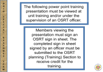 O H I O S P E C I A L R E S P O N S E T E A M The following power point training presentation must be viewed at unit training and/or under the supervision of an OSRT officer. Members viewing the presentation must sign an OSRT sign in sheet. The completed sign in sheet signed by an officer must be submitted to the OSRT planning (Training) Section to receive credit for the training. O H I O S P E C I A L R E S P O N S E T E A M O H I O S P E C I A L R E S P O N S E T E A M Reference: MRA 105-1, Para 1.3.g.ix Radio Communication ASTM f 2209 Para 6.10 Communication Training PowerPoint slide program prepared by Headquarters OSRT06Feb2014 O H I O S P E C I A L R E S P O N S E T E A M Purpose Of Communication Training: • Provide reliable and efficient communication systems in support of the OSRT and civil authorities in response to man-made or natural disasters. • Conduct training in two-way radio operations and procedures, non-radio communications with aircraft, hand signals and whistle communications and landing zone setup for life flight. O H I O S P E C I A L R E S P O N S E T E A M Purpose Of Communication Training: Provide communications needs of the OSRT while following all Federal Communications Commission (FCC) rules and regulations governing two-way radio communications. Conduct training in ground to air symbols, hand and body signals, and aircraft movements when a radio communications link cannot be established between ground and aircraft crews. Conduct training in whistle communications as used in search and rescue. O H I O S P E C I A L R E S P O N S E T E A M Radio Operations and Procedures All FCC rules and regulations are to be followed when using the unit’s two-way radios. Radio communications allow command and control of units in the field. Radios are multi-channel and are programmed with individually assigned frequencies. O H I O S P E C I A L R E S P O N S E T E A M Radio Operations and Procedures • Teams will be issued radios along with channel assignment and their call sign when being dispatched on a mission • FORM 50-15 Temporary Issue Receipt is to be completed as equipment is issued. • Call signs will remain unchanged during the mission unless a change is ordered by the Unit Commander. O H I O S P E C I A L R E S P O N S E T E A M Radio Operations and Procedures • Channels can be changed by request of the net operator or the Unit Commander. • The communications supervisor will be responsible for setting up the communications net. • Each team will be called by the supervisor in turn. • As they respond to their call sign, they will be admitted into the net. O H I O S P E C I A L R E S P O N S E T E A M Radio Operations and Procedures • All radios must be of common type and range. • Radio transmissions can be affected by: Weather Rolling terrain Distance Concrete buildings Power lines Electric generators O H I O S P E C I A L R E S P O N S E T E A M Radio Operations and Procedures • When transmitting on the radio, first make sure you’re on the proper channel, listen to be sure channel is clear of any other transmissions. • If clear, depress the push to talk button and begin speaking clearly, indicating the call sign of the station you want to talk to followed by “this is” and your call sign. O H I O S P E C I A L R E S P O N S E T E A M Radio Operations and Procedures • Once communications are established, complete your message. • Breaks in transmissions are to be followed by the word “over”. • Station receiving and understanding the message responds with the word “roger”. • The last transmission will be followed by the call sign and the word “out”. • Receiving station should ask for a repeat of any part or the entire message, if not understood. Use the words, “say again”. O H I O S P E C I A L R E S P O N S E T E A M Radio Operations and Procedures Use the phonetic alphabet when a word is or may be misunderstood. A Alfa (or Alpha) N November B Bravo O Oscar C Charlie P Papa D Delta Q Quebec E Echo R Romeo F Foxtrot S Sierra G Golf T Tango H Hotel U Uniform I India V Victor J Juliet W Whiskey K Kilo X X-ray L Lima Y Yankee M Mike Z Zulu O H I O S P E C I A L R E S P O N S E T E A M Radio Communications to Aircraft • Give the scene location: • Coordinates: can be cross roads or GPS coordinates (usually in Lat. Long. format) • Landmarks (use N-S-E-W indicators) • Report hazards (wires, towers, buildings, other aircraft, etc.) • Alert Life Flight when you have a “visual” on the helicopter. O H I O S P E C I A L R E S P O N S E T E A M Radio Operations and Procedures • In case of equipment failure or total loss of communications while on a mission, the team leader should designate a member of the team as a runner to return the defective equipment to the command post and exchange it for a good unit. • The communications supervisor will be responsible for taking down the net when the mission is complete. O H I O S P E C I A L R E S P O N S E T E A M OSRT Capabilities • Ohio Special Response Team has purchased several frequencies from the FCC. Our organizational radios have been programed with these frequencies. • Anyone who has a valid Amateur Radio Operator license may also have these frequencies programed into their personal radio if requested, to be used during OSRT business only. O H I O S P E C I A L R E S P O N S E T E A M OSRT Capabilities • Ohio Special Response Team also has at it’s disposal an aircraft radio, which operates on a different frequency, to facilitate communication with aircraft should the need arise. • In addition, we now have a repeater that we can use to boost our output signal to overcome limitations due to terrain and structures. It operates on it’s own frequency. O H I O S P E C I A L R E S P O N S E T E A M Inventory Control • Any known damage to radios or batteries or lost equipment while in the field should be reported to the inventory clerk when being check