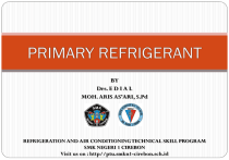 BY Drs. E D I A L MOH. ARIS AS’ARI, S.Pd REFRIGERATION AND AIR CONDITIONING TECHNICAL SKILL PROGRAM SMK NEGERI 1 CIREBON Visit us on : http//ptu.smkn1-cirebon.sch.id PREFACE NORMAL BOILING POINT (NBP) CONTOH NBP BEBERAPA REFRIGERAN! JENIS-JENIS REFRIGERAN Kelompok Halocarbon contohnya R-11 (CCl3F) , R-12(CCl2F2), R22(CHClF2), dll. Kelompok Cyclic Organic contohnya R-C316 (C4Cl2F6), R-C317 (C4ClF7), dan R-C318 (C4F8). Kelompok Azeotropes contohnya R-500 (R-12+R-152a), R-501 (R-22+R12), R-502 (R-11+R-115). Kelompok Hydrocarbon contohnya R-50(methane), R-170 (ethane), R-290 (propane), dll. Kelompok Oxygen contohnya R-610 (Ethyl Ether), R-611(Methyl Formate) Kelompok Sulfur contohnya R-620 Kelompok Nitrogen contohnya R-630 (Methyl amine), R-631 (Ethyl amine). Kelompok Inorganic contohnya R-717 (NH4), R-718 (H2O), R-729 (Udara), R-744 (CO2) dll Kelompok Unsaturated Organic contohnya R-1112a (CCl2==CF2), R1113(CClF==CF2) dll REFRIGERAN DAN MERK DAGANG YANG TELAH BEREDAR DI INDONESIA KODE WARNA REFRIGERAN REFRIGERANT CANE PERTIMBANGAN DALAM MEMILIH REFRIGERAN KRITERIA REFRIGERAN IDEAL FAKTOR THERMOFISIKA FAKTOR THERMODINAMIKA FAKTOR KEAMANAN DAN EFEK TERHADAP LINGKUNGAN FAKTOR THERMOFISIKA DAN THERMODINAMIKA 1. Tekanan suction Refrigeran yang ideal harus memiliki tekanan suction yang tinggi sehingga akan menurunkan compressor displacement. 2. Tekanan discharge Refrigeran yang ideal harus memiliki tekanan discharge yang rendah sehingga akan memungkinkan pemilihan kompresor dan kondensor yang lebih ringan dan murah. 3. Pressure ratio Refrigeran yang ideal harus memiliki pressure ratio yang rendah sehingga akan menaikkan efesiensi volumetric dan penggunaan energy yang lebih sedikit. FAKTOR THERMOFISIKA DAN THERMODINAMIKA 4. Panas latent penguapan Refrigeran yang ideal harus memiliki panas latent penguapan yang tinggi sehingga jumlah refrigeran yang masuk ke evaporator lebih sedikit. 5. Konduktivitas thermal Refrigeran yang ideal harus memiliki konduktivitas thermal yang tinggi pada fasa cair maupun gas sehingga akan menaikkan proses transfer panas. 6. Viscositas Refrigeran yang ideal harus memiliki viskositas yang rendah baik pada fasa cair dan gas untuk mengurangi penurunan tekanan (pressure drop). FAKTOR KEAMANAN DAN EFEK TERHADAP LINGKUNGAN 1. 2. 3. 4. 5. 6. 7. 8. 9. 10. Ozone Depletion Potential (ODP) Global Warming Potential (GWP) Total Equivalent Warming Impact (TEWI) Toxicity Flammability Chemical stability Compatibility Miscibility with lubricating oils Dielectric strength Ease of leak detection 1. Ozone Depletion Potential (ODP) Ukuran potensi perusakan lapisan ozon disebut dengan ODP (Ozone Depletion Potential). Berdasarkan Montreal Protocol, nilai ODP refrigeran seharusnya adalan nol, jadi tiap refrigeran tidak boleh bersifat merusak lapisan ozon. Semakin rendah nilai ODP maka semakin baik sifat refrigeran tersebut dan sebaliknya, semakin tinggi nilai ODP suatu refrigeran maka semakin buruk efek refrigeran tersebut terhadap lingkungan. Berdasarkan hasil penelitian, Chlorine dan Bromine merupakan substan dari refrigeran yang menyebabkan penipisan lapisan ozone. Dengan reaksi di atas, maka 1 atom Cl dapat merusak seratus ribuan atom ozon. Setelah pada tahun 1989 protokol Montreal disetujui, maka pada tahun 1996 jumlah Chlorine di atmosphere turun, namun berdasarkan perhitungan para ahli butuh waktu 50 tahun untuk menentralkan jumlah chlorine pada level yang aman. DAMPAK RUSAKNYA LAPISAN OZONE SKIN CANCER EYES CATARACT 2. Global Warming Potential (GWP) Semakin rendah nilai GWP maka semakin baik sifat refrigeran tersebut karena dengan rendahnya nilai GWP maka efek penggunaan refrigeran tersebut terhadap pemanasan global akan rendah. 3. Total Equivalent Warming Impact (TEWI) Nilai TEWI merupakan gabungan dari efek refrigeran terhadap lingkungan baik itu efek langsung (kerusakan di atmosfer) dan tidak langsung (green house effect) yang berkontribusi terhadap pemanasan global. Suatu refrugeran dengan nilai TEWI rendah nilai akan lebih baik daripada refrigeran yang mempunyai nilai GWP yang rendah. Jadi semakin rendah nilai TEWI maka semakin baik sifat refrigeran tersebut, dan EFFECT OF GLOBAL WARMING Ice is melting worldwide, especially at the Earth’s poles. This includes mountain glaciers, ice sheets covering West Antarctica and Greenland, and Arctic sea ice. Researcher Bill Fraser has tracked the decline of the Adélie penguins on Antarctica, where their numbers have fallen from 32,000 breeding pairs to 11,000 in 30 years. Sea level rise became faster over the last century. Some butterflies, foxes, and alpine plants have moved farther north or to higher, cooler areas. Precipitation (rain and snowfall) has increased across the globe, on average. Spruce bark beetles have boomed in Alaska thanks to 20 years of warm summers. The insects have chewed up 4 million acres of spruce trees. EFFECT OF GLOBAL WARMING Other effects could happen later this century, if warming continues. Sea levels are expected to rise between 7 and 23 inches (18 and 59 centimeters) by the end of the century, and continued melting at the poles could add between 4 and 8 inches (10 to 20 centimeters). Hurricanes and other storms are likely to become stronger. Floods and droughts will become more common. Rainfall in Ethiopia, where droughts are already common, could decline by 10 percent over the next 50 years. Less fresh water will be available. If the Quelccaya ice cap in Peru continues to melt at its current rate, it will be gone by 2100, leaving thousands of people who rely on it for drinking water and electricity without a source of either. Some diseases will spread, such as malaria carried by mosquitoes. Ecosystems will change—some species will move farther north or become more successful; others won’t be able to move and could become extinct. Wildlife research scientist Martyn Obbard has found that since the mid-1980s, with less ice on which to live and fish for food, polar bears have gotten considerably skinnier