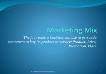 The four tools a business can use to persuade customers to buy its product or service: Product, Price, Promotion, Place Ms. Marshall 6th Year Business 1 Overview of Marketing Mix 1. Brand Name Product 2. Packaging 3. Product Life Cycle Ms. Marshall 6th Year Business 2 Brand Name For this topic you will need to know the definition, the benefits, and some examples of global brands. Branding means creating an identity for a product that makes it easily identifiable and clearly distinguishes it from competitors. It usually consists of a brand name and logo. E.g. McDonald’s and their Golden Arches. Ms. Marshall 6th Year Business 3 Recognition Bargaining Tool Desire Advantages of Branding Higher Price Loyalty Ms. Marshall 6th Year Business 4 Benefits of Branding 1. Recognition: Branding improves recognition of the product and the business name and differentiates them from competitors. This makes it easier to advertise a particular product. It is cheaper and easier to launch new products if they are associated with an existing well-known brand name. e.g. Johnson’s & Johnson’s would be best known for baby care products but have diversified into products for adults too. 2. Desire: Branding helps to promote a desired image of a product to the target market. E.g. J&J look after sensitive skin… Ms. Marshall 6th Year Business 5 Benefits of Branding 3. Loyalty: Easy recognition and familiarity to consumers increases sales and promotes long-term customer loyalty. Brand loyalty occurs when customers repeat-purchase a particular product on a regular basis. They stick with the product even when the price goes up, which helps defend against price wars with competitors. E.g. Coca-Cola has a high level of brand loyalty in the soft drinks market. 4. Higher Price: Businesses can charge a higher price, thus increasing profits. Many customers perceive branded goods to be of better quality than own brands so they are willing to pay more. E.g. you would pay more for Coca-Cola than Tesco Cola Ms. Marshall 6th Year Business 6 Branding- Benefits 5. Bargaining tool: Branding can be used as a bargaining tool against retailers. Businesses can get a good price from shops for their goods because they know customers expect the product to be in stock. Pepsi and Coke will often enter into contracts whereby if you stock one you cannot stock the other, e.g. Coke and Mc Donald’s. Ms. Marshall 6th Year Business 7 Own Brands Own Brands: brand names which are registered by retailers rather than manufacturers, e.g. Dunnes Stores (Savida) to put on products which are for sale exclusively in their shops. Benefits of own brands Retailers benefit from cheaper products which helps to attract extra customers. Consumers benefit from lower prices and a greater choice of products. Producers benefit from extra sales which are achieved with lower manufacturing and marketing costs. Drawback – lower profit margin Ms. Marshall 6th Year Business 8 Packaging Packaging involves designing and making the container or wrapper for the product. Functions of Packaging: Protection: products must be protected from damage as they change hands through the channel of distribution. E.g. Tetra Pak makes sure liquids do not spill. Image: packaging should look good to encourage consumers to buy the product. Design has been referred to as “the silent salesperson” because it can strongly influence sales. E.g. Pepsi carefully researched packaging for Pepsi Max. Research showed that red, blue and silver were the most appealing combination to the young male market. Ms. Marshall 6th Year Business 9 Packaging Information: the packaging often contains information on the use of the product or the ingredients. E.g. most food products now display the calorie content on the box. Convenience: it is used to make the product a convenient size or shape for the consumer. E.g. 2 litre bottle of coke for home, 500 ml for carrying around. Protecting Product Design Patent: provides legal protection of an invention or a design of a product to the inventor or designer. Trademarks: are logos that are registered by businesses to distinguish them and their products from competitors. Ms. Marshall 6th Year Business 10 Product Life Cycle The Product Life Cycle charts the six stages of a product’s sales over time. Ms. Marshall 6th Year Business 11 Product Life Cycle 1. Development: much time will be spent designing and testing the product concept. A prototype will often be test-marketed, in order to assess the potential sales and profitability of the new product. A decision will then be made whether or not to launch the product based on the market research conducted. The business will, therefore, incur many expenses during the development stage of the product lifecycle and the product will produce a large, negative cashflow. 2. Introduction: this is when the product is first launched. Sales grow very slowly and large amounts must be spent on advertising and promotion. Companies usually are making a loss at this stage. Price Skimming may occur. 3. Growth: The product becomes known and sales and profits begin to increase rapidly. New competition enter the market at this stage. Ms. Marshall 6th Year Business 12 Product Life Cycle 6. Decline: Sales of the product fall 4. Maturity: The rate of sales growth slows. Sales of the product are at their highest rate. The business is making large profits. There is intense competition. off rapidly. This could be due to advances in technology, a change in consumer tastes or increased competition. E.g. Walkman replaced by Discman replaced by MP3 Players and Ipod’s… 5. Saturation: Sales growth stops and sales remain at their peak for some time. The market is now full of similar products. To maintain sales businesses will cut their price or update the product. Ms. Marshall 6th Year Business 13 Extension Strategies Product Development Strategies: seek to modify and revamp the existing product to make it more appealing or to develop the num