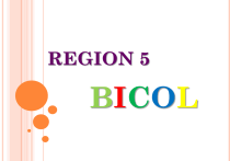 REGION 5 BICOL GEOGRAPHICAL LOCATION OF BICOL REGION THE TOTAL LAND AREA OF BICOL REGION IS 17,632.5 KM2 (6,807.9 SQ MI) OR 5.9% OF THE TOTAL LAND AREA OF THE COUNTRY. CAMARINES SUR IS THE LARGEST PROVINCE OCCUPYING 5,266.8 KM2 (2,033.5 SQ MI) OR AROUND 30% OF THE TOTAL, WHILE CATANDUANES IS THE SMALLEST WITH ONLY 1,511.5 KM2 (583.6 SQ MI) OR 8.6% OF THE TOTAL. OF THE REGION'S TOTAL LAND AREA, AROUND 71% IS ALIENABLE AND DISPOSABLE WHILE THE REMAINING 29% IS PUBLIC FOREST AREAS. THE REGION IS BOUNDED BY LAMON BAY TO THE NORTH, PACIFIC OCEAN TO THE EAST, AND SIBUYAN SEA AND RAGAY GULF TO THE WEST. THE NORTHERNMOST PROVINCE,CAMARINES NORTE, IS BORDERED TO THE NORTH BY THE PROVINCE OF QUEZON, THEREBY CONNECTING THE REGION TO THE REST OF LUZON. OUR LADY OF PEÑAFRANCIA “QUEEN PATRONESS BICOLANDIA” OF THE REGION RETAINS ROMAN CATHOLICISM AS THE OVERWHELMING RELIGION OF THE GREAT MAJORITY. THE CATHOLIC RELIGION HAS THE HIGHEST NUMBER OF FOLLOWERS THAN ANY OTHER AREA IN THE PHILIPPINES. FIESTAS (FEAST DAY OF SAINTS) ARE ANNUAL CELEBRATIONS OF PARISHES, FROM A SIMPLE BARRIO FIESTA HONORING A PATRON ASSOCIATED FOR GOOD HARVEST, TO A TOWN FIESTA HONORING A MIRACULOUS SAINT, OR A REGIONAL ONE SUCH AS THE OUR LADY OF PEÑAFRANCIA FIESTA, A WEEK-LONG CELEBRATION TO HONOR THE VIRGIN MARY, DUBBED AS THE "QUEEN PATRONESS OF BICOLANDIA". IT IS WIDELY ACKNOWLEDGED THAT IN LUZON, IT IS BICOL REGION THAT HOLDS THE MOST NUMBER OF MEN ENTERING THE SEMINARY FOR CATHOLIC PRIESTHOOD, OR WOMEN ENTERING THE RELIGIOUS LIFE TO BECOME CATHOLIC NUNS. Legazpi City is the capital. The province is surrounded by the province of Camarines Sur and Sorsogon north to south. In northeast towards the Gulf of Lagonoy Philippines Seaand south-west is the Burias Pass. Cities: LEGAZPI LIGAO TABACO Towns: BACACAY CAMALIG DARAGA GUINOBATAN JOVELLAR LIBON MALILIPOT MALINAO MANITO OAS PIO DURAN PALANGUI RAPU-RAPU SANTO DOMINGO TIWI Daet is the capital. Extends the boundaries of the province of Quezon and Camarines Sur in the west to the south. Towns: Basud Paracale Capalonga San Lorenzo Ruiz (Imelda) Daet San Vicente Jose Panganiban Santa Elena Labo Talisay Mercedes Vinzons Pili is the Capital. It is located in the north of Camarines Norte and Quezon then Albay in the south. At its eastern province of Catanduanes meetings across the MaquedaChannel. Cities: Iriga Naga Towns: Baao Balatan Bato Bombon Buhi Bula Cabusao Calabanga Camaligan Canaman Caramoan Del Gallego Gainza Garchitorena Goa Lagonoy Libmanan Lupi Magarao Miloar Minalabac Nabua Ocampo Pamplona Pasacao Pili Precentacion Ragay Virac - the capital and center of commerce. The town of Pandan is in the far north of the island. Towns: Bagamanoc Baras Bato Caramoran Gigmoto Pandan Panganiban (Payo) San Andres (Calolbon) San Miguel Viga Virac Municipalities: Barcelona Bulan Bulusan Casiguran Castilla Donsol Gubat Sorsogon Citycapital and surrounded by the province of Albay to the north. At theend of Tanway Sorsogon Bicol and Samar islands facing southeast across the Strait of San Bernardino. Irosin Juban Magallanes Matnog Pilar Prieto Diaz Santa Magdalena Its capital is Masbate City and consists of three major islands: Masbate, Ticao and Burias. Cities: Aroroy Baleno Balud Batuan Cataingan Cawayan Claveria Dimasalang Esperanza Mandaon Milagros Mobo Monreal Palanas Pio V. Corpuz (Limbuhan) Placer San Fernando Mayon Volcano, also known as Mount Mayon, is an active volcano in the province of Albay, on the island of Luzon in the Philippines. Renowned as the "perfect cone" because of its almost symmetric conical shape, Mayon forms the northern boundary of Legazpi City, the largest city in terms of population in the Bicol Region. The mountain is a national park and a protected landscape in the country proclaimed as as Mayon Volcano Natural Park in the year 2000. Local folklore refers to the volcano as Bulkang Magayon (Bikol: 'Beautiful Volcano'), after the legendary heroine Daragang Magayon (Bikol: 'Beautiful Lady') Mayon Volcano is the main landmark of Albay Province, Philippines, rising 2,462 metres (8,077 ft) from the shores of the Gulf of Albay about 10 kilometres (6.2 mi) away. The volcano is geographically shared by the cities and municipalities of Legazpi City, Daraga, Camalig, Guinobatan, Ligao City, Tabaco City, Malilipot, and Santo Domingo (clockwise from Legazpi) which divide the cone like slices of a pie when viewed from above. •Mount Isarog is the closest to Naga City. •Mount Iriga with its large horse-shaped crater with Lake Buhi in the foreground •The geothermal field of Tiwi on the eastern slope of Mount Malinao •The extinct volcano of Mount Masaraga •The active cone of Bulusan Volcano, the southernmost volcano of the region, located on the remains of the Irosin Caldera Nag-agui si Tarzan, nagbukas an dalan -siper Sa ibabaw kapatagan, sa irarom kakahuyan -posporo Bakong hayop, bakong tawo, peru nagtataram -radyo * * Ibalon The Legend of Mayon Volcano * Scents of Apple by Bienvenido Santos Scents of Apple by Bienvenido Santos When I arrived in Kalamazoo it was October and the war was still on. Gold and silver stars hung on pennants above silent windows of white and brickred cottages. In a backyard an old man burned leaves and twigs while a gray-haired woman sat on the porch, her red hands quiet on her lap, watching the smoke rising above the elms, both of them thinking the same thought perhaps, about a tall, grinning boy with his blue eyes and flying hair, who went out to war: where could he be now this month when leaves were turning into gold and the fragrance of gathered apples was in the wind? It was a cold night when I left my room at the hotel for a usual speaking engagement. I walked but a little way. A heavy wind coming up from Lake Michigan was icy on the face. If felt like winter straying early in the northern woodlands. Under the lampposts the leaves shone like bronze. And they rolled on the pavements like the ghost feet of a thousand autumns long de