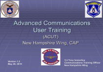 Advanced Communications User Training (ACUT) New Hampshire Wing, CAP Version 1.3 May 26, 2010 1Lt Tony Immorlica Communications Training Officer New Hampshire Wing 1 Advanced Communications User Training (ACUT) CAP communication systems: standards and rationale Radio Basics: Familiarity with different radio modes (e.g. AM, FM, SSB) Radio Propagation and Frequency Bands (i.e. HF, VHF) Repeater Basics: Operation, use and restrictions Radio Operation – Model specific overview Calling Procedures Formal message preparation and handling Network operating procedures It is assumed the student has read and is familiar with CAPR 100-1 and 100-3 2 ACUT Completion and Credit Prerequisite for this course: BCUT Successful completion of the ACUT requires passing an open book test: Working knowledge of CAPR 100-1 and 100-3 is assumed A passing score is 80%, corrected to 100%. No documentation is issued Trainee records accomplishment in personnel record [CAPF 45 or CAPF 66] Instructor notifies Wing Licensing Officer of those successfully completing ACUT training 3 CAP Radio Operator Authorization Authorization is currently done in two phases: 1. Basic Communications User Training - BCUT 3-4 Hour Class on: Standard Operating Procedures Local Operating Procedures Entitles CAP member to operate a CAP Radio Issued a CAPF 76, Radio Operator Authorization by Wing or higher headquarters 2. Advanced Communications User Training - ACUT 4-5 Hour Class Pass the Advanced Communications User Test Entitles CAP member to be assigned a call sign Required as part of the Communications Specialty Track NOTE: BCUT and ACUT will soon be replaced by a new Introductory Communications Users Training [ICUT] course; release date is pending 4 Operation of CAP Radio Stations by Unauthorized Personnel The operation of all CAP Radio Stations must be under the direct supervision of a properly authorized Civil Air Patrol radio operator. Pilots/co-Pilots must have taken BCUT training as a minimum to operate CAP VHF radios 5 CAP Radio Station Licensing CAP is considered a federal agency, thus its Radio Stations are licensed by the National Telecommunications and Information Administration (NTIA) Public stations are licensed by the FCC Federal agencies are not allowed to use services allocated exclusively to the public sector for their business. This excludes the use of Amateur Radio and Citizens Band for CAP business. The regulation for all CAP Communications is CAPR 100-1 6 Assigned Call Signs Calls assigned to Individuals Call signs associated with Resources Aircraft Ground Vehicles Headquarters Tactical Call Signs 7 Aircraft Call Signs CAP corporate aircraft will use “CAP xxxx” (ex. CAP 2869 pronounced “CAP twenty-eight sixtynine”) at all times. Member-owned aircraft may also use the CAP call sign when on reimbursable missions. Flight Plans. The three-letter identifier “CAP” is used within the FAA computer system in place of the spoken word “CAP.” For this reason, “CAP_______” will be used in place of the aircraft tail number on flight plans. In the remarks section, the voice identifier “CAP________” must be included as well as the tail number of the aircraft. 8 CAP Radio Tactical Call Signs At Certain Special Activities functional call signs may be approved by the commander of the activity. These would include SAR/DRA missions Encampments Incident Command System (ICS) operations 9 ES Mission Communications Communicators are needed for nearly all ES missions in CAP, both SAR and DR. Scheduled radio check-in procedures Sending a position report Reporting a clue or a find Additional training is required to achieve a Radio Operator emergency services rating. 10 Out of Wing Operation Operation of mobile stations outside of the wing in which they are licensed is permitted. Operation on CAP frequencies in Canada and Mexico is prohibited. Special limitations apply within 75 miles of the Canadian border Check with the Director of Communications before operating radios in those areas 11 Communicating with Other Agencies Interagency operation on Non-CAP Frequencies CAP stations operating on non-CAP frequencies must have written authorization from the licensed agency. The radio must meet all requirements for use in that band under FCC or NTIA Some agencies are requiring that we use encryption A copy of the FCC license or the federal authorization must also be obtained. 12 Interagency Operations • CAP has Memorandums of Understanding (MOU) with a number of agencies On file at National Headquarters – – – – AF MARS, American Red Cross, Salvation Army, US Coast Guard Auxiliary On file at NH Wing Headquarters – NH Office of Emergency Management – NH National Guard – NH Fish and Game Frequencies for Interagency Operation are programmed into CAP Radios as appropriate – see Channel Plans 13 Concept of Operations CAP communications relies heavily on VHF-FM (very high frequency-frequency modulation) because VHF provides excellent, dependable, short-range communications. VHF is readily adaptable to ground and air mobile operations. We are developing digital voice and encryption options that may be used in this mode. CAP is also licensed to operate on specific HF (high frequency) bands, and utilizes Single sideband modulation (SSB). This affords long distance, even world-wide contacts – but is highly dependent on frequency and atmospheric conditions Aircraft radios operate on 118 to 137 MHz using Amplitude Modulation (AM). Radio certificates are issued through the FAA Standardized National Channelization and Programming Plan VHF-FM operations by CAP is governed by the Standardized National Channelization and Programming Plan that has been mandated in the CAPR 100-1. Compliance with this plan is mandatory for all corporate radios. All CAP assigned radio frequencies are designated “For Official Use Only” CAP Assigned Frequencies: FOUO For Official Use Only What FOUO isn’t What is FOUO A designation that ther