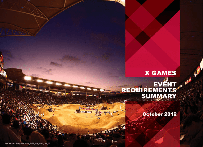 X GAMES EVENT REQUIREMENTS SUMMARY October 2012 GXG Event Requirements_RFP_d5_2012_10_03 X GAMES EVENT REQUIREMENTS INTRODUCTION Event requirements are based on hosting an entire X Games event. ESPN will contact all interested cities to discuss city/entity proposals and hosting options. CONTENTS • Management o Local Organizing Committee & Staffing • Facilities o Sport Course Space Requirements & Other Facilities • Services & Equipment GXG Event Requirements_RFP_d5_2012_10_03 2 MANAGEMENT LOCAL ORGANIZING COMMITTEE & STAFFING 3 GXG Event Requirements_RFP_d5_2012_10_03 MANAGEMENT Local Organizing Committee: • Executive Management - Key executives responsible for Event Management, Commercial Operations, Business Operations, Facility Management. Interface with ESPN Event Teams. • Functional Areas - Sports & Competition*, Medical, Logistics, Event Production, Event Operations, Safety, Security, Sustainability, Information Technology, Sponsorship Management, Event Marketing, Event Merchandise Sales, Content Strategy*, TV Production & Operations*, Media Relations, Finance & Administration, Transportation, Accommodations, Food & Beverage. * ESPN responsibility Staffing: • Event Staffing: Provide sufficient number of permanent, temporary, and volunteer staff to plan, organize, and manage the event. GXG Event Requirements_RFP_d5_2012_10_03 4 FACILITIES SPORT COURSE SPACE REQUIREMENTS & OTHER FACILITIES GXG Event Requirements_RFP_d5_2012_10_03 5 FACILITIES Sport Course Space Requirements: Moto X, Rally Car Traditional summer sports - Skateboard, BMX Freestyle, See Sample Maps page 12 & 13 Skateboard/BMX Vert Key Dimensions Street 100’ x 100’ (30m x 30m) Park 150’ x 180’ (46m x 55m) smooth, flat concrete surface footprint Prefabricated Ramp with Key Features 11.5’ (3.5m) transitions and 2’ (.6m) vert, riders flow wall to wall combining lip tricks and big air Custom built concrete plaza that includes a combination of stair sets, banks, and ledges 100’ x 150’ (30m x 45m) footprint Custom built concrete park that includes smooth bowls with hips, gaps, flats and ledges to provide a smooth transition based course Big Air 60’ x 370’ (85’h clearance), 18.3m x 113m (26m h clearance) 60’-80’ (18.3m-24.5m) high roll-in, choosing to launch over a gap 50 or 70 feet long (15.25m - 21.5m) and continuing into a 27 foot (8.25m) quarter-pipe Moto X Step Up Key Dimensions Key Features 50’ x 200’ (15.25m x 61m) indoor arena Course consists of a short run in, vertical dirt ramp and an adjustable high bar Best Trick/Best Whip 50’ x 300’ (15.25m x 91.5m) indoor arena Freestyle/Speed & Style/ Racing/Enduro 300’ x 400’ (91.5m x 122m) outdoor stadium Course consists of a dirt landing with metal take off ramps. Riders hit a single ramp and perform maneuvers such as body variables, back flips and combo tricks Course consists of multiple dirt jumps & metal ramps of varying lengths and angles Rally Car Racing/RallyCross Key Dimensions 1,000’ (305m) dirt track, 3,000’ (915m) asphalt track Key Features Course on asphalt and dirt roads featuring high speed straight-a-ways, technical turns and large dirt gap jump Sports are not limited to the above. 6 GXG Event Requirements_RFP_d5_2012_10_03 FACILITIES - continued Sport Course Space Requirements: Traditional winter sports - Snowboard, Skiing, Snowmobile. Rally Car to be included at future winter events. Snowboard/Ski* Big Air Key Dimensions Key Features Length: 245 meters Vertical Drop: 75 meters Jump/Kicker Large Landing X Course Length: 1,335 meters Elevation: 2,651 meters Vertical Drop: 210 meters Slopestyle Length: 670 meters Verical Drop: 105 meters Jumps Banked Turns Rollers Gaps Rails Kickers Jumps Gaps SuperPipe Length: 172 meters Width: 20 meters Height: 18-degree pitch Competition Quality Lighting Snowmobile* Snocross/Freestyle Key Dimensions Total area of 13,680 sq meters Key Features Flat to moderate (beginning skier) terrain with jumps, rollers, gaps Rally Car Racing/RallyCross Key Dimensions 4,000’ (1,220m) snow/ice track Key Features Course on snow, ice, track featuring high speed straight-a-ways, technical turns and large dirt gap jump Sports are not limited to the above. *Snow-covered alpine ski trails in close proximity to each other and the base area GXG Event Requirements_RFP_d5_2012_10_03 7 FACILITIES - continued Other Facilities: • Venues: Multiple venues to accommodate 5,000 to 20,000 spectators. Amenities to include restrooms, concessions, parking, security, etc. (Access to venues is needed for four to six weeks in total, from course load-in to load-out). Competition: Venues to accommodate Course Space Requirements (see slide 6, 7). Cultural Elements: Venues to conduct cultural elements in music, style, and film. • Compounds: TV (250m x 130m), Logistics, Vendor, Rally, and Moto equipment & storage locations (50m x 50m each). One (1) area (25m x 25m) for Sponsor equipment and storage • Offices & Meeting Rooms: Sufficient climate-controlled work space and office equipment for 300 event & TV staff, 30 vendors. • Media Center: Location for Press Conferences and sufficient office equipment, work space, and hospitality for 200 accredited media. • Hospitality Space: Sufficient, climate-controlled lounge and catering facilities for Sponsors/VIPs (200), Athletes/Team Managers (560), Podium Club (200), Suite Guests (varies). • Staff Catering: Climate-controlled dining and kitchen facilities to serve 1,000 meals/day. • X Fest: 60m x 60m interactive sponsor village. • Parking: 420 total reserved parking spaces – 400 vehicle spaces and 20 truck spaces. 4,000 parking spaces for spectators. • Vehicle and Equipment Access: Required from the back of house staging areas to the competition courses at each venue. • Accommodation: Staff: 275 single occupancy hotel rooms at peak (minimum 3 star). Average 7 nights totaling 4,000+ room nights, over a 6 week period. VIP: 100 single occupancy hotel rooms at