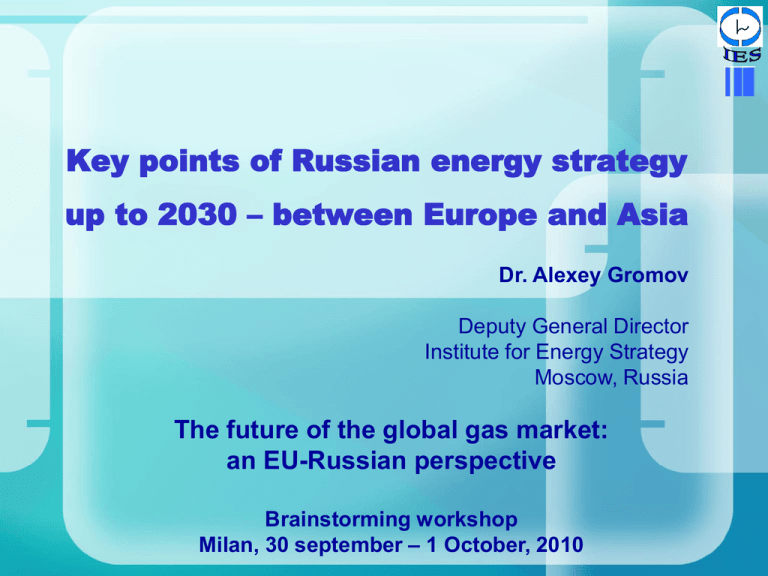 Key points of Russian energy strategy up to 2030 – between Europe and Asia Dr. Alexey Gromov Deputy General Director Institute for Energy Strategy Moscow, Russia The future of the global gas market: an EU-Russian perspective Brainstorming workshop Milan, 30 september – 1 October, 2010 Energy Strategy 2030 in the System of Documents of the Strategic Development Long-term forecast of the development of Russian economy for the years 2009-2030 Conception of the long-term development of the Russian Federation for the year 2020 ES-2030 General scheme of development of the gas industry for the year 2030 Eastern Gas Program General scheme of allocation of power generating facilities for the year 2020 General scheme of development of the oil industry for the year 2030 Conception of the state program for exploration and exploitation of the continental shelf of the Russian Federation Investment programs of Program of longterm development of the fuel and energy complex of the Russian Far East State program of energy saving Strategy of development of the power generation in the Russian Far East energy companies 2 ENERGY STRATEGY 2030 approved by decree N° 1715-r of the Government of the Russian Federation of 13.11.2009 1ST STAGE Share of Energy sector in Economy 2009 2ND STAGE 2013 2015 3RD STAGE 2020 2022 2030 Overcoming the crisis in the Economy and Energy sector Modernization of Energy sector Increase of power efficiency and energy saving in the Economy and Energy sector Innovative development of Energy sector New oil and gas fields development (Arctic shelf, Eastern Siberia and the Far East) Highly effective use of traditional power resources Switch to the Energy of the Future Growth of national economy and quality of life of the population 2 Foreign energy policy and ES-2030 targets: Eastern and Western vectors Western Vector (European Market) Eastern Vector (Asian-Pacific Market) Russian Gas Export, 2009 Russian Gas Export, 2030 (projected) - EU market is essential for Russian gas export (75%) - Western Vector accounts for 96% of Russian gas export (EU + other Europe) - Russia seeks for export diversification - Russia promotes eastern vector of energy export 3 Eastern Vector for Russian Energy Policy 4 EASTERN VECTOR IN ES-2030: NEW SIDES OF “OLD” TASK Road Map of implementation of ES-2030 : Eastern vector Eastern vector task №19 «Increase in the share of the Asia-Pacific countries in the structure of the Russian energy export to 16– 17%» task №10 «Implementation of a complex of program measures for petrochemistry and gas-chemistry development in the Eastern Siberia and Far East» task № 17 «Extended reproduction and attraction of human resources for development of new areas of the Eastern Siberia and Far East» Key initiatives in the Russian energy sector: Eastern vector Energy infrastructure: development and diversification ESPO pipeline, Eastern Gas Program, petro- and gas-chemistry development Development of oil and gas complexes in Eastern regions of Russia Sakalin, Yakutia, Magadan, Irkutsk and Krasnoyarsk regions Exploitation of the oil and gas potential of the Northern regions of Russia and Arctic shelf Non-fuel energy Energy saving Shelf of the East Arctic, reanimation of the Northern Sea Way Large-scale development of hydro energy and renewables Modernization of electric power and heat supply systems in the Region 5 THE EAST IS A KEY DIRECTION OF DIVERSIFICATION OF THE RUSSIAN EXPORT Forecast of gas export 400 Gas export in Asia-Pacific region, % of total export 353-390 336-359 350 300 55 310-311 100 80 250 60 40 200 20 0 256,0 bcm 7075 24-36 189194 201 88-90 8792 7892 1st Stage 2nd Stage 3rd Stage 159,8 158168 95,8 2005 150 19-20 0 2005 2030 100 50 0 Europe Asia-Pacific итого 6 KEY PROJECTS IN THE EASTERN SIBERIA AND THE FAR EAST Eastern Gas Program Natural gas Export to China Sakhalin development LNG Projects in Sakhalin 7 FIRST RESULTS OF ES-2030: CAREFUL OPTIMISM 2008 2009 Strategic Indicator for the first stage of ES-2030 (2013-2015) Share of Eastern Siberia and the Far East in gas production 2% 3,7% 7-8% LNG share in gas export 0% 3,5% 4-5% Share of the countries of the AsiaPacific Region in the structure of gas export 0% 3,5% 11-12% 8 Western Vector for Russian Energy Policy 9 WESTERN VECTOR IN ES-2030: KEY PROJECTS & GOALS Nord Stream (started in April 2010) task №19 Increase the Russian gas export to European market 160 bcm in 2008 120 bcm in 2009 2030 target - 200 bcm task №21 Promote the gas pricing system in Europe, including both long-term and spot contracts task № 22-23 Bilateral investment in gas projects South Stream (projected) Shtokman (projected) 10 DISTURBING RESULTS OF 2009 ON EUROPEAN GAS MARKET 700 664,9 675 12% 250 650 225 625 583,6 583,9 195,4 200 575 млрд. куб. м млрд куб. м 600 550 525 500 168,3 175 158,4 24% 150 475 125 450 120,3 425 100 400 2000 2001 2002 2003 2004 2005 2006 2007 2008 2009 годы Gas production (Russia) Добыча газа в РФ, всего 2000 2001 2002 2003 2004 2005 2006 2007 2008 2009 Экспорт дальнее зарубежье Exportв to Europe Экспорт, Export всего (total) (GAZPROM) ВGas т.ч.production Группа Газпром Gas production has fallen to level of 2000 Gas export to Europe was reduced to a quarter 11 LONG-TERM EXPORT DYNAMICS & REASONS Composition of EU gas import Source: EEGA Factors of decrease in export expectations Price situation in 2009 Price, USD/bcm Europe: Competition growth (LNG, new pipelines) Pricing change (spot market vs. long-term contracts) Russian gas (long-term contracts, Europe) 288 LNG (US, Henry Hub) 147 Renewables & energy efficiency LNG (Great Britain, NBP) 142 Geopolitics (Nabucco, anti-Gazprom rules in 3rd Gas Directive etc.) LNG (Japan, Korea) 260 LNG (Chine) 160 12 Conclusions 9 bcm EXPORT EXPECTATIONS VS. REALITY 400 Russian Gas Export forecast up to period 2030 375 368 350 349 Europe: Competition growth 300 US: