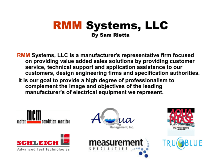 RMM Systems, LLC By Sam Rietta RMM Systems, LLC is a manufacturer's representative firm focused on providing value added sales solutions by providing customer service, technical support and application assistance to our customers, design engineering firms and specification authorities. It is our goal to provide a high degree of professionalism to complement the image and objectives of the leading manufacturer's of electrical equipment we represent. Have you ever lost a motor? • • • • • Caused a loss of production? After a storm? Same motor over and over again? While you were away from the plant? Something happened on the power company side. • Didn’t know why? Why Do Motors Fail? Common Causes of Motor Failures Costs Associated with Motor Failures • • • • • • Equipment downtime $$$$ Loss of production Collateral equipment damage Equipment replacement Work in process damage Overtime for repair crews Motor Windings Breakdown • Thermal • Mechanical • Environmental Thermal Breakdown • Rule of thumb: A 10o C temperature rise above rated temperature will half the life of a motor • Motor operating temperature is based on: • 40o C ambient temperature • Class B Insulation limit is 130o C • Class F Insulation limit is 155o C Thermal Breakdown Causes: • Overload • Voltage Variations • Single Phasing • Short Cycle • Lightning and Surges • Improper Ventilation • Dirt & Dust Accumulation Mechanical Breakdown Causes: • Bearing failure resulting in rotor or stator rubbing insulation off • Vibration • Improper Alignment Bearing Failure Causes • Improper lubrication • Excessive belt tension • Mis-alignment Environmental Breakdown Causes: • Moisture / Water • Corrosion/ Chemicals • Rodents & Insects • Age Causes of Motor Failures Overcurrent 30% Mechanical 44% Other 12% 44 % of all motors failures are due to overloads and Single Phasing single-phasing. 14% Why Motors Fail... Bearing Failures 13% Rotor Failures 5% Contaminants 19% Misc 9% Old Age 10% Overload 30% Single Phasing 14% * Based on 9,000 failure events researched by the Electric Motor Manual which was written by Robert Lawrie in conjunction with the staff at Electric Construction and Maintenance Magazine. Number One Motor Failure… Overload! Overload 30% Overloads “ It is practically impossible to burn out a motor from overload when it is protected by properly sized and maintained motor protection devices”. William P. Maples, P.E. Motor Protection Device % FLA Overloads Fuses (Dual Element) Fuses (Fast Acting) Circuit Breakers MCP 115% 125%-225% 400%a 400%b 800%-1700% NEC 430-32,52 A 300% FLA for non time delay fuses exceeding 601 amps B 300% FLA for inverse time circuit breakers for motor FLA exceeding 100 amps Motor Service Factor Motor service factor of 1.15 means that the temperature rise of a motor will not exceed design temperature even if the motor is carrying a continuous overload of 15% U.L and IEC Test Procedures • U.L. 508 Determines test procedures for motor starters. • U.L. Short Circuit test procedures – Starter door cannot be blown open – Contacts must not disintegrate – Overload burnout is allowed with breaker tests. Short Circuit Protection of Motor Controllers Motor Controller HP Rating Test Short Circuit Current Available 1 HP or less and 300V or less 1,000 A 50 HP or less 5,000 A Greater than 50 HP to 200 HP 10,000 A 201 HP to 400 HP 18,000 A IEC Standards • IEC Publication 947 “Low Voltage Switchgear and Control” IEC Levels of Motor Starter Protection • Type 1 Protection. – No discharge of parts beyond the enclosure is allowed – Damage to the contactor and overload relay is acceptable IEC Levels of Motor Starter Protection • Type 2 Protection. – No damage is allowed to either the contactor or overload relay – Light contact welding is allowed, but must be easily separable Voltage • Voltage Variations • Phase imbalance • Phase loss (Single Phasing) Voltage Variation Nema Standards states that motors shall operate successfully at rated load under the following conditions: • +/- 10% variation of rated voltage at rated frequency • Any voltage drop below 10% will reduce starting torque which can be serious because starting times may increase beyond allowable limits. Winding failure from extreme voltage variations are identical to those of overloads because the input current is uniformily excessive. • Low Voltage… Cause • Demand for power is greater than the supply • Long cable runs • Overloaded transformers • Distribution system Low Voltage… Effect • Reduced efficiency • Reduced life expectancy • Increased temperatures • Increased current • Lower torque High Voltage… Definition Operating a motor above 110% of nameplate voltage High Voltage… Cause • Poor line regulation • Incorrect transformer tap • Utility demand down High Voltage… Effect • • • • • Reduced efficiency Reduced power factor Increased power consumption Increased current Increased temperature Voltage Unbalance Percent voltage unbalance = 100 x Maximum voltage deviation from average voltage average voltage Voltage Unbalance example: Assume voltages to a motor are 228 V to Phase A, 220V to Phase B and 236 V to Phase C. The average voltage is 228 V. The voltage unbalance is as follows: Voltage imbalance = 236-228 x 100 = 3.5% 228 Effect of Voltage Unbalance on Motor Longevity Effects of Voltage Unbalance Horsepower Derating Another Rule of Thumb…………. A 3.5% voltage unbalance will cause a 25% temperature rise. An increase in temperature rise in the phase with the highest current is 2 times the square of the voltage imbalance Causes of Voltage Unbalance: • • • • • • • Unequal loading of a three phase system Unequal tap settings on transformers Loose connections in the power system Damaged starter contacts Open delta transformer systems Storms (wind, fallen trees, lightning) Poor regulation by