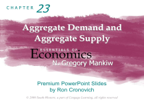 CHAPTER 23 Aggregate Demand and Aggregate Supply Economics ESSENTIALS OF N. Gregory Mankiw Premium PowerPoint Slides by Ron Cronovich © 2009 South-Western, a part of Cengage Learning, all rights reserved In this chapter, look for the answers to these questions: What are economic fluctuations? What are their characteristics? How does the model of aggregate demand and aggregate supply explain economic fluctuations? Why does the Aggregate-Demand curve slope downward? What shifts the AD curve? What is the slope of the Aggregate-Supply curve in the short run? In the long run? What shifts the AS curve(s)? 1 Introduction Over the long run, real GDP grows about 3% per year on average. In the short run, GDP fluctuates around its trend. Recessions: periods of falling real incomes and rising unemployment Depressions: severe recessions (very rare) Short-run economic fluctuations are often called business cycles. AGGREGATE DEMAND AND AGGREGATE SUPPLY 2 Three Facts About Economic Fluctuations FACT 1: Economic fluctuations are irregular and unpredictable. 14,000 12,000 10,000 U.S. real GDP, billions of 2000 dollars 8,000 6,000 4,000 The shaded bars are recessions 2,000 0 1965 1970 1975 1980 1985 1990 1995 2000 2005 2010 3 Three Facts About Economic Fluctuations FACT 2: Most macroeconomic quantities fluctuate together. 2,500 2,000 Investment spending, billions of 2000 dollars 1,500 1,000 500 0 1965 1970 1975 1980 1985 1990 1995 2000 2005 2010 4 Three Facts About Economic Fluctuations FACT 3: As output falls, unemployment rises. 12 10 Unemployment rate, percent of labor force 8 6 4 2 0 1965 1970 1975 1980 1985 1990 1995 2000 2005 2010 5 Introduction, continued Explaining these fluctuations is difficult, and the theory of economic fluctuations is controversial. Most economists use the model of aggregate demand and aggregate supply to study fluctuations. This model differs from the classical economic theories economists use to explain the long run. AGGREGATE DEMAND AND AGGREGATE SUPPLY 6 Classical Economics—A Recap The previous chapters are based on the ideas of classical economics, especially: The Classical Dichotomy, the separation of variables into two groups: Real – quantities, relative prices Nominal – measured in terms of money The neutrality of money: Changes in the money supply affect nominal but not real variables. AGGREGATE DEMAND AND AGGREGATE SUPPLY 7 Classical Economics—A Recap Most economists believe classical theory describes the world in the long run, but not the short run. In the short run, changes in nominal variables (like the money supply or P ) can affect real variables (like Y or the u-rate). To study the short run, we use a new model. AGGREGATE DEMAND AND AGGREGATE SUPPLY 8 The Model of Aggregate Demand and Aggregate Supply P The price level The model determines the eq’m price level SRAS P1 “Aggregate Demand” and eq’m output (real GDP). Y1 “Short-Run Aggregate Supply” AD Y Real GDP, the quantity of output AGGREGATE DEMAND AND AGGREGATE SUPPLY 9 The Aggregate-Demand (AD) Curve P The AD curve shows the quantity of all g&s demanded in the economy at any given price level. P2 P1 AD Y2 AGGREGATE DEMAND AND AGGREGATE SUPPLY Y1 Y 10 Why the AD Curve Slopes Downward P Y = C + I + G + NX Assume G fixed by govt policy. P2 To understand the slope of AD, must determine how a change in P affects C, I, and NX. P1 AD Y2 AGGREGATE DEMAND AND AGGREGATE SUPPLY Y1 Y 11 The Wealth Effect (P and C ) Suppose P rises. The dollars people hold buy fewer g&s, so real wealth is lower. People feel poorer. Result: C falls. AGGREGATE DEMAND AND AGGREGATE SUPPLY 12 The Interest-Rate Effect (P and I ) Suppose P rises. Buying g&s requires more dollars. To get these dollars, people sell bonds or other assets. This drives up interest rates. Result: I falls. (Recall, I depends negatively on interest rates.) AGGREGATE DEMAND AND AGGREGATE SUPPLY 13 The Exchange-Rate Effect (P and NX ) Suppose P rises. U.S. interest rates rise (the interest-rate effect). Foreign investors desire more U.S. bonds. Higher demand for $ in foreign exchange market. U.S. exchange rate appreciates. U.S. exports more expensive to people abroad, imports cheaper to U.S. residents. Result: NX falls. AGGREGATE DEMAND AND AGGREGATE SUPPLY 14 The Slope of the AD Curve: Summary An increase in P reduces the quantity of g&s demanded because: P P2 the wealth effect (C falls) the interest-rate P1 AD effect (I falls) the exchange-rate effect (NX falls) Y2 AGGREGATE DEMAND AND AGGREGATE SUPPLY Y1 Y 15 Why the AD Curve Might Shift Any event that changes C, I, G, or NX – except a change in P – will shift the AD curve. P Example: P1 A stock market boom makes households feel wealthier, C rises, the AD curve shifts right. AD2 AD1 Y1 AGGREGATE DEMAND AND AGGREGATE SUPPLY Y2 Y 16 Why the AD Curve Might Shift Changes in C Stock market boom/crash Preferences re: consumption/saving tradeoff Tax hikes/cuts Changes in I Firms buy new computers, equipment, factories Expectations, optimism/pessimism Interest rates, monetary policy Investment Tax Credit or other tax incentives AGGREGATE DEMAND AND AGGREGATE SUPPLY 17 Why the AD Curve Might Shift Changes in G Federal spending, e.g., defense State & local spending, e.g., roads, schools Changes in NX Booms/recessions in countries that buy our exports. Appreciation/depreciation resulting from international speculation in foreign exchange market AGGREGATE DEMAND AND AGGREGATE SUPPLY 18 ACTIVE LEARNING 1 The Aggregate-Demand curve What happens to the AD curve in each of the following scenarios? A. A ten-year-old investment tax credit expires. B. The U.S. exchange rate falls. C. A fall in prices increases the real value of consumers’ wealth. D. State governments replace their sales taxes with new taxes on interest, dividends, and capital gains. 19 ACTIVE LEARNING 1 Answers A. A ten-year-old investment tax credit expires. I falls, AD curve shifts left. B. The U.S. exchange rate falls. NX rises, AD curve s