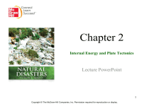 Chapter 2 Internal Energy and Plate Tectonics Lecture PowerPoint 1 Copyright © The McGraw-Hill Companies, Inc. Permission required for reproduction or display. Origin of the Sun and Planets • Solar system began as rotating spherical cloud of gas, ice, dust and debris • Gravitational attraction brought particles together into bigger and bigger particles • Cloud contracted, sped up and flattened into disk • Formation of Sun – Greatest accumulation of matter (H and He) at center of disk – Temperature at center increased to 1 million degrees centigrade – Nuclear fusion of hydrogen (H) and helium (He) began, producing solar radiation Origin of the Sun and Planets Figure 2.1 Origin of the Sun and Planets • Formation of planets – Rings of concentrated matter formed within disk – Particles within rings continued to collide to form planets – Inner planets (Mercury, Venus, Earth and Mars) lost much gas and liquid to solar radiation, becoming rocky (terrestrial) – Outer planets retained gas and liquid, as gas planets Impact Origin of the Moon – Early impact of Mars-sized body with Earth – Impact generated massive cloud of dust (from Earth’s crust and mantle) and gas which condensed to form Moon – Lightweight gases and liquids lost to space – Lesser abundance of iron (from Earth’s core) in Moon Earth History • Earth began as aggregating mass of particles and gases – Aggregation took 30 to 100 million years – Occurred nearly 4.6 billion years ago • Processes of planet formation created huge amounts of heat – Impact energy – Decay of radioactive elements – Gravitational energy – Differentiation into layers Figure 2.2 Earth History • Differentiation into layers – As temperature rose above 1,000 centigrade, iron melted – Liquid iron is denser than remaining rock, so sank toward center of Earth to form inner and outer core – Release of gravitational energy produced additional heat – Remaining rock melted, allowing low-density material to rise – Low-density material formed crust, oceans and atmosphere • 4.4 billion years ago: large oceans, small continents • 3.5 billion years ago: life (photosynthetic bacteria) • 2.5 billion years ago: large continent • 1.5 billion years ago: plate tectonics Side Note: Mother Earth Analogy with Mother Earth, 46-year-old woman: (1 Mother Earth year = 100 million geologic years) • First seven years unaccounted for • 42 years old: life appeared on continents • 45 years old: flowering plants • 8 months ago: dinosaurs died out • Last week: human ancestors evolved • Yesterday: humans evolved • Last hour: discovered agriculture, settled down • 1 minute ago: Industrial Revolution The Layered Earth • Differentiated into layers of increasing density • Center of Earth: Iron-rich core 7,000 km in diameter – Inner core is solid and 2,450 km in diameter – Outer core is liquid and has viscous convection currents, responsible for Earth’s magnetic field • Surrounding core is Earth’s mantle, 2,900 km thick – Stony in composition (like chondritic meteorites) – 83% of Earth’s volume, 67% of Earth’s mass • Low-density elements have been ‘sweated’ out of the mantle to form the crust, atmosphere and oceans The Layered Earth Figure 2.3 The Layered Earth Figure 2.4 • Layers can be described in terms of – Different density (different chemical and mineral compositions) • Crust overlies mantle – Or different strength • Lithosphere overlies asthenosphere • Lithosphere is rigid (solid rock) • Asthenosphere is fluidlike (plastic rock) • Mesosphere is solid mantle below asthenosphere Side Note: Volcanoes and the Origin of the Ocean, Atmosphere and Life • Volcanic gases: – Hydrogen (H), oxygen (O), carbon (C), sulfur (S), chlorine (Cl), nitrogen (N) • Combine to make: – Water (H2O), carbon dioxide (CO2), sulfur dioxide (SO2), hydrogen sulfide (H2S), carbon monoxide (CO), nitrogen (N2), hydrogen (H2), hydrochloric acid (HCl), methane (CH4), and others • Dominant volcanic gas is water vapor – more than 90% Side Note: Volcanoes and the Origin of the Ocean, Atmospheres and Life • Volcanic rocks: – Oxygen (O), silicon (Si), aluminum (Al), iron (Fe), calcium (Ca), magnesium (Mg), sodium (Na), potassium (K) • 4.5 billion years of volcanism has brought light weight elements to the surface to make up – – – – Continents Oceans Atmosphere CHON (carbon, hydrogen, oxygen, nitrogen) elements of life The Layered Earth Behavior of Materials • Gas, solid and liquid are obvious terms, but should be considered with respect to time – Over longer time periods, solids may behave as liquid • Glacier: solid ice, yet flows (ultrahigh viscosity liquid) over years • Elastic deformation is recoverable – object returns to original shape • Ductile deformation is permanent – stress applied over long time or at high temperatures • Brittle deformation is permanent – stress applied very quickly to shatter or break object The Layered Earth • Permanent stress occurs when yield stress is reached • Rocks at Earth’s surface (low temperature, low pressure): brittle • Rocks in asthenosphere: “soft plastic” • Rocks in deeper mantle: “stiff plastic” Figure 2.5 The Layered Earth • • • • • Asthenosphere is plastic About 250 km thick Comes to surface at mid-ocean ridges Lies more than 100 km below surface elsewhere Allows Earth to be oblate spheroid (flattened during rotation; like Solar System during formation) • Allows continents to ‘float’ atop the mantle, by principles of isostasy Isostasy • Isostasy: Less dense materials float on top of more dense materials (i.e. iceberg floating in ocean); buoyancy principle • Earth is a series of density-stratified layers • Core – densities up to 16 gm/cm3 • Mantle – densities from 5.7 to 3.3 gm/cm3 • Continents (crust) – densities around 2.7 gm/cm3 • Oceans – densities around 1.03 