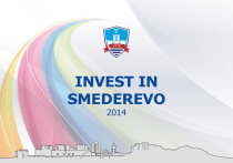 INVEST IN SMEDEREVO 2014 INVEST IN SMEDEREVO Smederevo – City of cultural heritage INVEST IN SMEDEREVO Smederevo – City of cultural heritage Cultural heritage: Prehistory Ancient history Middle Age The wealth of the sites Church of the Assumption of the Blessed Virgin Mary from the 15th century (First half of XV century) Church of Saint Djordje (1850-1854) Villa “Zlatni Breg” (summer residency of Obrenovic dynasty - 1829) INVEST IN SMEDEREVO Smederevo – City of cultural heritage In XV century, in the time of Despot Djuradj Brankovic, Smederevo was capital of medieval Serbian kingdom and the capital of religious and urban life This historical obligation is still respected! INVEST IN SMEDEREVO Smederevo – City of cultural heritage Pride of the city– Smederevo fortress, despot`s capital city (1428-1459) which was spreading across 11ha of land, with 25 massive towers which are connected with walls, and which represent the biggest lowland fortress in Europe INVEST IN SMEDEREVO Smederevo today INVEST IN SMEDEREVO Smederevo today 110.000 residents 11 urban and 27 rural communities 484 km2 surface 46 km from Belgrade Near highway E-75 with 3 access points Bridge on Danube river 6 km away – connection with Vojvodina Railway Industrial port INVEST IN SMEDEREVO Smederevo today City of youth, sports and culture INVEST IN SMEDEREVO Smederevo today Sports Hall Smederevo 5000 seats Host of Universiade 2009 INVEST IN SMEDEREVO Smederevo today Open swimming pool with Olympic requirements 80000 swimmers in season INVEST IN SMEDEREVO Smederevo today Center for Culture Smederevo Built by Finnish model Large hall 700 seats Concert hall 200 seat Cinema hall 250 seat Art studio Art gallery INVEST IN SMEDEREVO Smederevo today - Manifestations Smederevo`s Autumn Tradition from 1888 as festival of grapes and vine. Become one-month presentation of economic and tourist potential of the city. INVEST IN SMEDEREVO Smederevo today - Manifestation Nušić`s Days In honor of our citizen Branislav Nusic, famous Serbian writer, manifestation which gathers the highest quality theater plays in previous season has been organized from 1984 INVEST IN SMEDEREVO Smederevo today - Manifestation Smederevo Poet Autumn Poetry is in the heart of Smederevo`s people. From 1970 it is traditional festival who gathers world famous poets. INVEST IN SMEDEREVO Smederevo today - Manifestation The Fortress Theatre Festival Tradition obliged to set foundation of new one. International ambiance festival The Fortress Theatre Festival was found in 2009 INVEST IN SMEDEREVO Smederevo – Educational profiles Technical school CADRES: computer network administrator, computer electrical engineer, electrical automation, recycling technician, operator, machinist, welder, mechanic hydraulics and pneumatics, electrician, etc. INVEST IN SMEDEREVO Smederevo – Educational profiles Economic school CADRES: economic technician, financial technician, culinary technician, a waiter, chef, pastry cook, salesman, etc. INVEST IN SMEDEREVO Smederevo – Educational profiles Textile – technological and agriculture school “Despot Djuradj” CADRES: Modeler of clothes, fashion tailor, veterinary technician, agricultural technician, environmental technician, chemical technology technician, baker, butcher, etc. INVEST IN SMEDEREVO Smederevo – Educational profiles Railway– industrial school CADRES: welder, machinist railroader, electrician of rail vehicles etc. INVEST IN SMEDEREVO Smederevo at European environment Munich Two Pan-European corridors: Danube – Corridor VII E-75 Highway - Corridor X Wien Corridor of project realization for gas system South Stream Budapest (State investment) Munich 1000 km Istanbul 900 km Wien 700 km Zagreb SMEDEREVO Bucurest Sarajevo Sofia Istanbul Tessaloniki INVEST IN SMEDEREVO Investment areas • Industry • Tourism • Agriculture • Sport and recreation • Infrastructure and Traffic • Housing • Ecology INVEST IN SMEDEREVO Smederevo – Available work force 1. Qualification by level of education and gender Level of education Male Female Total NK i PK SSS VS i VSS Total 2961 2517 5478 987 1600 2587 491 729 1220 4439 4846 9285 2. Dominant structure of professions by level of education and qualification Qualification Profession Without qualification Assistant clothes manufacturer Assistant of bricklayer Fork lift driver Crane driver Operators of agricultural machinery Food and drink processor Butcher Baker Qualification NK i PK 2456 (1294 w) 55 20 14 14 25 138 53 45 Profession Food technician and bioengineering technician Metallurgical technician Mechanical technician designer Chemical engineering technician Road traffic technician Economic technician 3. Total number of employees 21077 SSS 91 105 189 77 110 255 Qualification Profession Mechanical engineer Economist for finance, accounting and banking Occupational manager Occupational economist Food technology engineer Graduated mechanical engineer Engineer for production management Graduated economist for general ecnomy, banking and finance Law graduated VS i VSS 12 48 24 39 12 11 17 78 45 INVEST IN SMEDEREVO Smederevo – Successful investments Messer Tehnogas a.d. Products and supplies customers with oxygen, nitrogen, argon, carbon dioxide, hydrogen, helium, inert welding gases, special gases, gases for medicinal use and a wide range of gas mixtures INVEST IN SMEDEREVO Smederevo – Successful investments Metech d.o.o. • Part of Belgian company Metes N.V. • Manufacture products of all kinds of plates • Production facility equipped with a laser cutting and punching, CNC machines etc. • Export to 3 leading companies on Belgian market • Operates in Smederevo Free Zone INVEST IN SMEDEREVO Smederevo – Successful investments Železara Smederevo d.o.o. • Production and export of steel, hot and cold rolled products and tin plates • Until 2012 operates as a part of American company U. S. Steel • One of the largest exporter from Serbia INVEST IN SMED