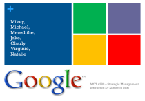 + Mikey, Michael, Meredithe, Jake, Charly, Virginie, Natalie MGT 4380 – Strategic Management Instructor: Dr Kimberly Boal + Google’s History In 1998 current CEO Larry Page an undergraduate student at Stanford launch Google In 2000 Google enter the foreign market and provide 10 different languages of their search engine As 2010, Google offers over 100 languages + Information Revolution Google has introduced revolutionary changes in the way that any kind of information is managed, shared and made useful. Google has created these products over a period of time. Google Search Google Earth Google Desktop Google Maps Google Video Google Groups Google Mail Google Trends + Innovation Google’s top goal in 2006 was to increase the scale of innovation Google search engine,is the largest search engine on the Web. “bottom up”/mass collaboration capability: which is Internet, personal messaging systems, and social networks Google keeping up with Apple introducing the Android. + Continual Change Google Google was a Web-based search engine now has changed and is capable of doing many more things Google maps: interactive Follow trends: finances Newest change it is now possible to get satellite images of Earth at any point + Creativity Creativity- is the ability to combine ideas in a unique way or to make unusual associations between ideas. Google's new marketing unit- Google Creative Lab Still in its developing stage Small teams Find new ways to communicate the company’s innovations, intentions and ideals + Google's Vision and Mission Statements Google's Vision Statement: an open web benefits all users and publishers. “Open” does not be free Google’s Mission Statement: is to organize the world’s first information and make it universally acceptable and useful + Leadership Level 5 leaders Modest and Willful, Humble and Fearless Set up their successors for even greater success for the next generation. Many Google offices- Googlers work in small, focused teams and high- energy environments. + Top Executives Larry Page- Co-founder/ CEO Sergey Brin- Co-founder L. John Doerr- Board of Director Eric E. Schmidt- Executive chairman Nikesha Arora- Senior VP, Corporate development & Chief legal officer Patrick Pichette- Senior Vice President + Internal Analysis Google’s mission statement: Strengths Weaknesses + Internal Analysis Google’s Value Chain Raw material: web users Finished goods: “conversion” or click + SWOT Analysis External Opportunities and Threats Two examples of Google's SWOT Analysis + Opportunities New Products along with increased positive outlook for Android Nexus One and Nexus S Android OS + Opportunities continued New Products Google Chrome and Chrome Book + Threats Microsoft & Yahoo! Search engines like Bing and Yahoo! Search Vertical Search Engine + Financials Current Ratio Gross Profit Margin Short term assets and short term liabilities 69.7 Net Revenue + Two-Sided Market + Global Market Share + Time Line Trend + Global Relations Crisis Drops Stock Prices + Yahoo Competitive Analysis Bing Baidu + Operating in 50 countries and 25 different languages They have good brand recognition Losing Revenues in the past three years have cause layoffs through out the company. 30% of the revenues come from business outside the U.S. Differences They receive income from mobile products, royalties, licensing, premium e-mails, and advertising + Yahoo and Microsoft collaboration started in 2009 effective till 2015. Currently powering both Yahoo and MSN searches. Advantages: Best Resources from each company: Combines Microsoft’s new search technology, and Yahoo’s video and advertising capabilities. Disadvantages: Cultural differences Takes away traffic from their own websites. Lacks brand recognition compared to Google Enhanced search capabilities that Google has had for long time. + Have 80% of China’s Market Share Advantages: Better knowledge of Chinese language Better relationship with Government Filters Similarities: Revenue comes from advertising Recently made an investment in Travel Search Engine + Google + What’s Google doing to Combat? Investing in other interests Diversifying AOL their product line partnership Helps AOL with advertising Gives Google better video technology New purchase of ITA Software Enhances Google’s travel tab + Low Cost and Differentiation Strategy Low Cost Advantages: Low operating costs Same technology used for all aspects of the business Differentiation Advantages: Unique formula High customer utility Strong Brand Value + Current Industry Standing (Visual Awakening) Awareness of Comparable factors (compared to Yahoo) Cost – less overhead for operations and promotion, search engine is promotion in itself Brand Awareness – Google has higher brand loyalty than Yahoo Views to site annually – Google=82.8% while Yahoo=6.42% Convenience of Information Accessibility and ease of use By Google leading the industry in these key factors, we will not need to adjust corporate strategy as aggressively. + Doing What Google Does Best… Google does very well at adhering to the hedgehog concept and follows the three determining factors Passion – Google hires employees who strive for innovation in R&D and enjoy creating new globally accepted, innovating ideas. Executives allow free time for Google employees to work on their own projects they are currently passionate about This helps result in the greatest effort towards new product ideas and is the reason some of the most innovative ideas are formulated + Doing What Google Does Best… What Google is the best at is also their mission statement: Mission – Organize the worlds information and make it universally accessible and useful We have best search engine online today (most viewed) We must continue to have best search engine because 97% of our revenue is from advertisements Advertising expenditures for this industry have rose: 11% in 2008 3% in 2009 12% in 2010 for US internet companies ( 1/3 came fr