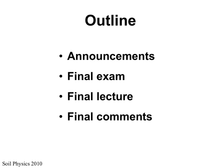 Outline • Announcements • Final exam • Final lecture • Final comments Soil Physics 2010 Announcements • Last review session: • 11:00 – 1:00 today in G217 • Homework 7 answers & spreadsheet are posted • List of review topics is posted • Practice questions won’t happen • Textbook typos taken till terminal testing (accepted until the final exam) Soil Physics 2010 Final exam I • 9:45 – 11:45, Monday, May 3, 2010, in room 2026 Agronomy Hall • Bring a calculator, pens and/or pencils, and 1 sheet of letter paper • The (cheat-) sheet rules are the same as earlier: 1 side only, anything you want, cannot be scanned or photocopied, your name on the back Soil Physics 2010 Final exam II • The final exam is comprehensive • My target is 50% covering material since the last exam, and 50% from the first 2/3 of the semester • Same general format and kinds of questions as previous exams • Some questions will be recycled from earlier tests and quizzes Soil Physics 2010 Final exam III • Feel free to send me candidate questions. • Raffiniert ist der Toby, aber boshaft ist er nicht Soil Physics 2010 Final lecture Soil Physics 2010 Solute transport Summary: • CDE says dispersion is like diffusion • Streamtubes say dispersion is about different flow velocities • Neither upscales reliably Soil Physics 2010 But don’t despair! • Allen Hunt, critical path analysis (CPA) • How important is diffusion > a few pores? Log [at x scales (m) ] • Allen Shapiro, 1000 km BTC with 2 tracers -2 2 4 6 5 1 Soil Physics 2010 Field, porous (65) Field, fractured (26) Laboratory (85) Haggerty (159) Vanderborght (635) 2-D ordered 2-D disordered 3-D ordered 3-D disordered 2-D inv/dis -1 -3 -5 Log [ α (m) ] 3 Thoughts I may not have gone where I intended to go, but I think I have ended up where I intended to be. ~ Douglas Adams Physics is mathematical not because we know so much about the physical world, but because we know so little; it is only its mathematical properties that we can discover. ~ Bertrand Russell Soil Physics 2010 Objectives 1. To learn and understand basic concepts of soil physics 2. To apply soil physics concepts as appropriate 3. To recognize soil physics when you see it outside the classroom 4. To enhance your overall scientific, quantitative, and computer skills Soil Physics 2010 What we’ve seen Follow the units No gradient, no flow (sort of like Newton’s 1st law) Newton’s first law is under-rated Lots of history. All science is a continuing story. Remember that 2 months in the lab can spare you 2 hours in the library. A transient equation is a steady-state equation combined with a conservation equation A physical explanation should make physical sense Soil Physics 2010 What we’ve seen Cultivate your ability to see what effects are important, and what are secondary. You can solve a complex problem much more easily by ignoring most of the complexities. But also… include all the information, and you’ll get a better picture (like with homework 7) Measurement error: when to measure directly with big error, when to estimate from better or easier measurements? Example: porosity. The same equations have the same solutions But also… thinking of a process as analogous to diffusion can be really useful (e.g., heat transfer), or really misleading (e.g., hydraulic diffusivity and the CDE). Soil Physics 2010 Successes of soil physics Processes in the soil are subject to the same physics as rivers, engines, and planetary orbits: Newton’s laws, Darcy’s law, Fick’s law, Fourier’s law, and so on. Fundamental basis for managing drainage, irrigation, soil engineering Soil physics processes are inextricably linked with soil chemitry, soil microbiology, pedology, plant growth, weather and climate, soil management,… Soil Physics 2010 Successes of soil physics Historically robust connection between field, laboratory, and theory. Recognition of soil in context: hillslope hydrology, preferential flow Methods of measurement and analysis continue to improve The best soil physicists frequently borrow from other disciplines: remote sensing, microCT, lattice-Boltzmann modeling, molecular dynamics, surface chemistry percolation theory, graph theory, constructal theory geostatistics, fractals, simulation models In fact, the best soil physicists often come from different disciplines: math, physics, engineering, agriculture, and so on. Soil Physics 2010 Failures of soil physics Constitutive relationships are disjointed, missing important linkages. For example, the air entry pressure ha is presumably related to Ks, to typical field saturation, to soil structure, and perhaps to qr. These connections hold promise, but get little attention. Little exploration at the extremes. For example, predicting and measuring unsaturated hydraulic conductivity at low water contents. Likewise, dispersion is almost never studied in unsaturated systems Structure, structure, structure, at many scales. Way beyond what soil morphology or geostatistics can deal with. Soil Physics 2010 Failures of soil physics Coupled processes are poorly understood rigorously, theoretically, quantitatively. How does water move heat, or a thermal gradient move salt? Soil is never isothermal, but most soil physics equations are. As a soil heats up, the particles expand, water viscosity and surface energy decrease, and air expansion makes the soil breathe out. Pay attention! Too many things are assumed uniform in both space and time. Typically we assume that particle size distribution, porosity, wetting angle, organic matter content, structure, and even temperature, don’t change. Soil Physics 2010 Issues and opportunities in soil physics In soils, randomness and structure occur at all scales, and can have a huge impact on transport properties. We don’t know how to measure structure, nor to use what structural information that we do have. Scales of heterogeneity: we need to use a combination of traditional p