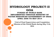 HYDROLOGY PROJECT-II GOA FUNDED BY WORLD BANK IMPLEMENTED THROUGH MINISTRY OF WATER RESOURCES GOVERNMENT OF INDIA APRIL 2006 TO MAY 2014 Visit of Final Supervision and Completion Mission of the World Bank during May 5-16, 2014 ABOUT THE STATE The State of Goa is located on India’s west coast between North Latitude 14 53 57 and 15 47 59 and between East Longitude 73 40 35 and 74 20 11.The geographical area of Goa state is 3702 Sq. Kms. and divided into two district namely North Goa (1736 Sq. Kms.) and South Goa (1966 Sq. Kms.)having six and five Talukas respectively. Panaji is the State capital as well as the headquarters for North Goa District and Margao is headquarter for South Goa District. Goa State is having a population of 1.40 million HYDROLOGY PROJECT II- AT A GLANCE CLIMATE There is considerable variation in climate of the State due to elevation , topography and movement of air masses. Climatically the year can be divided into three distinct seasons: Monsoon (June to October) Winter (November to February) Summer (March to May) The State of Goa receives rainfall when southwest monsoon is active. Rainfall is not uniform throughout the State. Long term rainfall records show that an area in Western Ghat region in Eastern part of the State receives an average rainfall exceeding 4500 mm per year, whereas coastal region on Western part receives average rainfall of 2500 mm per year and region in between receives rainfall ranging from 2500 mm to 4500mm per year. Approximately 90 to 95 % of this total annual rainfall is received during the monsoon season and roughly more than two thirds of this in three months i.e. June to August. Accordingly, due to extreme variability with location and in rainfall intensity, a rather dense network of rainfall gauge stations is required to adequately measure and/or record rainfall patterns and distribution across the State. RIVER BASINS The State possesses a vast potential of assured water. This entire wealth of water potential, about 80 to 90% of it gets drained to the Arabian sea during the monsoon period of just four months The surface drainage is helped by a number of nallahs, rivulets and rivers which principally run across the State in a westerly direction and finally into the Arabian sea. RIVER BASINS THERE ARE NINE RIVER BASINS OF WEST FLOWING SHORT RIVERS ORIGINATING FROM WESTERN GHATS AND DRAINING INTO ARABIAN SEA IN THE WEST UNDER ESTUARINE ENVIRONMENT. IN MOST OF THE RIVER TIDAL EFFECT IS FELT OVER A DISTANCE OF 30 KMS FROM MOUTH. Sr.No River Basin Length within State 26 Length within Basin Area salinity zone in Sq.Kms. 26 71 1 TEREKHOL 2 CHAPORA 32 32 255 3 BAGA 10 10 50 4 MANDOVI 52 36 1580 5 ZUARI 145 42 973 6 SAL 40 14 301 7 SALERI 11 5 149 8 TALPONA 32 7 233 9 GALGIBAG 14 4 90 TOTAL 3702 BASIN MAP OF GOA SCOPE OF THE PROJECT The project envisages improvement of management of hydrological data in general and project in particular. The raw data collected from field observation would not be enough for design of hydrology and river basin planning unless it is analyzed, processed and stored in a easily retrievable form in the state data center with conjunctive strengthening and linkage between State and Center. In order to achieve the above target the Hydrology Project Phase-II has been structured in to the following components. Surface Water hydrology Ground Water Hydrology Hydro Meteorology Water Quality EXPENDITURE ON THE PROJECT Loan amount by World Bank: Rs. 15.8362 Crores. State Share: Rs 3.0821 Crores. Total Project Cost: Rs 22.6455 Crores. Expenditure from April 2006 up to March 2014 Rs 18.9183 Crores. Works/ goods for which payment has to be made in the remaining period = Rs 3.73 Crores. ORGANOGRAM FOR HP-II Chief Engineer Water Resources Dept Project Cocoordinator Superintending Engineer Circle I, Panaji Nodal Officer Executive Engineer III S.W & Hydrometeorolog y, Procurement In charge Sr Hydro geologist G.W. In charge Hydro-Geologist1 Asst. HydroGeologist-1 SDII, WD I Porvorim TA-1, JE-3 SDIII, WD II Quepem TA-1, JE-3 SDI, WDIII Bicholim TA-1, JE-3 SD II, WD III Ponda TA-1, JE-3 SD III, WD III Margao TA-1, JE-3 Data Manager Data Center & Laboratory In charge Technical Cell ASW-2 Asst. Hydrogeologist-1 TA-2, JE-2 Surface Water Asst Hydrologist.2 TA-2, Ground Water Asst HydroGeologist.-1 TA-2 Chemist Lab. Attendant-35 Supervisor-10 Helper-10 LAUNCH OF THE PROJECT IN APRIL 2006 Project launch in April 2006 Interactive session held with central agencies at Goa in May 2006 As per advise of Central agencies four expert committees for Surface Water, Ground Water, Hydro Meteorology and Water implement the project formed Quality to FORMATION OF COMMITTEES State Level Steering Committee chaired by Secretary & Commissioner (Water Resources) formed. First meeting held in March 2007 and second meeting held in March 2010. Expert Committees on Surface Water, Ground Water and Hydrometeorology formed and various meetings held. Hydrology Users Committee formed. SURFACE WATER 23 River Gauge stations identified and proposal submitted to Expert Committee for approval. Expert Committee on Surface Water at its first meeting held on 04/01/2007 approved establishment of 6 River Gauge Stations, at its second meeting held on 23/01/2008 approved establishment of 3 River Gauge Stations and at its third meeting held on 09/03/2010 approved establishment of 2 River Gauge Stations. All the approved River Gauge sites are Bridge sites and have been established. SURFACE WATER Sites for River Gauge Stations are: 1. Bicholim(Bicholim river) 7. Orthofond ( Talpona ) 2. Ghoteli (Valvanti river) 8. Paikul (Ragada river) 3. Ugem (Zuari river) 9.Zambauli (Kushawati river) 4.Hassapur(Kalna river) 10. Daucond (Khandepar river) 5. Verna (Sal river) 11. Borus ( Galgibag ) 6. Khadki (Madei river) The collection of data with current meter, counter & bridge outfit from the above RG Sites has started from July 2009 and June 2010. The data is entered in SWDES & submitted to CWC, H