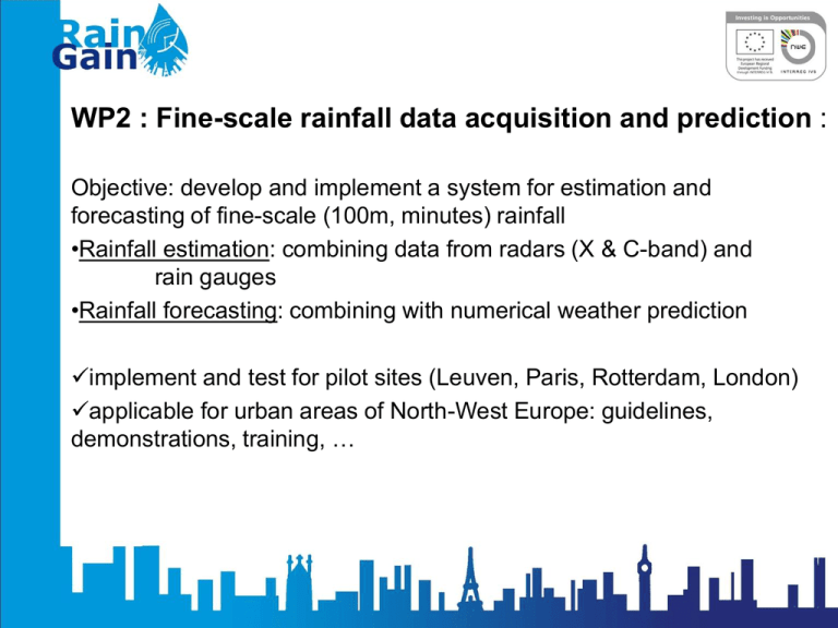 WP2 : Fine-scale rainfall data acquisition and prediction : Objective: develop and implement a system for estimation and forecasting of fine-scale (100m, minutes) rainfall •Rainfall estimation: combining data from radars (X & C-band) and rain gauges •Rainfall forecasting: combining with numerical weather prediction implement and test for pilot sites (Leuven, Paris, Rotterdam, London) applicable for urban areas of North-West Europe: guidelines, demonstrations, training, … WP2 : Fine-scale rainfall data acquisition and prediction : Applications (see WP3, WP4): •Rainfall estimation: enable city water managers to develop reliable urban water strategies, including plans for urban flood prevention and pollution management •Rainfall forecasting: allow local city managers to forecast, warn about and control urban pluvial impacts at street level in real time WP2 : Fine-scale rainfall data acquisition and prediction : Actions: WP2 A5 Workshop on radar technology, calibration and rainfall estimation A6 Rainfall estimation in pilot sites A7 Workshop on rainfall forecasting Output: Report on methods for fine-scale rainfall estimation Output: Rainfall estimates for storms in pilot sites Output: Report on methods for fine-scale rainfall forecasting A8 Implementation and testing of rainfall forecasting in pilot sites A9 Writing guidelines, manuals and training material Output: Operational system for rainfall forecasting in pilot sites Output: Manuals for developed technology + training WP2 : Fine-scale rainfall data acquisition and prediction : Actions: WP2 A5 & A6: Rainfall estimation •A5: Leuven workshop on radar technology, calibration and rainfall estimation (M3) Outcome: recommended methods for fine-scale rainfall estimation •A6: rainfall estimation in pilot sites Outcomes: fine-scale rainfall estimates for recent storms in pilot sites + comparison with traditional rainfall estimates (without radar) WP2 : Fine-scale rainfall data acquisition and prediction : Actions: WP2 A5 & A6: Rainfall estimation Subtopics addressed: •Radar calibration and adjustment based on rain gauge data •Different calibration/adjustment methods •Comparison & integration of fine-scale (X-band, city scale; superresolution C-band) with rain gauge and coarser (NWE-scale) Cband radar data •Rainfall estimation error/uncertainty analysis •Interfacing with the applications in WP3 & WP4 WP2 : Fine-scale rainfall data acquisition and prediction : Actions: WP2 A7 & A8: Rainfall forecasting •A7: London workshop on rainfall forecasting (M6) Outcome: recommended methods for fine-scale rainfall forecasting •A8: implementation for pilot sites Outcomes: operational system for fine-scale rainfall forecasting in pilot sites + results for min. 10 extreme storms WP2 : Fine-scale rainfall data acquisition and prediction : Actions: WP2 A7 & A8: Rainfall forecasting (short-term forecasting = nowcasting) Subtopics addressed: •Combination of (fine and coarse scale) radar data with Numerical Weather Prediction (provided by national meteo services) •Use of lightning detection data •Advective-statistical forecast model •Spatial and temporal downscaling •Error/uncertainty estimation in function of forecast lead time / probabilistic forecasts •Interfacing with the applications in WP3 & WP4 WP2 : Fine-scale rainfall data acquisition and prediction : Actions: WP2 A9: Guidelines Outcome: reference and user’s manuals on developed technologies for rainfall estimation and forecasting Training and dissemination during National Observer Meetings WP2: Fine-scale rainfall data acquisition and prediction: Timing: WP2 A5: rainfall estimation workshop Leuven: autumn 2012 WP2 A6: autumn 2012 – spring 2014: all pilot sites WP2 A7: rainfall forecasting workshop London: spring 2014 WP2 A8: spring 2014 – spring 2015: all pilot sites WP2 A9: once a year: National Observer Meetings WP2: Fine-scale rainfall data acquisition and prediction: Workshop participants: workshop Leuven: about 20 radar experts workshop London: about 20 radar + NWP experts local workshops pilot sites: about 20 end users: city flood managers, water managers, consultants and industrial partners Leuven case Aquafin & K.U.Leuven X-band radar installed since 2008 City LAWR (DHI) Site selection based on clutter tests Experience with calibration Brussels Leuven 10 km Other fine-scale radar projects in Europe Denmark: X-band LAWR radar Aalborg Comparison of different calibration procedures (incl. dynamic calibration) Impact on urban drainage Other fine-scale radar projects in Europe France – Lyon: C-band radar located in the close vicinity Rain gauges vs. radar Study of intense rain cells Impact on urban drainage Other fine-scale radar projects in Europe France – Southern Alps: (RHyTMME project) Local X band radar network (4 radars, 2 operational) Installed in mountainous area prone to orographically-induced flooding Gap filling function in ARAMIS (C and S band network) Other fine-scale radar projects outside Europe USA: CASA (Collaborative Adaptive Sensing of the Atmosphere) Local X band network (moving from Oklahoma “Tornado Alley” to Fort Dallas in 2012) Other fine-scale radar projects in Europe USA: Comparison polarimetric X-band vs. S-band Impact on catchment runoff Other fine-scale radar projects outside Europe Japan: X-NET Nationwide X-band Polarimetric Radar Network (26 radars cover about 80% of the total population) Leuven case BELGIUM Contributors from Belgium: • Patrick Willems, K.U.Leuven • Johan Van Assel, Aquafin • Maarten Reyniers, Laurent Delobbe, Royal Meteorological Institute of Belgium Leuven case City of Leuven: urban drainage system of the villages Herent, Wisele & Wijgmaal Brussels Leuven 10 km Leuven case City of Leuven: urban drainage system of the villages Herent, Wisele & Wijgmaal Area: 9.13 km2 # people: 16,100 9 tipping bucket rain gauges In-sewer measurements: Water level + velocity in 2 pipes Water level at 3 overflows +