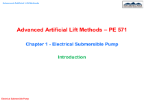 Advanced Artificial Lift Methods Advanced Artificial Lift Methods – PE 571 Chapter 1 - Electrical Submersible Pump Introduction Electrical Submersible Pump Advanced Artificial Lift Methods Class Schedule Instructor: Tan Nguyen Class: Tuesday & Thursday Time: 09:30 AM - 10:45 AM Room: MSEC 367 Office: MSEC 372 Office Hours: Tuesday & Thursday 2:00 – 4:00 pm Phone: ext-5483 E-mail: tcnguyen@nmt.edu Electrical Submersible Pump Advanced Artificial Lift Methods Course Outline Chapter 1: Electrical Submersible Pump Chapter 2: Gas Lift Chapter 3: Rod Sucker Pump Chapter 4: Plunger Lift Chapter 5: Progressive Cavity Pump Chapter 6: Hydraulic Pump Electrical Submersible Pump Advanced Artificial Lift Methods Introduction to ESP Electrical Submersible Pumping • Second most commonly used method worldwide (+100,000 wells) • Used massively in Russia and in significant number of wells in US • Responsible for the highest amount of total fluids produced (oil and water) by any artificial lift method and an ideal method for high water cut wells • Problems with sand production, high gas liquid ratio and high bottom hole temperatures Electrical Submersible Pump Advanced Artificial Lift Methods Introduction to ESP Electrical Submersible Pump Advanced Artificial Lift Methods Introduction to ESP Electrical Submersible Pump Advanced Artificial Lift Methods Introduction to ESP The system’s surface equipment includes transformers, a switchboard, junction box and surface power cables. Power passes through a cable running from the transformer to the switchboard and junction box, then to the wellhead The ESP downhole assembly is located in the well at the bottom of the tubing. The motor, seal, intake and pump assembly, along with the power cable, goes in the well as the tubing is run. Below the pump is an intake that allows fluid to enter the pump. Below the intake is a gas separator and a protector or seal, which equalizes internal and external pressures and protects the motor from well fluids. At the bottom is a motor that drives the pump. The assembly is positioned in the well above the perforations; this allows fluid entering the intake to flow past the motor and cool it. Electrical Submersible Pump Advanced Artificial Lift Methods Introduction to ESP Benefits of ESPs They can be economically designed for both oil and water wells, at production rates ranging from 200 to 60,000 B/D and at depths of .up to 15,000 feet. They can be used in crooked or deviated wells. DLS < 9 degrees/100ft They have a relatively small “surface footprint,” and so are appropriate for use in offshore, urban or other confined locations. They are relatively simple to operate. They generally provide low lifting costs for high fluid volumes. They make it easy to apply corrosion and scale treatments. Electrical Submersible Pump Advanced Artificial Lift Methods Introduction to ESP Limitations of ESPs They are generally limited to single-zone completions They requires a source of high-voltage electric power The presence of a power cable alongside the tubing string can make it more difficult to run or pull tubing. They are not particularly good at handling gas and solids production. Analyzing the system performance can be a challenge. Power cables may deteriorate in high temperature conditions—400 degrees Fahrenheit (about 200 degrees Celsius) is their general upper limit with respect to operating temperature. Electrical Submersible Pump Advanced Artificial Lift Methods Introduction to ESP Principles of an ESP For a naturally flowing well the intersection of the IPR and OPR curves defines the natural equilibrium flowrate • For a naturally flowing well it is possible to produce a wide range of flow rates smaller than the naturally flowing flowrate with the use of a choke • On the other hand, in a naturally flowing well without artificial lift equipment, production flowrates higher than the natural flowrate are impossible to be achieved since for those conditions, the OPR pressures are bigger than the IPR pressures Electrical Submersible Pump Advanced Artificial Lift Methods Introduction to ESP Principles of an ESP Electrical Submersible Pump Advanced Artificial Lift Methods Introduction to ESP Principles of an ESP In order to produce flowrates higher than the natural equilibrium flowrate the use of an artificial lift system is necessary • If an ESP is installed in the tubing string close to the perforations, the discharge pressure of the pump must be equal to the OPR pressure and the intake pressure of the pump must be equal to the IPR pressure • The difference between the OPR and IPR bottom hole flowing pressure for flowrates bigger than the natural equilibrium flowrate defines the pressure increment that the ESP must deliver Electrical Submersible Pump Advanced Artificial Lift Methods Introduction to ESP Principles of an ESP Electrical Submersible Pump Advanced Artificial Lift Methods Introduction to ESP Principles of an ESP The submersible pumps are multistage centrifugal pumps operating in a vertical position. Produced liquids, after being subjected to great centrifugal forces caused by the high rotational speed of the impeller, lose their kinetic energy in the diffuser where a conversion of kinetic to pressure energy takes place. This is the main operational mechanism of radial and mixed flow pumps. The ratio between the centrifugal force and the gravitational force: If w = 3600 RPM, r = 4’’ then this ratio is 131,673 Electrical Submersible Pump Advanced Artificial Lift Methods Introduction to ESP History of ESPs http://esppump.com/ REDA: Russian Electric Dynamo of Arutunoff estalished in 1930 in Bartlesville, OK Became Schlumerger-REDA Production Systems in the late 1990s Armais Arutunoff Electrical Submersible Pump Advanced Artificial Lift Methods Introduction to ESP History of ESPs ESP providers nowadays: 1. Schlumberger-REDA (Bartlesville, OK) 2. Centrilift – Baker Hughes (Claremore, OK) 3. Weatherford 4