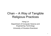 Chan – A Way of Tangible Religious Practices Hong Lin Department of Computer Science and Engineering Technology University of Houston-Downtown 1 Introduction to Chan • Chan (or Ch’an in Chinese) • Zen (in Japanese) • Dhyāna (in Sanskrit) • Wikipedia Definition: Zen is a school of Mahāyāna Buddhism, referred to in Chinese as Chan. Chan is itself derived from the Sanskrit Dhyāna, which means "meditation" 2 Wikipedia Definition (Cont’d) Zen emphasizes dharma practice and experiential wisdom—particularly as realized in the form of meditation known as zazen—in the attainment of awakening. As such, it de-emphasizes both theoretical knowledge and the study of religious texts in favor of direct, experiential realization. 3 Origin • Flower Sermon, in which Śākyamuni Buddha (Siddhartha Gautama) transmitted direct prajñā (wisdom) to the disciple Mahākāśyapa. In the original Sino-Japanese, this story is called nengemishō (拈花微笑, literally "pick up flower, subtle smile"). • Gautama Buddha gathered his disciples one day for a dharma talk. When they gathered together, the Buddha was completely silent and some speculated that perhaps the Buddha was tired or ill. The Buddha silently held up and twirled a flower and twinkled his eyes; several of his disciples tried to interpret what this meant, though none of them were correct. One of the Buddha's disciples, Mahākāśyapa, silently gazed at the flower and broke into a broad smile. The Buddha then acknowledged Mahākāśyapa's insight by saying the following: • I possess the true Dharma eye, the marvelous mind of Nirvana, the true form of the formless, the subtle Dharma Gate that does not rest on words or letters but is a special transmission outside of the scriptures. This I entrust to Mahākāśyapa. 4 Lineage and Spread-out • Indian prince turned monk Bodhidharma (early 5th century): the 28th patriarch in India and the 1st patriarch in China • "special transmission outside scriptures" which "did not stand upon words". • From China, Zen spread south to Vietnam, and east to Korea and Japan. • In the late 19th and early 20th centuries, Zen also began to establish a notable presence in North America and Europe. 5 Chan Methodology • The Flower Sermon was wordless, encapsulating ineffable tathātā: it comprised the purity of direct communication between Śākyamuni and Mahākāśyapa, who smiled. The smile signified Mahākāśyapa's direct cognition. • Zen emphasizes experiential prajñā in the attainment of enlightenment. As such, it de-emphasizes theoretical knowledge in favor of direct realization through meditation and dharma practice. • through Zen there developed a way which concentrated on direct experience rather than on rational creeds or revealed scriptures. 6 Jesus’ Teaching • Johns 1:1: In the beginning was the Word, and the Word was with God, and the Word was God. • Mathew 11:25: … Jesus said, “I praise you, Father, Lord of heaven and earth, because you have hidden these things from the wise and learned, and revealed them to little children. …” • Mathew 18:3: And he said: “I tell you the truth, unless you change and become like little children, you will never enter the kingdom of heaven. …” • Johns 4:24: God is spirit, and his worshippers must worship in spirit and in truth. • Johns 4:14: but whoever drinks the water I give him will never thirst. Indeed, the water I gave him will become in him a spring of water welling up to eternal life. 7 The Middle Way of Religions --- Anti-idolatry • Zen asserts, as do other schools in Mahāyāna Buddhism, that all sentient beings have Buddha-nature (Skt. Buddhadhātu, Tathāgatagarbha), the universal nature of transcendent wisdom (Skt. prajñā), and emphasizes that Buddha-nature is nothing other than the essential nature of the mind itself. • The aim of Zen practice is to discover this Buddhanature within each person, through meditation and practice of the Buddha's teachings. The ultimate goal of this is to become a Completely Enlightened Buddha. • The cognition of this complete enlightenment is without the desire to become a Buddha, as said by Chan patriarchs. • Therefore, Buddha is not an idol. 8 Meditation • Sitting meditation: core aspect of Zen practice, during which practitioners usually assume a position such as the lotus position. • To regulate the mind, awareness is directed towards counting or watching the breath or put in the energy center below the navel. 9 Essence of Meditation • Bodhidharma Chan: Meditation with no objects, anchors, or content, is the primary form of practice. The meditator strives to be aware of the stream of thoughts, allowing them to arise and pass away without interference. • The awakening is carried not in meditation, but in every moment of life. Therefore, sitting meditation is simply a form of practice, not the essence. 10 Buddhism and Christianity on practice • Meditation and Prayer – Bodhidharma: “The Dharma way of watching minds embraces all Dharma ways.” (“On Breaking Forms”, Tang Dynasty) – Pure Land School (净土宗): Amitābha Buddha – Original Oath School (本愿门): Meditation – no salvation – Christianity: built on faith – Prayer the only communication to God 11 The Way • Pure land is in the “heart”: “Ascending to the pure land is real, while not leaving the present world.” • John 17:15: “My prayer is not that you take them out of the world but that you protect them from the evil one.” • John 14:20: “… you will realize that I am in my Father, and you are in me, and I am in you.” • John 17:21: “that all of them may be one, Father, just as you are in me and I am in you. May they also be in us …” • Luke 17:20, 21: “The kingdom of God does not come with your careful observation, nor will people say, ‘Here it is.’ Or ‘There it is.’ Because the kingdom of God is within you.” 12 Meditation and Reli