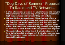 “Dog Days of Summer” Proposal To Radio and TV Networks. I offer a humorous program for your listeners and viewers this summer as therapy during the 20-40 days of extreme high temperatures and humidity they will endure. My Sam McGee persona knows Bitter Cold and offers a refreshing psychological break and subliminal reminder of the freezing cold we all experienced just 6 months ago. My program contains 3 short stories and 150 jokes about Bitter Cold and can be tailored to any country, state, region or province. I work directly with your production engineer. The material can be edited into 1-2 minute bites over a 3 hour talk show slot; or played in 4-5 minute segments over daytime news or music slots; or played in succession for late night audiences. 1 All the material is in my Trilogy book available online at www.SamMcGee2010.com April 13, 2015 2 The Trilogy contacts: Sam McGee / Hong Bai Lan / Abdul Abulbul Amir Author: Internet Contact Phone China: Kuala Lumpur: Denis Braun of Zug Switzerland www.SamMcGee2010.com denisbraun@hotmail.com Skype: Megazebo. 158-00100253 603 2144-7628 Author / Concept: Denis Braun of Zug Switzerland A Swiss-Canadian businessman living in Asia Sam Character: Costume: Fur coat, hat, & boots. Theme: Bitter Cold + 100 jokes Published by: Purgatory Press. KL Malaysia 3 Excerpts: Tale #1 Sam McGee is Bitter Cold Sam McGee knows Biter Cold is a 1905 tale of friendship between 2 trappers while dog sledding on the Dawson Trail in Yukon Canada. It is Christmas week during the record cold December of 1905 remembered across the North as the Year of the Deep Freeze. Sam McGee falls ill and makes a last request to his best friend Cap. Sam is always cold and always complains of the cold penetrating his whole body. The poem can give you goose pimples in the middle of summer!! Hence I believe I can bring relief and a smile to your listeners suffering through the Dog Days. The Complete poem is in the Appendix 2. Now, Sam McGee was from Tennessee Where the cotton blooms and blows. Why he left his home in the south to roam Around the world, God only knows. He was always cold, but the land of gold Seemed to hold him like a spell, Though he'd often say, in his homely way, 4 That he'd rather live in hell. 12. Then I took a hike, for I didn't like To hear him sizzle so. And the heavens scowled, and the huskies howled, And the winds began to blow. It was Bitter Cold, but the hot sweat rolled Down my cheeks, and I don't know why, And Sam’s greasy smoke in an inky cloak Went streaking down the sky. 13. I do not know how long in the snow I wrestled with grisly fear. But the stars came out, and they danced about Until again I ventured near. I was sick with dread, but I bravely said, "I'll just take a peek inside. I guess he's cooked, and it's time I looked", And the door I opened wide. 14. And there sat Sam, looking cool and calm In the heart of the furnace roar. And he wore a smile you could see a mile, But he said, "Please close the door. You see it's fine in here, but I greatly fear You'll let in the cold and the storm. Since I left Peachtree down in Tennessee It's the first time I've been warm." April 13, 2015 5 Sam McGee, Cap, & Robert Service Whitehorse Hotel Lobby 1903 Writer Robert Service Cap the Trapper Sam and his trophy black bear skin April 13, 2015 6 Origin of the word “Cool” We applaud Robert Service as the first writer in history to coin term “Cool” in it’s modern context. (Appendix Stanza 14 line #1): “And there sat Sam looking cool and calm in the heart of the furnace roar.” for the reader, it is the perfect mental image of Sam looking composed, detached, indestructible, philosophical, assured, coolheaded, placid, impassive, quiet, low key, and nonchalant. Robert Service is the original and sole inventor of “COOL” In 1907, who could have known Cool would become an icon in global verbal communication. To verify this discovery, I invite you to listen to Robert Service himself reciting his own poem in a 75 year old CBC audio tape at www.YouTube.com. Search Sam McGee It’s my honor to expose this literary milestone and now I challenge literary historians to prove otherwise. As for Friendship? Well it appears to be the simple key cornerstone of human society. It results from a majority of people adopting stern codes in their behavior, performance, and expectations. Cool. April 13, 2015 7 Inside the Cabin was Sam’s “Man Room” Leather furniture, plank floors, saddle seat bar, moose head, log fireplace, barber chair, bunk bed, poker table, antler coat rack, and his lead Husky. April 13, 2015 8 Last photos of Sam taken by Cap December 1905 on the Dawson Trail before he stuffed him into the boiler fire of the wrecked fishing boat the “Alice May”. He preserved Sam’s coat. April 13, 2015 9 Northerners see climate change as an irreversible reality The band between 20 and 50 degrees North latitude is home to 95% of the 4,500,000,000 new people added to the Earth’s population since 1800. Each needs an average of 400 tons of “support stuff” . 10 April 2015 No13,wonder we drifting off our axis around the sun. Appendix. Life is not all work in the North Seal on the BBQ (Barbie in Australian) Sorry Pamela April 13, 2015 11 The Culture of the North Cultural Hook. Northerners (people living above or below 40 degrees latitude) have many things in common and some differences. But they ALL know the feeling and sensation of Bitter Cold. Moral Hook. There are 2 moral messages in the Trilogy. 1. A friend’s last need is a thing to heed. and 2. A promise made is a debt unpaid. 12 Cool Sunglasses They are expensive fashion items for trendy Southern people. Sunglasses are critical protection for people above the Arctic Circles to defend against intense ice glare in summer. April 13, 2015 13 Northern Art and Sculpture April 13, 2015 14 Excerpts: Tale #2. Hong Bai Lan from Chang Bai Shan Hong Bai Lan from Chang Bai Shan is a 1910 parallel tale of friendship 