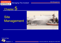 HAZARDOUS MATERIALS Managing The Incident Chapter Site Management 5 Site Management Textbook Page 149 Chapter 5 - 1 © Hazardous Materials - Managing the Incident 2005 HAZARDOUS MATERIALS Managing The Incident Site Management Objectives • • • • Define Site Management And Control. List And Describe The Six Major Tasks That Must Be Implemented As Past Of The Site Management And Control Process. Describe The Procedures For Initially Establishing Command At A Hazmat Incident.’ Describe The Guidelines For The Safe Approach And Positioning Of Emergency Response Personnel At A Hazmat Incident. Chapter 5 - 2 © Hazardous Materials - Managing the Incident 2005 HAZARDOUS MATERIALS Managing The Incident Site Management Objectives • Define The Following Terms And Describe Their Significance In Controlling Emergency Response Resources At A Hazmat Incident: Staging • • • • Level 1 Staging Level 2 Staging Describe The Procedures For Establishing Scene Control Through The Use Of An Isolation Perimeter At A Hazmat Incident. Chapter 5 - 3 © Hazardous Materials - Managing the Incident 2005 HAZARDOUS MATERIALS Site Management Managing The Incident Objectives • Describe The Procedures For Establishing Scene Control Through The Use Of Hazard Control Zones At A Hazmat Incident. Define The Following Terms And Describe Their Significance In Establishing Hazard Control Zones: • • • • • • Hazard Control Zones [NFPA 472 - 3.3.13] Hot Zone [NFPA -472 - 3.3.13.2] Warm Zone [NFPA 472- 3.3.13.3] Cold Zone [NFPA 472 - 3.3.13.1] Area Of Refuge Chapter 5 - 4 © Hazardous Materials - Managing the Incident 2005 HAZARDOUS MATERIALS Managing The Incident Site Management Objectives • Describe The Role Of On-scene Security And Law Enforcement Personnel In Establishing Perimeters At A Hazmat Emergency. [NFPA 472 – 7.3.4.3 (6)] • Define The Following Terms And Describe Their Significance In Protecting The Public At A Hazmat Incident: • Public Protective Actions • Protection-in-place • Evacuation Chapter 5 - 5 © Hazardous Materials - Managing the Incident 2005 HAZARDOUS MATERIALS Managing The Incident Site Management Objectives • Describe Three Criteria For Evaluating Protectionin-place As A Public Protective Action Option. [NFPA 472 – 7.3.4.3 (1 Through 12] • Describe The Guidelines And Procedures For Implementing Protection-in-place At A Hazmat Incident. • Describe Three Criteria For Evaluating Evacuation As A Public Protective Action Option. Chapter 5 - 6 © Hazardous Materials - Managing the Incident 2005 HAZARDOUS MATERIALS Managing The Incident Site Management Objectives • List The Four Criteria For Implementing A Limited Scale Evacuation. • Define Sick Building Syndrome And List Three Indicators Of A Sick Building. • List Four Situations That May Justify A Full Scale Evacuation. • List Four Critical Issues That Must Be Addressed By The Incident Commander To Effectively Manage A Full Scale Evacuation. Chapter 5 - 7 © Hazardous Materials - Managing the Incident 2005 HAZARDOUS MATERIALS Site Management Managing The Incident Introduction • Site Management Is The First Step In The Eight Step Incident Management Process©. • The Major Emphasis Of Site Management Is On Establishing Control Of The Incident Scene • Site Management And Control Provide The Foundation For The Response • The Actions Taken By The Incident Commander (IC) In The First Ten Minutes Of The Incident Usually Dictates How The Next Hour Will Go. Chapter 5 - 8 © Hazardous Materials - Managing the Incident 2005 HAZARDOUS MATERIALS Managing The Incident Site Management Terminology And Definitions • Staging –The Safe Area Established For Temporary Location Of Available Resources Closer To The Incident Site To Reduce Response Time. • Level I Staging - The Initial Location For Emergency Response Units At A Multiple Unit Response To A Hazmat Incident. • Level II Staging – The Location Where Arriving Units Are Initially Sent When An Incident Escalates Past The Capability Of The Initial Response. Chapter 5 - 9 © Hazardous Materials - Managing the Incident 2005 HAZARDOUS MATERIALS Managing The Incident Site Management Terminology And Definitions • Isolation Perimeter —the Designated Crowd Control Line Surrounding The Hazard Control Zones. • Hazard Control Zones — Designation Of Areas At A Hazardous Materials Incident Based Upon Safety And The Degree Of Hazard. • Hot Zone – The Control Zone Immediately Surrounding A Hazardous Materials Incident Which Extends Far Enough To Prevent Adverse Effects From Hazardous Materials Releases To Personnel Outside The Zone. • Warm Zone – The Control Zone At A Hazardous Materials Incident Site Where Personnel And Equipment Decontamination And Hot Zone Support Takes Place. Chapter 5 - 10 © Hazardous Materials - Managing the Incident 2005 HAZARDOUS MATERIALS Managing The Incident Site Management Terminology And Definitions • Cold Zone – The Areas At A Hazardous Materials Incident That Contains The Command Post And Other Support Functions Necessary To Control The Incident. • Area Of Refuge — A "Holding Area" Within The Hot Zone Where Personnel Are Controlled Until They Can Be Safely Decontaminated Or Treated. • Public Protective Actions (PPA) - The Strategy Used By The Incident Commander To Protect The General Population From The Hazardous Material By Implementing A Strategy Of Either Chapter 5 - 11 © Hazardous Materials - Managing the Incident 2005 HAZARDOUS MATERIALS Managing The Incident Site Management Terminology And Definitions • Protection In-place (A.K.A. Shelter-in-place) Directing People To Go Inside A Building, Seal It Up As Effectively As Possible, And Remain There Until The Danger From A Hazardous Materials Release Has Passed. • Evacuation — the Controlled Relocation Of People From An Area Of Known Danger Or Unacceptable Risk To A Safer Area, Or One In Which The Risk Is Considered To Be Acceptable. Chapter 5 - 12