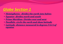 Globe Section 1 Hemispheres- divides the earth into halves Equator- divides north and south Prime Meridian- Divides east and west Parallels- circle the earth and show latitude Latitude- distance measured in degrees N & S of equator Globe Section 1 Globe is a sphere Homolosine Projection- equal-area tennis ball Mercator Projection – shows shapes but not the sizes Robinson- Shows size and shapes of land and oceans, Poles are off Azimuthal Projection- shows earth so that a straight line from central point to any other point, sizes and shapes are distorted Globe Section 1 Two important parallels are the Tropic of Cancer and Capricorn Cancer- N of the equator 23 1/2 N Capricorn- S of the equator 23 1/2 S Artic Circle- 66 1/2 N Antarctic Circle- 66 1/2 S Globe Section 1 Meridians- N to S (pole to pole) Longitude- distance measured in degrees E & W Grid System- Lat & Long lines crossing Absolute Location- using grid system Great Circle Route- shortest distance between two points Globe Section 2 Map Key- explains symbols on the map Compass Rose- N,S,E,W Cardinal direction- N,S,E,W Intermediate direction- between Scale- measures distance Globe Section 2 Political maps- human made boundaries Physical map- mountains, rivers Relief- colors used to show how rugged Elevation- height above sea level Contour map-Contour lines- line for each major level change Globe Section 2 1. 2. 3. 4. Thematic maps show one specific idea or theme (show anything you want) Land use maps Geological map Population density map- average number of people living in a square mile Climate map- average temps Chapter 1 Section 1 5 geographical Themes Location Region Place Movement Human-environment interaction 5 Fields of Learning 1 History- record of the past (helps you orient you in time and space 2 Geography- is the study of people, places and environment 3 Government- people and groups within a society that have authority to make laws carry out laws and settle disagreements (laws are the rules people must follow) Chapter 1 Section 1 Limited government- everyone including those who make the laws must follow them Democracy- people have authority to make laws directly Republic- people make laws through elected officials Chapter 1 Section 1 Unlimited government- rulers can do whatever they want Totalitarianism- people have no say Citizenship- legal member of a country (rights, such as vote , pay taxes and receive benefits from the government) 4 Economics- study of how people manage their money (this is about choice) Scarcity-conflict between people’s desires and their limited resources Resources Natural (trees) Human (goods and services) Capital- (machines and equipment) Chapter 1 Section 1 Two type of economies Command- government decides prices Market- individual business decide prices 5 Culture- beliefs, customs, laws, basically how people live Culture trait- each way of life Religion Language The way they dress Music Chapter 1 Section 2 Culture Region- an area of the world in which share similar beliefs, history, and languages Multicultural- many cultures (U.S. and Canada) unlike parts of the Middle East Interdependence- how one part of the world depends on another part of the world for it goods services (oil, food) Chapter 2 Section 1 Tectonic plate- giant slabs of Earth’s surface 5 Geographic Themes Location- where is where a place is Absolute Location- exact place Latitude lines- run parallel to the equator Longitude lines- meridians run with the Prime Meridian Relative location- location of one place in relation to another location (next to someplace) Chapter 2 Section 1 Place- is the area around the place (rivers mnts, trees) Region- group of places that have physical feature (natural) or human characteristics (languages) Movement- people, goods and ideas move Migrate- move from one area to settle in another Emigrate- leave a country Immigrate- to enter a country Push factors- make you leave Pull factors- make you want to go to a place Chapter 2 Section 1 Human-Environment Interaction- humans adapt to, depend on, and modify the world around them Humans may harm or help the environment Clear meadows, Pollution Environment can harm itself Volcanoes, hurricanes Chapter 2 Section 2 Cartographer- person who makes maps Thematic map- shows one specific idea Map projection- putting Earth’s curved surface on a flat map Geography is also the use of charts, graphs and maps Chapter 3 Section 1 North America includes U.S. Canada Greenland worlds largest Island Mexico Central America and the Caribbean island South America and Latin America receive their heritage from Spain and Portugal Latin America includes South America and Mexico and the Caribbean islands Chapter 3 Section 1 Middle Latitudes from Arctic Circle to the Tropic of Cancer Earliest settlers arrived 12,000 to 35,000 years ago Video Geographic Regions Atlantic Coastal Plain- Gulf of Mexico to the east coast Appalachian Mountains Central Lowlands- West of the Appalachian to the Great Plains Great Plains to the Rocky Mountains Rocky Mountains- western part of the continent from Alaska to Mexico Chapter 3 Section 1 Intermountain Region- Between the Rocky Mountains and western coastal mountains Canadian Shield or Laurentian Plateau- covers most of Greenland around the Hudson Bay and into the Great Lakes Landforms- features of the Earth’s surface Glacier- thick sheet of ice that moves slowly across land Mississippi and Missouri rivers are the longest in the U.S. Chapter 3 Section 2 Weather- state of the atmosphere near Earth at a given time and place Precipitation- rain Climate- weather in a region over a long period of time Chapter 3 Section 2 Vegetation Zones- what grows in these areas Polar and Tundra 4-20 in. Forests 10-80 in. Rain Forests as much as 167 in. Grassland around 30 in. Desert less than 10 in. Chapter 3 Section 2 U.S. Canada rich in natural resources Soil Forests Oil Coal Water Farm Raise cattle Ship goods Fish Energy Chapter 4 Section 1 U.S. many cult