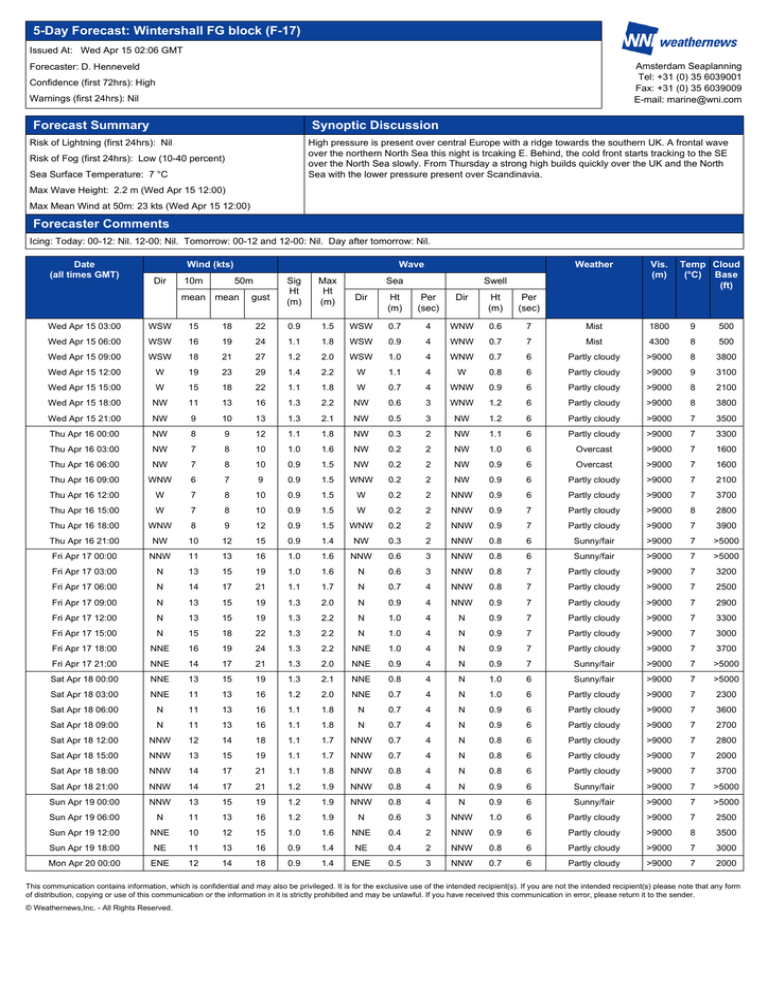 5-Day Forecast: Wintershall FG block (F-17) Issued At: Wed Apr 15 02:06 GMT Amsterdam Seaplanning Tel: +31 (0) 35 6039001 Fax: +31 (0) 35 6039009 E-mail: marine@wni.com Forecaster: D. Henneveld Confidence (first 72hrs): High Warnings (first 24hrs): Nil Forecast Summary Synoptic Discussion Risk of Lightning (first 24hrs): Nil High pressure is present over central Europe with a ridge towards the southern UK. A frontal wave over the northern North Sea this night is trcaking E. Behind, the cold front starts tracking to the SE over the North Sea slowly. From Thursday a strong high builds quickly over the UK and the North Sea with the lower pressure present over Scandinavia. Risk of Fog (first 24hrs): Low (10-40 percent) Sea Surface Temperature: 7 °C Max Wave Height: 2.2 m (Wed Apr 15 12:00) Max Mean Wind at 50m: 23 kts (Wed Apr 15 12:00) Forecaster Comments Icing: Today: 00-12: Nil. 12-00: Nil. Tomorrow: 00-12 and 12-00: Nil. Day after tomorrow: Nil. Date (all times GMT) Wind (kts) Dir 10m Wave 50m mean mean gust Sig Ht (m) Max Ht (m) Sea Weather Vis. (m) Mist 1800 9 Swell Dir Ht (m) Per (sec) Dir Ht (m) Per (sec) Temp Cloud (°C) Base (ft) Wed Apr 15 03:00 WSW 15 18 22 0.9 1.5 WSW 0.7 4 WNW 0.6 7 500 Wed Apr 15 06:00 WSW 16 19 24 1.1 1.8 WSW 0.9 4 WNW 0.7 7 Mist 4300 8 500 Wed Apr 15 09:00 WSW 18 21 27 1.2 2.0 WSW 1.0 4 WNW 0.7 6 Partly cloudy >9000 8 3800 Wed Apr 15 12:00 W 19 23 29 1.4 2.2 W 1.1 4 W 0.8 6 Partly cloudy >9000 9 3100 Wed Apr 15 15:00 W 15 18 22 1.1 1.8 W 0.7 4 WNW 0.9 6 Partly cloudy >9000 8 2100 Wed Apr 15 18:00 NW 11 13 16 1.3 2.2 NW 0.6 3 WNW 1.2 6 Partly cloudy >9000 8 3800 Wed Apr 15 21:00 NW 9 10 13 1.3 2.1 NW 0.5 3 NW 1.2 6 Partly cloudy >9000 7 3500 Thu Apr 16 00:00 NW 8 9 12 1.1 1.8 NW 0.3 2 NW 1.1 6 Partly cloudy >9000 7 3300 Thu Apr 16 03:00 NW 7 8 10 1.0 1.6 NW 0.2 2 NW 1.0 6 Overcast >9000 7 1600 Thu Apr 16 06:00 NW 7 8 10 0.9 1.5 NW 0.2 2 NW 0.9 6 Overcast >9000 7 1600 Thu Apr 16 09:00 WNW 6 7 9 0.9 1.5 WNW 0.2 2 NW 0.9 6 Partly cloudy >9000 7 2100 Thu Apr 16 12:00 W 7 8 10 0.9 1.5 W 0.2 2 NNW 0.9 6 Partly cloudy >9000 7 3700 Thu Apr 16 15:00 W 7 8 10 0.9 1.5 W 0.2 2 NNW 0.9 7 Partly cloudy >9000 8 2800 Thu Apr 16 18:00 WNW 8 9 12 0.9 1.5 WNW 0.2 2 NNW 0.9 7 Partly cloudy >9000 7 3900 Thu Apr 16 21:00 NW 10 12 15 0.9 1.4 NW 0.3 2 NNW 0.8 6 Sunny/fair >9000 7 >5000 Fri Apr 17 00:00 NNW 11 13 16 1.0 1.6 NNW 0.6 3 NNW 0.8 6 Sunny/fair >9000 7 >5000 Fri Apr 17 03:00 N 13 15 19 1.0 1.6 N 0.6 3 NNW 0.8 7 Partly cloudy >9000 7 3200 Fri Apr 17 06:00 N 14 17 21 1.1 1.7 N 0.7 4 NNW 0.8 7 Partly cloudy >9000 7 2500 Fri Apr 17 09:00 N 13 15 19 1.3 2.0 N 0.9 4 NNW 0.9 7 Partly cloudy >9000 7 2900 Fri Apr 17 12:00 N 13 15 19 1.3 2.2 N 1.0 4 N 0.9 7 Partly cloudy >9000 7 3300 Fri Apr 17 15:00 N 15 18 22 1.3 2.2 N 1.0 4 N 0.9 7 Partly cloudy >9000 7 3000 Fri Apr 17 18:00 NNE 16 19 24 1.3 2.2 NNE 1.0 4 N 0.9 7 Partly cloudy >9000 7 3700 Fri Apr 17 21:00 NNE 14 17 21 1.3 2.0 NNE 0.9 4 N 0.9 7 Sunny/fair >9000 7 >5000 Sat Apr 18 00:00 NNE 13 15 19 1.3 2.1 NNE 0.8 4 N 1.0 6 Sunny/fair >9000 7 >5000 Sat Apr 18 03:00 NNE 11 13 16 1.2 2.0 NNE 0.7 4 N 1.0 6 Partly cloudy >9000 7 2300 Sat Apr 18 06:00 N 11 13 16 1.1 1.8 N 0.7 4 N 0.9 6 Partly cloudy >9000 7 3600 Sat Apr 18 09:00 N 11 13 16 1.1 1.8 N 0.7 4 N 0.9 6 Partly cloudy >9000 7 2700 Sat Apr 18 12:00 NNW 12 14 18 1.1 1.7 NNW 0.7 4 N 0.8 6 Partly cloudy >9000 7 2800 Sat Apr 18 15:00 NNW 13 15 19 1.1 1.7 NNW 0.7 4 N 0.8 6 Partly cloudy >9000 7 2000 Sat Apr 18 18:00 NNW 14 17 21 1.1 1.8 NNW 0.8 4 N 0.8 6 Partly cloudy >9000 7 3700 Sat Apr 18 21:00 NNW 14 17 21 1.2 1.9 NNW 0.8 4 N 0.9 6 Sunny/fair >9000 7 >5000 Sun Apr 19 00:00 NNW 13 15 19 1.2 1.9 NNW 0.8 4 N 0.9 6 Sunny/fair >9000 7 >5000 Sun Apr 19 06:00 N 11 13 16 1.2 1.9 N 0.6 3 NNW 1.0 6 Partly cloudy >9000 7 2500 Sun Apr 19 12:00 NNE 10 12 15 1.0 1.6 NNE 0.4 2 NNW 0.9 6 Partly cloudy >9000 8 3500 Sun Apr 19 18:00 NE 11 13 16 0.9 1.4 NE 0.4 2 NNW 0.8 6 Partly cloudy >9000 7 3000 Mon Apr 20 00:00 ENE 12 14 18 0.9 1.4 ENE 0.5 3 NNW 0.7 6 Partly cloudy >9000 7 2000 This communication contains information, which is confidential and may also be privileged. It is for the exclusive use of the intended recipient(s). If you are not the intended recipient(s) please note that any form of distribution, copying or use of this communication or the information in it is strictly prohibited and may be unlawful. If you have received this communication in error, please return it to the sender. © Weathernews,Inc. - All Rights Reserved.