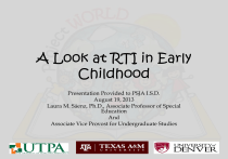 A Look at RTI in Early Childhood Presentation Provided to PSJA I.S.D. August 19, 2013 Laura M. Sáenz, Ph.D., Associate Professor of Special Education And Associate Vice Provost for Undergraduate Studies Overview of the Presentation Roadmap to Pre-k RTI Introduces Models of RTI in Preschool Settings Overview of RTI RTI Approaches Have Evolved as a Response to Two Primary Concerns in K-12 Settings 1. An existing “wait to fail” model in which teams had to wait until a child/student demonstrated a significant discrepancy between intellectual ability and academic achievement (that is, failed) before determining that he or she had a learning disability and thus was eligible for special education services. 2. A commonly occurring practice in which students were identified as having a delay or disability without consideration of the quality, type, or relevance of teaching efforts they may have received in general education settings prior to this identification. RTI in Early Childhood Settings • Understanding models of K-12 RTI models may be useful, but the models may not be directly applicable to EC settings. – Variability in supervision of programs (e.g., agencies vs. schools) – Variability in teacher training or expertise – Variability of resources – Develop needs of EC students are much broader than those in K-12 Origins of RTI • Education of All Handicapped Children Act (1975) defined “underachievement” as discrepancy between IQ and achievement. • IQ/achievement discrepancy is criticized: – IQ tests do not necessarily measure intelligence • Therefore, a discrepancy between IQ and achievement may be inaccurate. – IQ and achievement are not independent. • Difference scores, therefore, may be unreliable. – Waiting for students to fail. • Most students identified by grades 3 to 5. Six Problems in Identifying SLD • 1: Subjectivity in referral with much emphasis on teacher perceptions • 2: Flawed procedures determining LD such as IQ-Achievement Discrepancy models • 3: “Wait to fail” approach (Haager et al., 2007, chapter 1). Six Problems in Identifying SLD • 4: Very little emphasis on appropriateness of instruction • 5: Variability in prevalence across states • 6: Disproportionate numbers of minority students identified as LD (Haager et al., 2007, chapter 1). Addressing the Problems of LD Identification • One option: Eliminate LD as a category included in IDEA. • Second option: Investigate alternate methods for indentifying SWLD. – Major change: recommended use of Response to Intervention (RTI) (Haager et al., 2007, chapter 1). What is RTI? • RTI is an alternative framework for “underachievement”: – unexpected failure to benefit from validated instruction. • RTI eliminates poor instructional quality as an explanation for learning problems. What is RTI? • Not a new process. • A system with parts that have been implemented by schools for a number of years. • Shifts responsibility for struggling learners. • Should be viewed as a process that can enhance the learning of all students. (Ogonosky, 2008, Chapter 1). What is Response to Intervention (RTI)? • RTI is a systematic problem-solving process designed to – allow for earlier identification of students’ difficulties – provide students with a level of instructional intensity matched to their demonstrated response to intervention – provide a data-based method for evaluating the effectiveness of instructional approaches and changing/improving them Definition of Responsiveness-toIntervention When a low-performing student does not show growth in response to small-group validated intervention, to which most students respond, he/she is considered to have special learning needs, due to a disability, which require an individualized learning program. This is typically delivered under the auspices of special education (National Center on Student Progress Monitoring, 2007). Definition of RTI Response to intervention integrates assessment and intervention within a multilevel prevention system to maximize student achievement and to reduce behavior problems. With RTI, schools identify students at risk for poor learning outcomes, monitor student progress, provide evidencebased interventions and adjust the intensity and nature of those interventions depending on a student’s responsiveness, and identify students with learning disabilities (National Center on RTI, 2008). Definition of RTI RTI is a “process of instruction, assessment, and intervention that allows schools to identify struggling students early, provide appropriate instructional interventions, and increase the likelihood that the students can be successful and maintain their class placement” (Mellard & Johnson, 2008, p. 1). Definition of RTI • RTI is the practice of… – Providing high-quality instruction/ intervention matched to student needs and – Using learning rate over time and level of performance to – Making important educational decisions. Source: NASDE 2005 Response to Intervention: Policy Considerations and Implementation. (p. 5) Operationalizing RTI as Dual Discrepancy • Unresponsive is often operationalized as dual discrepancy: – Student performs substantially below level demonstrated by peers and demonstrates a learning rate substantially below peers. • Special education considered only when dual discrepancy, in response to smallgroup validated instruction, is found. Assumptions of RTI • Intended to reduce the need for special education by improving and providing services early • Services are individualized and based on evidence-based strategies • There is a high quality of “general” intervention, and resources and services are added as needed. Key Ideas of RTI 1. All children can learn 2. Intervene early 3. Use a multi-tier model of service 4. Use problem solving method to drive decisions 5. Use research-based, scientifically validated interventions/instruction to the extent ava