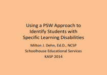 Using a PSW Approach to Identify Students with Specific Learning Disabilities Milton J. Dehn, Ed.D., NCSP Schoolhouse Educational Services KASP 2014 Notice of Copyright 2014 This PowerPoint presentation and accompanying materials are copyrighted by Schoolhouse Educational Services, LLC. They are not to be reprinted, copied, or electronically disseminated without written permission. To obtain permission, email milt@psychprocesses.com. Workshop Information Sources • Essentials of Processing Assessment, 2nd Ed. • Children’s Psychological Processes Scale (CPPS) • Psychological Processing Analyzer (PPA) • www.psychprocesses.com • Intervention references • Presenter Contact: milt@psychprocesses.com Topics 1. 2. 3. 4. 5. 6. 7. 8. Processes to assess Processes and academic skills PSW Models Conducting a processing assessment Completing the processing analysis worksheet Identifying processing deficits with the PPA CPPS overview Processing interventions overview The Need for Processing Assessment 1. Part of a neuropsychological approach 2. Not just for SLD but Autism, ADHD, TBI, etc. 3. Neuroscience has increased our understanding of brain-learning relationships 4. A deficit in a “psychological process” is part of federal and states’ SLD definitions 5. Identification of processing deficits leads to more appropriate & effective interventions Working Memory Example 1. 10% of children have a WM deficit 2. Of those in the bottom 10% percentiles, 80% will have significant learning problems 3. A working memory deficit predicts LD with more than 80% accuracy 4. WM predicts LD better than IQ, consistency predicts better than discrepancy 5. WM evidence-based interventions It’s About the “Why” 1. The “why” matters 2. Learning disabilities have a neurological basis 3. Understanding the brain basis as to why a student has a learning disability is important 4. Identifying processing deficits is a big part of answer the why question 5. Assessment that answer some why questions benefits the learner even without placement or interventions Processing Assessment and RTI 1. Both value early identification 2. When RTI fails, a processing deficit is probably the cause 3. Addressing processing deficits makes academic interventions successful; example 4. Much has changed/improved in regards to processing assessment and intervention What are Neuropsychological Processes? 1. 2. 3. 4. 5. 6. 7. 8. Brain processes, operations, functions Whenever information is perceived, transformed, manipulated, stored, retrieved, expressed Include “cognitive” processes Whenever we think, reason, problem-solve There are basic and higher level processes Doesn’t include knowledge or achievement Learning and performance depend on these processes; they underlie academic skill acquisition There are social-emotional, sensory, and other processes that are not included for SLD assessment Neuropsychological Processes are Not 1. IQ, but they contribute to IQ 2. “Abilities”; are the specific brain processes that underlie abilities 3. More like aptitudes than abilities; aptitudes are more specific 4. Not skills; skills and knowledge are the product of processes Processes to Include in Assessment 1. Broad processes composed of numerous subprocesses – Consider subprocesses when a broad process is low 2. Related to academic learning & performance 3. Observable in the classroom 4. They have evidence-based interventions Processes for SLD Assessment 1. Attention 2. Auditory Processing 3. Executive Functions 4. Fine Motor 5. Fluid Reasoning 6. Long-Term Recall 7. Oral Language 8. Phonological Processing 9. Processing Speed 10.Visual-Spatial Processing 11.Working Memory (WM) Human Processing Limitations 1. Human limitations 2. Which processes does the chimp excel at? Attention 1. 2. 3. 4. Types: Selective, focused, divided, sustained Necessary for learning and memory Attention deficits part of LD; ADHD/LD comorbidity Not necessarily ADHD (not enough symptoms) 1. ADHD is more hyperactive/impulsive 2. Inattentive type is more cognitive/learning problems 5. Can use rating scales to assess attention 6. Related to Executive Functions and Working Memory Executive Functions 1. Self-regulation of cognitive functions and psychological processes 2. There are more than 30 exec processes 3. Self-monitoring, self-regulation, and metacognition are part of EF 4. Have a longer course of development 5. Also have to do with classroom performance 6. Can assess with rating scales Long-Term Recall 1. The focus is on the processes, not the amount of acquired knowledge 2. Close connection with other processes and with academic learning in general 3. Includes encoding, consolidation, storage, and retrieval 4. Don’t need memory battery; can use scores from WJ and other scales Working Memory 1. 2. 3. 4. 5. Processing while retaining information Includes short-term memory Verbal, visual-spatial, & executive WM WM is a cognitive and executive process Scores from WJ, IQ, and other cognitive scales can be used 6. An example of where CHC theory does not match up with neuropsychology; WJ IV has made an adjustment Neuroanatomy of Processes Neuroanatomy of Processes 1. 2. 3. 4. Most in more than one brain lobe Illustrates the interconnectivity of processes Most have specific structures within a lobe Processing speed is a function of interconnectivity; does not have a specific structure Occipital Lobe 1. Dedicated to vision and visual-spatial processing 2. Receives sensory data from the thalamus 3. Visual and spatial processing are separate 4. Dorsal stream (upper) sends spatial information to parietal lobe 5. Ventral stream (lower) sends visual information to temporal lobe Temporal Lobe 1. Auditory processing 2. Long-term memory processing in the hippocampus 3. Some visual processing 4. Semantic memory storage The Hippocampus Parietal Lobe 1. Integrates sensory information 2. Language processing 3. Phonological processing Frontal Lobe 1. 2. 3. 4. 5. 