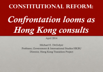 Constitutional Reform: Confrontation looms as Hong Kong consults April 2014 Michael E. DeGolyer Professor, Government & International Studies HKBU Director, Hong Kong Transition Project 18 Dec 2013-1 Jan 2014 • 1007 permanent residents randomly contacted by telephone • +/- 3 points range of error at 95% confidence interval • Research conducted by Hong Kong Transition Project, supported by a grant from the Community Development Initiative Hong Kong Transition Project Is the System Working? Are you currently satisfied or dissatisfied with life in Hong Kong? 2003-04 vs 2014 Satisfaction with life in Hong Kong BY Age groups/BY Occupation Majorities dissatisfied under 40, Managers & Admin, Professionals, Students The skills we need & The future Currently satisfied or dissatisfied with the performance of the SAR Government From unrest, to no unrest, back to unrest? Circles same size, Same height Neither Tung nor Leung had majority satisfied Satisfied with performance of SAR Government BY Age/BY Occupation Students highly dissatisfied Under 40s overwhelmingly dissatisfied Satisfaction with performance of SAR Gov dealing with PRC Gov 2004 was peak dissatisfaction (when Tung did not leave) 2014 dissatisfaction same level as June 2004 Currently satisfied or dissatisfied with the performance of the PRC Gov in dealing with HKSAR Affairs? Dissatisfaction with PRC peaked when Tung appeared supported by PRC Government, dropped as soon as Tung was clearly on way out Satisfaction with PRC Gov handling of SAR affairs BY Age/BY Occupation Students, Associate professionals highly unsatisfied Under 40s highly dissatisfied Are you currently satisfied or dissatisfied with the performance of the PRC Gov in ruling China? Unprecedented dissatisfaction since 1997 founding of SAR starts in 2010, with constitutional reforms Satisfied with the performance of the PRC Gov in ruling China BY Age/BY Occupation Students & Associate Professionals high dissatisfaction rates Under 40s majority dissatisfied Satisfied PRC Gov rule of China/BY Satisfied with life in Hong Kong/BY Satisfied performance of SAR Gov Even stronger correlation of Satisfaction with PRC rule of China and Satisfaction with SAR Gov performance Strong correlation of Satisfaction with PRC gov rule of China and Satisfaction with life in Hong Kong Satisfied PRC rule of China BY Satisfied PRC handling of SAR affairs Stronger correlation between Satisfaction with PRC rule of China and Satisfaction with PRC handling of SAR affairs Satisfied PRC rule of China BY Satisfied with CY Leung’s performance Strongest correlation of Satisfaction with PRC rule of China and Satisfaction with CY Leung’s performance Satisfied with CY Leung’s performance BY Age/BY Occupation Extreme dissatisfaction levels for students, professionals, educators, associate professionals, clerks, managers & administrators Overwhelming dissatisfaction among those under 40 Satisfied with CY Leung’s performance BY Which party represents you best Fairness in policy-making BY satisfaction with Leung’s performance DAB very unrepresentative of public How much do you believe that CY Leung: How much do you believe CY Leung will implement fair Chief Executive election in 2017 BY Age/By Occupation Students extreme, other occupations very high disbelief Extreme levels of disbelief under 30 Why are so many people so dissatisfied and disbelieving? Which problem of Hong Kong are you most concerned about now personally? Political issues highest level ever Satisfaction with Gov performance on problem of most personal concern BY Age Dissatisfaction extreme under 40 Hidden burdens, unfairly distributed • Approximately what percentage of your personal income do you contribute to your parents? Burden of aging highest for under 30, but even 12% over 60 still help their parents Nearly half bear aging burden with little government help Satisfaction with life in Hong Kong BY % Personal income contributed to parents Which party represents best, distribution of Satisfaction with life in HK. Radical parties attract most dissatisfied Dissatisfaction with life in Hong Kong significantly higher among most burdened Which is the most appropriate description of you? Extreme volatility of identity indicates sharp values conflict underway Which is the most appropriate description of you? Identity is clearly in flux (previous slide) and differs greatly generationally: “Generation GAP” profound across many variables Which of these do you consider the most important to you personally to see protected and promoted? No mention in consultation document of international standards or pluralist nature/heritage of Hong Kong Preference of Identity to Protect & Promote BY Age Under 40s much more preference of Hong Kong as pluralistic and international Which party represents you best? Pre-2010 reforms consolidated parties; post 2010 shattered parties, consensus harder Which party represents best, 2013-2014 Small rise in pro-government support, larger rise among pro-democracy groups Which party represents best, BY Age Radical parties clearly dominate under 40s, especially 18-20 (and younger) Which party represents best, BY Occupation Students clearly look to Radical Democrats in large numbers, but also large “no party” group Which party represents best, BY Personal identity Radical parties/Hong Kong person identity becoming defined in opposition. A negative identity (“Hong Kong is NOT like China”) 500,000+ Radicals? • About 20% to 25% of under age 40 look to People Power, League of Social Democrats, Neo-democrats, Labour Party, and hard line members of Civic Party as best representing them and protecting their interests. Under 40s show very high levels of dissatisfaction • About an equal proportion of those who say “no party” best represents them (1/3 of total, about 10% of population over 18) are equally dissatisfied as the group above. But they feel no one best represents them, thus no one “leads” them