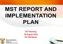 MST REPORT AND IMPLEMENTATION PLAN NCF Meeting 22 August 2013 Mr HM Mweli INTRODUCTION “...science and mathematics should be revitalised through the increased number of school leavers who are eligible to study science and mathematics-based subjects at university. The number of people embarking on careers in science and technology should be at least three times the current levels.” National Planning Commission: National Development Plan, Nov 2011 2 RECOMMENDATIONS – MST MINISTERIAL TASK TEAM 3 FINDINGS RECOMMENDATION Ineffective Teacher Training programme DBE to work with DHET and HEIs to strengthen the implementation of initial Teacher Development programmes Identify effective modalities for professional development and support . Ineffective support programmes RESPONS IBILITY DBE (Branch T), DHET, HEIs TIME FRAME October 2013 DBE (Branch July 2013 T) FINDINGS RECOMMENDATION RESPONS TIME IBILITY FRAME Unfavorable Implement norms and DBE (Branch 2014/15 ratio of subject standards for staff T0, PEDs advisors to provisioning to ensure Educators adequate provision per phase. Subject Replace subject PED 2014/15 Advisors not advisors with qualified for appropriately the subjects for qualified ones. which they are responsible FINDINGS RECOMMENDATION RESPONS IBILITY DBE (Branch T) Subject Advisors are not allowed to monitor teaching and learning in the classroom Small multigrade schools which make it difficult for effective teaching and learning to take place Review existing protocols to allow Subject Advisors to monitor and support teaching and learning in the classroom. Consolidation of PEDs Multigrade schools to use options such as boarding facilities, transport etc. TIME FRAME November 2013 December 2013 FINDINGS RECOMMENDATION RESPONS IBILITY Ineffective post Review the PPN to DBE (Branch provisioning bring about T) PDEs norms (PPN) for effective teaching multigrade and learning in schools multigrade schools. Ineffective Redesign Teacher DBE (Branch Teacher Development T), DHET, Development programmes to HEIs programmes for meet the needs of teachers teaching teachers teaching in in multigrade Multigrade schools schools TIME FRAME August 2013 October 2013 FINDINGS Inadequate co ordination with other state departments, agencies, NGOs and corporate Ineffective Resource allocation and utilisation for MST implementation RECOMMENDATION RESPONS IBILITY Strengthen DBE, PEDs partnerships with other state departments, agencies, NGOs and corporate Co ordinate DBE, PEDs resource allocation and utilisation for effective MST implementation TIME FRAME October 2013 July 2013 FINDINGS RECOMMEN DATION Inadequate Explore various uitilisation of ICT to modalities to support MST strengthen ICT utilisation for MST implementation Serious implications Investigate of the combination implications for of Natural Science the combinations and Technology for of NST for teacher teacher demand, demand, supply supply and utilisation and utilisation and deal with the ramifications RESPONS IBILITY DBE (Branch C), PEDs TIME FRAME July 2013 DBE (Branch C and T) October 2013 FINDINGS RECOMMENDATION Strengthen the capacity of the sector to effectively implement the MST strategy Inadequate and uncoordinated internal capacity to effectively implement the MST strategy in the sector Establishment of a dedicated MST strategy office Consolidate MST expertise to strengthen internal capacity to implement MST activities RESPONS IBILITY DBE (Branch C) TIME FRAME July 2013 DBE, PEDs August 2013 FINDINGS RECOMMENDATION Poor language proficiency and utility impacting negatively on MST Lack of coherence between strategy thrust and the implementation plan Implementation of Language across the Curriculum RESPONS IBILITY DBE (Branch C), PEDs Ensure alignment DBE between the strategy and the Implementation Plan TIME FRAME January 2014 July 2013 QUICK WINS 12 QUICK WINS DELIVERABLES RESPONS IBILITY TIME FRAME 1. Establishment of the MST Office. DBE (Branch C) July 2013 2. Aligning the MST plan DBE to the strategy July 2013 3. Aligning Provincial Plans to the MST Strategy and implementation plan. July 2013 PEDs 13 DELIVERABLES RESPONS IBILITY TIME FRAME 4. Strengthening and consolidating MST internal capacity. 5. Matching subjects advisors and teacher competencies to the profile of the post. 6. Providing Maths & Science Siyavula textbooks and workbooks DBE & PEDs Dec 2013 PDEs, Districts & Schools Dec 2013 DBE July 2013 14 DELIVERABLES RESPONS IBILITY TIME FRAME 7.Developing Norms and DBE Standards for MST, LTSM (equipment and consumables) 8. Provision of Science kits and PDEs Technology tool kits through Dinaledi and Technical High School conditional grants. September 2013 9. Scripting lessons plans experience for MST DBE & PDEs August 2013 10. Scripting monitoring and support by subject advisors and SMTs. DBE & PDEs August 2013 August 2013 15 DELIVERABLES RESPONS IBILITY TIME FRAME 11. Monitoring the coverage PDEs & Districts and utilization of the 2012 NSC diagnostic report and remedial plans. July 2013 12. Monitoring the quality and DBE & PDEs impact of MST interventions and support and programmes 13. Using ICT to create virtual PDEs classroom to deal with shortages of suitably qualified teachers as well as revision and enrichment programme. July 2013 16 MST PROVINCIAL REPORTS 17 EASTERN CAPE FINDINGS Many vacant posts throughout the system – at school, district and provincial level. Whilst an MST directorate is in place, it operates as a unique entity with no constructive engagement with the curriculum directorate or districts. WEAKNESSES •Teacher migration from rural to urban areas results in loss of subject expertise. •The delay in the renewal of contracts of temporary teachers. •Multi-grade teaching is prevalent in rural areas. •Although the provincial MSTE Strategy and plan have been developed, schools indicated little knowledge of such. • The GET, FET and MST are working in silos. STRENGTHS All learners are accommodated 