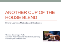 ANOTHER CUP OF THE HOUSE BLEND Hybrid Learning Methods and Strategies Thomas Cavanagh, Ph.D. Assistant Vice President, Distributed Learning University of Central Florida Margaret Single mother Coming back to college Dropped out during first college experience Works as a waitress at a chain restaurant Wants a degree to get a better job in Health Science Arthur High School Math Teacher Pursuing Master’s Degree Limited time for education Family, grading, Wrestling coach Wants a degree to advance in career Carol Full-time nurse Limited time for education: shift work Only one day per week Available for class Wants a BSN degree to advance in career Jared Full-time student Works part time Plays intramural sports Member of a fraternity Student loan debt Wants course flexibility to engage more in the on campus experience Common Thread • Flexible • Convenient • Accommodating • Quality • Workforce-oriented Next Generation Learning Challenges • 4 Challenge Areas • Blended Learning • Analytics • OER • Deeper Engagement • Under 26, low-income • Jared and the younger Margaret The UCF-AASCU NGLC Project • To scale the UCF model of blended learning across the AASCU network of institutions (and beyond). About UCF • Orlando, FL • Metropolitan, suburban • • • • • university 58,000+ students 2nd largest university in U.S. Carnegie classification: RU/VH Research University: Very High Research Activity 216 degree programs across 11 colleges 11 Campuses throughout Central Florida • Center for Distributed Learning • Over 30% of university SCH is online • Over half of all UCF students take at least 1 online course each year. • Fully Online Programs • 5 Undergraduate • 25 Graduate Degree • 29 Graduate Certificates Defining Blended Learning Classes where a portion of the traditional face-to-face instruction is replaced by web-based online learning. Fully Online Fully F2F Blended Learning Why Blended Learning? • Engage faculty in online learning • First step • Reduce delivery costs • Maximize facility use • Increase flexibility and convenience • Improve student learning outcomes • Expand access to education Strategic Alignment WebEnhanced Faculty Initiative Blended Learning Fully Online Institutional Initiative Levels of Blended Learning Program Level (Localness): Courses offered completely online Completely face to face Main campus / regional campus Hybrid/mixed format Course Level (Modality) Temporal / spatial (classroom utilization) Temporal (reduce large class blocks to decrease fatigue and increase productivity) Synchronous distance Assignment Level Group collaboration Discussions Enhanced F2F Time Shifting • One day F2F, rest online • Tues / Thurs • Mon / Wed / Fri • Maximize facility usage • Long instructional block • One 5-hour block split in have • Reduces fatigue, improves quality experience Ways of Blending • Divide for quality (no loss of efficiency) 1 50 1 2 50 150 3 50 Ways of Blending • Aggregate for efficiency (no loss of quality) 1 50 2 50 3 50 1 150 Blended Learning at UCF • Began with an Online initiative in mid-90s • Quickly realized that 75% of students were local • Was the catalyst for the blended learning initiative • Center for Distributed Learning 1,700,000 Sources of UCF Student Credit Hour Growth 1,500,000 1,300,000 1,100,000 900,000 700,000 500,000 1995-96 2000-01 2005-06 2010-11 Blended Learning at UCF 500% growth in blended courses n Fully Online Courses n Blended Learning Courses Blended Learning at UCF Blended Learning Sections Registrations Student Credit Hours (SCH) 2009-2010 Academic Year 681 24,241 70,438 Totals since 2002 5,031 160,860 476,823 UCF Fall 2008 Headcount “Live” Main Campus Students 43,466 “Live” Rosen Campus Students 1,301 865 2,446 2.6% 1.7% 137 111 0.3% 0.2% 33,087 65.8% 7,127 14.2% 2,847 5.7% 363 0.7% 923 1.8% 1,436 2.9% 2,046 4.1% “Live” Regional Students 4,800 Web Students 11,514 UCF Fall 2009 Headcount “Live” Main Campus Students 45,988 “Live” Rosen Campus Students 827 782 2,531 1.6% 1.5% 204 697 0.4% 1.3% 33,988 63.5% 8,593 16.1% 375 0.7% 1,030 1,497 1.9% 2.8% 1,886 3.6% 3,637 6.8% “Live” Regional Students 4,809 Web Students 14,543 UCF Fall 2010 Headcount “Live” Main Campus Students 47,926 “Live” Rosen Campus Students 695 758 1.2% 2,472 1.4% 764 1.4% 34,059 60.6% 234 0.4% 10,363 18.4% 478 0.9% 1,490 2.7% 2,049 3.6% 4,113 7.3% 1,213 2.1% “Live” Regional Students 5,251 Web Students 17,172 Regional Campuses = Blended Learning Alignment with Regional Campuses Fully Online Blended Academic Year 2002-03 SCH % SCH % 22,801 27 5,711 7 2003-04 36,840 35 7,699 7 2004-05 33,690 35 7,159 7 2005-06 48,008 41 8,806 8 2006-07 57,393 44 9,946 8 2007-08 64,843 44 17,067 12 2008-09 74,561 46 10,847 7 2009-10 88,834 51 11,383 7 2010-11 116,508 55 13,481 6 2010-11 F2F = 31% SCH UCF Blended Programs = Choice and Access Fall 2010 Total UCF students Students in Face-to-Face (F2F) Web OR Blended F2F + Web F2F + Blended F2F + Web OR Blended F2F + Web + Blended Web Only 56,129 49,510 23,741 12,157 8,827 18,288 2,696 4,109 (Summer 2010: 6,459) Course Evaluation Ratings N = 672,185 Course Modality Blended % Overall “Excellent” 51.2% Fully Online 48.3% Face to Face 48.2% Lecture Capture (with classroom) 43.4% Lecture Capture (no classroom) 41.6% Student Success Rates by Modality F2F (n=618,899) 100 90 87 88 88 91 Blended (n=39,021) 95 88 87 91 Fully Online (n=109,421) 86 88 91 88 91 94 88 Percent 80 70 60 50 40 30 20 10 0 Spring 09 Summer 09 Fall 09 Spring 10 Summer 10 Withdrawal Rates by Modality 100 90 F2F (n=551,065) Percent 80 Fully Online (n=109,495) Blended (n=39,769) 70 60 50 40 30 20 10 4 4 5 3 2 4 3 3 4 3 3 5 2 1 4 0 Spring 09 Summer 09 Fall 09 Spring 10 Summer 10 Student Satisfaction in Fully Online and Blended Courses Percent Fully online (N = 1,526) Blended (N = 485) 39% 41% 38% 44% 9% 11% Very Satisfied Satisfied Neutral 9% 3% 5% 1% Very Unsa