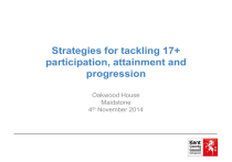 Strategies for tackling 17+ participation, attainment and progression Oakwood House Maidstone 4th November 2014 17+ participation, attainment and progression in London: Main research findings and recommendations Professors Ann Hodgson and Ken Spours Institute of Education, University of London The 17+ issue • RPA and the importance of sustained and high quality participation post-16 • Successful 17+ participation is the major indicator of potential success at L3 and progression from L2 to L3 by age 19 • London has made important strides in pre-16 attainment but less so in post-16 attainment at L3 • In 2013/14 IOE/London Councils have been researching this issue using secondary data and visits to schools and colleges 17+ participation • Participation at 16 &17 in 2014 in London is higher than the rest of the country (92.3%/90.8%) and in full-time education (88.7%/83.2%). Participation at 17 continues to rise • But under 3% of 16 &17 year olds are in WBL/Apprenticeship and this has continued to fall • Participation rates varied considerably between London boroughs depending on their level of economic and social deprivation. • The proportion of 16-18 year olds studying in school sixth forms and sixth form colleges (SFCs) has increased over the past year, while the percentage studying in general further education colleges (GFEs) has declined. 17+ retention • Only a third of school students embarking on a L2 course at 16 progressed to L3 study. • 17+ retention in A Level programmes in schools (82%) is greater than in L3 vocational programmes (59%). • Just under a quarter of Year 12 L3 starters ‘dropped out’ of their sixth form before 18. • GCSE English and maths at grades A*-C are highly important in 17+ retention as are the number of GCSEs or vocational equivalents (8 not 5) 17+ attainment • London is below the national average on all L3 attainment measures (except attainment of two L3 awards at 18) and notably on total points – 682 compared to 706 nationally • Broader attainment at KS4 produces better outcomes post16: About 30% of L3 learners in London schools in 2011/12 did not have A*-C grades in GCSE E&M and scored on average 540 points Those who had at least 5 GCSE A*-C grades including E&M scored on average 753 points at L3. Those with 8+ GCSE A*-C grades including E&M scored on average 795 points. 17+ participation, attainment & retention in Kent: a brief comparison Much higher than national average GCSE results (5 GCSE A*-C grades incl’ maths and English) Above national average in A Level per student scores – 818/796 but slightly below national average on other measures of A Level outcomes Enormous inter-institutional variation – 1600/252 – for scores per student Overall retention (78%) and transition retention (84%) looks about average or slightly above 17+ risk factors for schools 17+ risk factors for GFEs and SFCs School strategies at Key Stage 4 10 School strategies in Year 12 11 GFE and SFC strategies at 17+ 2. Tracking performance and organising individualised interventions 1. Tightening admissions criteria and offering alternative routes 3. Providing individual support and additional activities Supporting the 'vulnerable' advanced level learner Recommendations 1. The need for a pan-London focus on 17+ participation, attainment and progression 2. A Post-16 London Challenge focused around the 17+ issue • • • Addressing institutional and borough-based variation A step change in the sharing of good practice on the 17+ issue particularly on high quality A Level teaching and learning and underpinning support systems Raising performance through increased partnership working 1. Effective 14-19 Careers Education, Information Advice and Guidance 2. An emphasis on building in progression skills at KS4 3. Increasing the supply of high quality vocational (or mixed academic/vocational) L3 provision and apprenticeships 4. Developing planned ‘three-year sixth’ programmes and reinstating funding for 18 year olds Alps Advanced Level Performance Systems The Implications of Post 16 Reform Guiding your students safely through the rapidly changing Post-16 landscape from now to 2018 Kent LA November 2014 John Philip Outline of this session • A Level Reform – how best to prepare your school / college for September 2015 implementation • How and when are A Levels changing • Preparing your school or college for the linear A Levels • The implications for Information & Guidance and monitoring Alps Vision & Ethos Alps Not just a book of numbers A process not a product A culture that raises student and school achievement Basic principles An individual Everyone is: An Exception To be valued Behind each piece of data is a young person Challenging Times • In the rapidly changing landscape making decisions that have the interests of each student at heart will be crucial. • Decisions that you make now may have a huge impact on the future life choices of the students who enrol in the sixth form in Sept 2015 & subsequently. Why and when are A-Levels changing? Why are A-Levels changing? • In the Ofqual ‘Update on the Reforms Being Made to AS Qualifications and ALevels’ (April 2014) 4 reasons are cited: 1. There are too many resits; 2. Too many assessments disrupt teaching; 3. Too many assessments can have a negative effect on other subjects; 4. The modular system isn’t giving students a broad range of knowledge. 2015 - 17 • • • • • • • • • • • Linear A-Levels Sept 2015 English language English literature English language and literature The sciences (Bi; Ch; Ph) History Psychology Art and design Sociology Business studies Economics Computing These ones go linear from Sept 2015 for Y11 • • • • • • • • • Modular A-Levels Mathematics and further maths MFL and ancient languages Geography Religious studies Design and technology Drama Dance Music Physical education These ones go linear from Sept 2016 for Y10 L