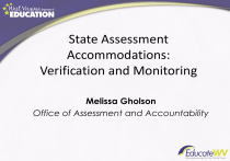 State Assessment Accommodations: Verification and Monitoring Melissa Gholson Office of Assessment and Accountability 2013-2014 Participation Guidelines • The document includes references to current state policies and procedures. • The document was revised in December • Updated to reflect the changes for online assessment. https://sites.google.com/a/wvde.k12.wv.us/oaar-filecabinet/accommodations Code Summary Smarter Balanced A A A A N N N M N A P02 Have test read aloud verbatim N N A A A A A A A O A P03 Use braille or other tactile form of print A A A A A A A N N A A P06 Have test presented through sign language N A A A A A A A A O A P13 Use text to speech, including ELA reading passages (Smarter Balanced–for documented need, grades 6-11) N N N N N N N N N N A P14 Have test read aloud, including passages (Smarter Balanced –for documented need for grades 6-11; students who are blind/low vision grades 3-11 who do not yet have adequate braille skills) N N N N N N N N N N A ACT PLAN APTA WESTEST 2 Social Studies A ACT EXPLORE WESTEST 2 Science P01 Use text to speech, excluding ELA reading passages (Smarter Balanced, WESTEST 2 & NAEP) WESTEST 2 RLA Multiple Choice WESTEST 2 RLA Online Writing Mathematics WESTEST 2 Options and Accommodations Key: A Accommodation allowed WVEIS Code O Option to standard conditions allowed to all students N Not allowed ACT COMPASS Acceptable Options and Accommodations for Students With Disabilities by WV-MAP Assessment ACT COMPASS Exhibit 2. Presentation ONLINE WRITING General Reminders P26 Have directions, passage and prompt read aloud (Allowed for WESTEST 2 Online Writing and NAEP Writing) This is the only read aloud option for this test. P02 is not a universal read aloud code for Online Writing. R04 Indicate responses to a scribe, all elements to be scored (Smarter Balanced, WESTEST 2 and Online Writing) http://wvde.state.wv.us/oaa/westest_training_writing_scribe.html Screen Readers P21Use screen-reading software to access computer Allowed for: WESTEST 2 Online Writing, ACT COMPASS Mathematics and other computer-based assessments excluding WESTEST 2 and Compass Writing Skills. Description: Screen-reading software provides text-to-speech translation. When to select: For students who are vision impaired, and for whom the use of screen-reading software is the typical mode of accessing written material. Notes for implementation: Screen readers are allowed only when it is typical access. Only JAWS 11 and 12 work as well as Systems Mobile Access (see Appendix L on page 89 for more directions). On NAEP the text-to-speech function is a built-in universal design element. High Contrast P28Use high contrast for online assessments Allowed for: Smarter Balanced, WESTEST 2 and Online Writing, ACT COMPASS, NAEP, and other computer based assessments. Description: Enable students to adjust screen background or font color, based on student needs or preferences. This may include reversing the colors for the entire interface or choosing the color of font and background. Reverse contrast turns the screen from white to black and creates text in white. When to select: For students who have vision or perception difficulties and use this accommodation instructionally. Students with attention difficulties may need this support for viewing test content. It also may be needed by some students with visual impairments or other print disabilities (including learning disabilities). Choice of colors should be informed by evidence that color selections meet the student’s needs. Preparing for Spring 2014 WESTEST 2 ACCOMMODATIONS WESTEST 2 Accommodations P01 Use text to speech, excluding reading passages – Text is read aloud to the student via technology (Embedded into the platform). The students are able to control the speed as well as raise and lower the volume via a voice control. – This support may be needed by students with readingrelated disabilities or by students who are blind and do not have adequate braille skills. – For WESTEST 2 this accommodation will be provided via recordings. The student will need headphones. – Emphasizes student independence. Understanding the difference between P01 and P02 for the WESTEST2 NEW P01 Use text to speech, excluding ELA reading Listen to recorded voice through headset P02 Have test read aloud. (There are no books with online testing. Teacher will read directly from students screen). Human reader Enlarge Text • P22 Enlarge text on a screen Description: Screen-enlarging software may involve the use of enlarged computer monitors or computers with screen-enlargement programs. Some students use closedcircuit television to enlarge print and display printed material with various image enhancements on a screen. When to select: For students who are visually impaired, and for whom computer screen adjustment is the typical mode of accessing onscreen written material. High Contrast P28Use high contrast for online assessments Allowed for: Smarter Balanced, WESTEST 2 and Online Writing, ACT COMPASS, NAEP, and other computer based assessments. Description: Enable students to adjust screen background or font color, based on student needs or preferences. This may include reversing the colors for the entire interface or choosing the color of font and background. Reverse contrast turns the screen from white to black and creates text in white. When to select: For students who have vision or perception difficulties and use this accommodation instructionally. Students with attention difficulties may need this support for viewing test content. It also may be needed by some students with visual impairments or other print disabilities (including learning disabilities). Choice of colors should be informed by evidence that color selections meet the student’s needs. All available WESTEST 2 Accommodation Codes • • • • • • • • • • • P01 Use text to speech, excluding ELA reading passages –embedded (provided online) WESTEST 2 a recorde