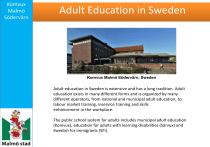 Adult education in Sweden is extensive and has a long tradition. Adult education exists in many different forms and is organized by many different operators, from national and municipal adult education, to labour market training, inservice training and skills enhancement in the workplace.