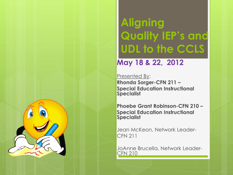Aligning Quality IEP’s and UDL to the CCLS May 18 & 22, 2012 Presented By: Rhonda Sorger-CFN 211 – Special Education Instructional Specialist Phoebe Grant Robinson-CFN 210 – Special Education Instructional Specialist Jean McKeon, Network LeaderCFN 211 JoAnne Brucella, Network LeaderCFN 210 2 IEP The Individualized Education Program (IEP) drives the instruction for every child who receives special education services. Legal Doc. The IEP is a Legal Document 3 Federal law: IDEA - Section 614(d)(1)(A)(i) In the United States an Individualized Education Program (IEP), is mandated by the Individuals with Disabilities Education Act (IDEA). It is a written statement for each child which includes the components specified in section 200.4(d)(2) of the Regulations of the Commissioner of Education to meet the unique educational needs of a student with a disability that is developed, reviewed, and revised in accordance with the law. NYS regulations: Section 200.4(d)(2) “If a student has been determined to be eligible for special education services, the Committee shall develop an IEP” 3 4 Corner Stone The Individualized Education Program (IEP) is the Cornerstone of the Special Education Process Identifies how the resources of the school need to be configured to support the student’s needs Provides an accountability tool Identifies how the student will be prepared for adult living Ensures a strategic and coordinated approach to address a student’s needs IEP Guides the provision of instruction designed to meet a student’s needs Supports participation in the general education curriculum and learning standards 5 Guiding Principle's Child Centered IEP Development Guiding Principles for IEP Development Based on Individual Strengths & Needs Special Education is a Service, Not a Place Least Restrictive Environment (LRE) 6 11) Placement 10) Special Transportation 9) Participation in State Assessments, and with Students without Disabilities 8) Coordinated Set of Transition Activities 7) Testing Accommodations 6) 12 month Services (if needed) 5) Programs and Services - Modifications& Supports Sections of the IEP 4) Reporting progress to parents 3) Annual Goals, Objectives / Benchmarks (if needed) 2) Measurable Post Secondary Goals and Transition Needs 1) Present Level Of Performance 6 7 Activity 1: The IEP process… How are IEPs developed at your school? Turn & talk with your table Be Prepared to Share out… 8 IEP Needs IEP’s needs to be… Written in parent friendly language (no jargon) Clear and concise A working document that provides a framework for subject specific instruction Reflect the ABILITIES and needs of the student and relate to post-school outcomes Promote progress in the curriculum Reflect recommendation’s/services in the least restrictive environments Be a cooperative/collaborative effort between parents, students and school professionals. 9 Areas of Need Four Need Areas: academic achievement, functional performance and learning characteristics; social development; physical development; and management needs. The SESIS IEP form includes the State’s definition of these four need areas. The form also includes fields to document the student’s strengths and needs, including the concerns of the parents for enhancing the education of their child considered in the development of the IEP for each of the need areas. 10 PLOP Present Level of Performance Provides baseline information using data from formal and informal assessment tools Notes and addresses parent and student concerns and desires Must contain transition statements for students who will be 14 and older by December 31 Note: Level 1 Vocational Assessments must be administered to students who will be 12 by December 31.(SOPM on pages 220–222) 11 PLOP Present Level of Performance Strengths? Needs? How does disability impact achievement? Preferences, interests? Parent/Student concerns? Special Considerations? Progress in the past year? Student Performance compared to CCLS standards? Strategies tried? What has worked? What hasn’t? Transition – Post high school plans? (age 14+) 12 PLOP Present Levels of Performance (cont’d) Give a student’s strengths, abilities and needs in the areas of: Academic/Educational Achievement and Learning Characteristics, Social Development, Health and Physical Development Explain how a student’s disability affects his/her involvement and progress in the least restrictive environment. Provide baseline information using information from formal and informal assessment tools CQIEP pgs. 24-29 13 PLOP Present Levels of Performance (cont’d) Address parent and student concerns Provide information on educational progress and management needs 14 What is it that the student… Can do? Can not do? …is able to comprehend main ideas and identify some supporting details …becomes distracted when approached by another student …initiates communication with familiar adult …readily attempts work in subjects in which he has been previously successful …has difficulty visualizing information that is presented only through text 15 PLOP Present Levels of Performance and Related Services Related Service Providers must also provide Present Levels of Performance for their students Make sure to align related service annual goals to student’s present level of performance in the related service. For each annual goal, there must be a connected present level of performance statement. 16 PLP Quality Indicators Addresses 4 need areas: Academic & Functional Performance, Social, Physical, Management Includes Uses Addresses data from multiple sources to describe current functioning Includes progress on prior year’s IEP goals, if applicable Includes student strengths Includes parent concerns and student preferences & interests Includes how the disability impacts involvement and progress in general curriculum supports and accommodations that have been used successfully impact of behavior on learning and social 