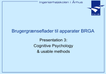 Brugergrænseflader til apparater BRGA Presentation 3: Cognitive Psychology & usable methods Outline • The Psychology of HCI • Human Cognition – Human senses, perception, memory, and interruptions – Mental models, metaphors, and perceived affordance – Which will connect the Psychology theory with the heuristics for next time I • Methods we may employ • Performing a CW The CW method is mandatory for the required assignment in this course. The others are optional. Slide 2 Ingeniørhøjskolen i Århus The Psychology of HCI • Two main theoretic frameworks – Cognitive Sciences – Social Computing • Both with user involvement! – But with different backgrounds – We will not spend too much time on discussing this – Only note, that the Cognitive School is more “hard science” and “lab oriented” than is Social Computing Slide 3 Ingeniørhøjskolen i Århus Cognitive HCI • Cognitive psychology: the study of how people perceive, learn, and remember (USA 1950’s) • Cognition: the act or process of knowing (DK: erkendelse/viden) • “The Psychology of HCI” until late 1980’s – – – – Cognitive HCI the human mind as a series of information processors – almost like a computer, ready to measure against the computer, practical! 3 parts – Input system, output system, information processor system The body (eyes, muscles etc) is only hardware • • Input/output – stimulus/response – ultimatly: the PUM Hard science and practical concerns – engineering HCI • • Lab testing and “measuring” usability MAKE MODELS AND CALCULATE USABILITY! Slide 4 Ingeniørhøjskolen i Århus Cognitive characteristics • The human “central information processing” – Here Cognition takes place • Components of cognition – Short-term(working) vs Long-term memory • Most GUI’S (& SUI’s) are memory intensive • Need to support the user get through the task (focus problems) • User can only comprehend 7+2 elements in short term memory – Associative thinking • Using Icons to connect – The Importance of meaning (humans remember things with …) • DOS, SOAP, CORBA harder than “File System” – use Metaphors – Many other factors, which we will not delve into here • Read more in Shneiderman (Designing the User Interface) • Normans “The Design of Everyday things” • Nielsen's “Usability Engineering” Slide 5 Ingeniørhøjskolen i Århus Why do we care? • Because when people try to understand something, they use a combination of – What their senses are telling them – The past experience they bring to the situation – Their expectations • And this involves: – Human senses, perception, memory, and interruptions – Mental models, metaphors, and perceived affordance Slide 6 Ingeniørhøjskolen i Århus Senses • Senses (sight, hearing, smell, taste, touch) provide data about what is happening around us • We are visual beings (“See what I mean?”) • Designing good User Interfaces requires knowledge about how people perceive Slide 7 Ingeniørhøjskolen i Århus Constructivism • Our brains do not create pixel-by-pixel images • Our minds create, or construct, models that summarize what comes from our senses • These models are what we perceive • When we see something, we don’t remember all the details, only those that have meaning for us – How many links are there on top menu of amazon.com? – What are the colors on your favorite cereal box? – How many lines are there in the IBM logo? – Who cares? – Moral: People filter out irrelevant factors and save only the important ones Slide 8 Ingeniørhøjskolen i Århus Context • Context plays a major role in what people see in an image • Mind set: factors that we know and bring to a situation • Mind set can have a profound effect on the usability of a web site Slide 9 Ingeniørhøjskolen i Århus Example of context: What do you see? Slide 10 Ingeniørhøjskolen i Århus Hint: it’s an animal, facing you . . . Slide 11 Ingeniørhøjskolen i Århus Hint: this animal gives milk, and her face takes up the left half of the picture . . . Slide 12 Ingeniørhøjskolen i Århus Why couldn’t you see the cow’s face at first (not counting those who’ve read it)? • It’s blurry and too contrasty, of course, but more: • You had no idea what to expect, because there was no context • Now that you do have a context, you will have little difficulty recognizing it the next time – Try it again tomorrow Slide 13 Ingeniørhøjskolen i Århus Another example of context: are these letters the same? Slide 14 Ingeniørhøjskolen i Århus Well, yes, but now in context: Slide 15 Ingeniørhøjskolen i Århus Exercise applying this idea • Keep a diary of the number of times you couldn’t “see” something that was in front of you, because you expected it to look different: – The teabags that were in the “wrong” box – The sugar container that was right there—but you were looking for small packets of sugar – A book that you remembered as having a blue cover, but it’s really green – The button you couldn’t “see” because it was flashing, and your mind set is that anything flashing is an advertisement Slide 16 Ingeniørhøjskolen i Århus Figure and ground • Images are partitioned into – Figure (foreground) and – Ground ( background) • Sometimes figure and ground are ambiguous Slide 17 Ingeniørhøjskolen i Århus Figure and ground: What do you see? Slide 18 Ingeniørhøjskolen i Århus Gestalt psychology • “Gestalt” is German for “shape,” but as the term is used in psychology it implies the idea of perception in context • We don’t see things in isolation, but as parts of a whole Slide 19 Ingeniørhøjskolen i Århus Five principles of Gestalt psychology • We organize things into meaningful units using – Proximity: we group by distance or location – Similarity: we group by type – Symmetry: we group by meaning – Contin