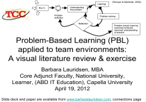 (Stonyer & Marshall, 2002) Problem-Based Learning (PBL) applied to team environments: A visual literature review & exercise Barbara Lauridsen, MBA Core Adjunct Faculty, National University, Learner, (ABD IT Education), Capella University April 19, 2012 Slide deck and paper are available from www.barbaralauridsen.com, connections page Problem-Based Learning (sampling of definitions) …an inquiry-based pedagogy “best rooted in sound understanding of the psychological processes of problem solving and the development of cognition” (Tan, 2007, p. 101). …a process of moving toward knowledge while solving a problem (Barrows & Tambyln, 1980) in which learners develop their own position on a problem and develop meaningful solutions. Learning is constructed by the learners but facilitated by an instructor acting as coach (Igo, Moore, Ramsey, & Ricketts, 2008). Problem-Based Learning (sampling of definitions) …an instructional method focusing on a problem as the “root of learning” which is facilitated by a trained tutor (Kennedy, 2007). …a cyclical situation in which learners collectively solve an “ill-structured, complex problem” accessing prior knowledge and conduct research and devises an action plan. For online PBL, a group works collaboratively across distance including synchronous or asynchronous communications and which has “constructivist epistemology as it foundation” (Sims, 2009, p. 8, 13). Problem-Based Learning (sampling of definitions) …an education approach that reflects learning directions of today, emphasizing “real-life vignettes, self-directed learning and co-operative learning together with other students in small groups,” (Hammar, 2008, p. 514). …“a student-centered pedagogy, offers a strong framework upon which to build a curriculum that will teach our students the necessary problem solving and critical thinking skills to solve the complex problems of the future” (James Madison University, School of Engineering). Problem-Based Learning (PBL) (elements in common) • student-centered, facilitator/coach guided • an educational strategy involving authentic, “real world” scenarios • problems are complex, significant, engage critical thinking of small teams • activates team members’ prior knowledge, builds new knowledge • F2F … becoming virtual or blended Donnelly’s 2009 study for blended PBL • …”important to seek best practices for how to combine instructional strategies in face-to-face and computer-mediated environments that take advantage of the strengths of each” … “to establish, in a PBL tutorial setting, the factors that govern the success of blended PBL” … “opportunity to dialogue with a range of international experts” (Donnelly, 2009, pp. 548-549). Donnelly, R. (2009). Interaction and transformation in virtual problem-based learning communities. Proceedings Of The IADIS International Conference On WWW/Internet, 548-549. Donnelly’s 2009 elements of blended PBL Learning Design Tasks Blend of Web 2.0 Technologies Description …activities, problems and Wikis, interactions used to Blogs, engage the learners, on Concept Maps which learning is based Resources …content, information, and resources with which the learners interact, upon which learning is based Discussion Boards, Podcasts, Social Bookmarking Supports …scaffolds, structures, Live Classroom, Micro-blogging on Twitter encouragements, motivations, assistances and connections used to support learning Donnelly, R. (2009). Interaction and transformation in virtual problem-based learning communities. Proceedings Of The IADIS International Conference On WWW/Internet, 548-549. Challenges “At all stages of education our challenge is to enable students to act out the problems and issues under discussion and make decisions about them based on a more personal understanding of their nature and implications” (Jaques and Salmon 2007, p. 139). Cited in Hahn, I. (2009). Enhancing the outcome problem-based teamwork using social software. Proceedings Of The IADIS International Conference On WWW/Internet, 407-410. Challenges Tutors can support multiple sessions for ProblemBased groups using asynchronous social software (Hahn, 2009): • instant messaging, possibility for multi-user chat, • forums, during group meetings or presentations, • wikis, iterative communication, automated minutes, track collaborations, recordings, commenting on articles, text editing (version control), presenting • blogs, FAQs, commenting on online articles, menu bar features, embedded links, blogroll Hahn, I. (2009). Enhancing the outcome problem-based teamwork using social software. Proceedings Of The IADIS International Conference On WWW/Internet, 407-410. Challenges “To improve engineering education, it is essential that curricula bring students to high levels of cognitive development by exposing them to real-world problem solving. Undergraduate research and industry experiences provide a strong basis for our students to learn these essential, problem-based, and globally competitive skills” (National Science Foundation, “NSF Career Project”). James Madison University, School of Engineering, http://www.jmu.edu/engineering/research/nsfcareer.html 2 pitfalls of PBL practice (1) a poor classification of what constitutes PBL experiences (2) limited assessment studies grounded on strong methodology Reason? PBL practice develops skills that are difficult to measure. (James Madison University, School of Engineering) James Madison University, School of Engineering, http://www.jmu.edu/engineering/research/underengedu.html Classifying Problems James Madison University, School of Engineering, http://www.jmu.edu/engineering/research/underengedu.html Problem Dynamics Problem-based double-loop learning Yeo, R. K. (2007b). (Re)viewing problem-based learning: An exploratory study on the perceptions of its applicability to the workplace. Journal of Managerial Psychology, 22(4), 369-3