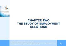 CHAPTER TWO THE STUDY OF EMPLOYMENT RELATIONS Copyright 2009 2009McGraw-Hill McGraw-HillAustralia AustraliaPty PtyLtd Ltd Copyright PowerPointSlides Slidest/a t/aEmployment EmploymentRelations: Relations:Theory Theoryand andPractice Practiceby byBray, Bray,Waring Waringand andCooper Cooper PowerPoint Slides prepared by Chris Martin, University of South Australia 2–1 Overview ER is highly practical and compelling in study and practice General definition – systematic theoretical concepts Descriptive analysis Taxonomies as descriptive devices Rules Patterns of employment relations Models in employment relations Beyond Dunlop Copyright 2009 2009McGraw-Hill McGraw-HillAustralia AustraliaPty PtyLtd Ltd Copyright PowerPointSlides Slidest/a t/aEmployment EmploymentRelations: Relations:Theory Theoryand andPractice Practiceby byBray, Bray,Waring Waringand andCooper Cooper PowerPoint Slides prepared by Chris Martin, University of South Australia 2–2 Introduction Highly practical: ‘Everyone who derives an income through work or who becomes involved in the organisation and management of employees at work is immersed in the practice of employment relations’ Employment relations = organisational performance and employee well-being How should ER be managed on the macro- and microlevels? ER is all about compromise between competing ideas Compelling as a field of academic study and has practical applications Copyright 2009 2009McGraw-Hill McGraw-HillAustralia AustraliaPty PtyLtd Ltd Copyright PowerPointSlides Slidest/a t/aEmployment EmploymentRelations: Relations:Theory Theoryand andPractice Practiceby byBray, Bray,Waring Waringand andCooper Cooper PowerPoint Slides prepared by Chris Martin, University of South Australia 2–3 Patterns of employment relations We need to systematically analyse employment relations First we have to examine the term descriptive analysis – ‘To describe’ is to ‘give an account of’ or ‘state the characteristics of’ a specific event or instance – but we’re all different – It’s all about what facts we accept, and therefore interpret – Description can be very subjective Copyright 2009 2009McGraw-Hill McGraw-HillAustralia AustraliaPty PtyLtd Ltd Copyright PowerPointSlides Slidest/a t/aEmployment EmploymentRelations: Relations:Theory Theoryand andPractice Practiceby byBray, Bray,Waring Waringand andCooper Cooper PowerPoint Slides prepared by Chris Martin, University of South Australia 2–4 ‘Descriptive’ analysis While description can be regarded as the first step towards explanation, it must be accompanied by theory Description does not lead to explanation Theory = a set of assumptions that can be tested Describing patterns of employment relations leads to an ability to generalise – to understand other events Copyright 2009 2009McGraw-Hill McGraw-HillAustralia AustraliaPty PtyLtd Ltd Copyright PowerPointSlides Slidest/a t/aEmployment EmploymentRelations: Relations:Theory Theoryand andPractice Practiceby byBray, Bray,Waring Waringand andCooper Cooper PowerPoint Slides prepared by Chris Martin, University of South Australia 2–5 Lewins’ five levels of explanation 1. Description – An account of an event or phenomenon from a particular standpoint, whether it is adopted consciously or unconsciously 2. Taxonomy – A classification scheme designed for a particular purpose that groups together events or phenomena on the basis of similar characteristics 3. Model – A simplification or representation of relationships between events or phenomena that is designed to provide a clearer picture of the world Copyright 2009 2009McGraw-Hill McGraw-HillAustralia AustraliaPty PtyLtd Ltd Copyright PowerPointSlides Slidest/a t/aEmployment EmploymentRelations: Relations:Theory Theoryand andPractice Practiceby byBray, Bray,Waring Waringand andCooper Cooper PowerPoint Slides prepared by Chris Martin, University of South Australia 2–6 Lewins’ five levels of explanation (cont.) 4. Law – A statement of a relationship between two or more variables that inevitably produces the same outcome, in terms of events or phenomena 5. Causal theory – A complete answer to the ‘why’ question, which not only identifies the inevitable relationships between variables but also provides an account of the process by which one determines the other (Lewins 1992, pp.19–27) Copyright 2009 2009McGraw-Hill McGraw-HillAustralia AustraliaPty PtyLtd Ltd Copyright PowerPointSlides Slidest/a t/aEmployment EmploymentRelations: Relations:Theory Theoryand andPractice Practiceby byBray, Bray,Waring Waringand andCooper Cooper PowerPoint Slides prepared by Chris Martin, University of South Australia 2–7 Taxonomies as descriptive devices Taxonomies are classification systems designed to identify similar properties or characteristics in diverse events, situations or objects, e.g. – clothes: ‘whites’ and ‘coloured’ – cancer: ‘malignant’ and ‘benign’ – rules: ‘formal’ and ‘informal’, ‘substantive’ and ‘procedural’ Taxonomies attempt to move analysis from the specific to the general They also attempt to identify commonalities Copyright 2009 2009McGraw-Hill McGraw-HillAustralia AustraliaPty PtyLtd Ltd Copyright PowerPointSlides Slidest/a t/aEmployment EmploymentRelations: Relations:Theory Theoryand andPractice Practiceby byBray, Bray,Waring Waringand andCooper Cooper PowerPoint Slides prepared by Chris Martin, University of South Australia 2–8 Taxonomies – creating order from chaos While taxonomies help bring order from chaos, they are still largely descriptive – they do not explain much about why events or situations occur Copyright 2009 2009McGraw-Hill McGraw-HillAustralia AustraliaPty PtyLtd Ltd Copyright PowerPointSlides Slidest/a t/aEmployment EmploymentRelations: Relations:Theory Theoryand andPractice Practiceby byBray, Bray,Waring Waringand andCooper Cooper PowerPoint Slides prepared by Chris Martin, University of South Australia 2–9 The
