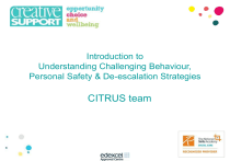 Introduction to Understanding Challenging Behaviour, Personal Safety & De-escalation Strategies CITRUS team Objectives To give participants opportunity to examine the events that create challenging situations To understand how the actions of others may impact on a persons behaviour To examine possible reasons for challenging behaviours to occur To identify appropriate responses to challenging incidents To understand how or why a person may need to challenge their support/environment To introduce the Agency procedure regarding supporting people who challenge To examine the role that communication plays in supporting people who challenge and factors that affect behaviour To ensure participants are aware of the need for accurate recording of behaviour and incidents 2 Group discussion Do all staff need breakaway or physical intervention training? IS THE USE OF PI LAWFUL? Activity 1(pg 4) 3 C.I.T.R.U.S Creative Intervention Techniques in Response to Untoward Situations. 4 Group exercise Is restraint an acceptable approach to difficult or risky situations Always Only as part of a care plan Only as a last resort Never Activity 2 (pg 4) 5 CITRUS referral Assessment based on evidence of incidents Evidence includes:Risk assessments Support plans ABC charts Incident reports Health assessments Care plan Best interest meetings – consent Clinical governance 6 Group work Read the article and consider the following See booklet Activity 2a (pg 4) 8 Levels of intervention De-escalation of challenging behaviour Breakaway Physical intervention 9 Third Second First 10 First level Primary Prevention Addressing the root causes before they happened 11 Second level Secondary Prevention Reactive responses, de-escalation techniques 12 Third level Tertiary Prevention Physical interventions, post incident reviews & debriefs 13 Definitions Of Physical Intervention By definition, a physical intervention involves direct contact between member of staff and a service-user BILD 2002 14 Definitions Of Physical Intervention “Physical intervention implies the restriction of a person’s movement which is maintained against resistance It is, therefore, qualitatively different from other forms of physical contact such as: manual prompting physical guidance support which might be used in teaching or therapy” Harris et al, 1996, p6 15 Definitions Of Physical Intervention “In it’s broadest sense: restraint is taking place when the planned or unplanned, conscious or unconscious actions of care staff prevent a resident or patient from doing what he or she wishes to do and as a result is placing limits on his or her freedom” Lyon and Pimor 2004 16 DEFINITION OF PHYSICAL INTERVENTION There are two broad categories of Physical Intervention (PI): Direct physical contact between a member of staff and a service user, eg, holding a person’s arms and legs to stop them attacking someone The use of barriers, such as locked doors, to limit freedom of movement eg, placing door catches or bolts beyond the reach of service users. By definition, a physical intervention involves direct contact between member of staff and a service BILD 2002 “Physical intervention implies the restriction of a person’s movement which is maintained against resistance. It is, therefore, qualitatively different from other forms of physical contact such as manual prompting, physical guidance or simply support which might be used in teaching or therapy” Harris et al, 1996 17 What is proactive Describes what you are doing on a day to day basis to help minimise the likelihood of someone displaying challenging behaviour 18 Proactive interventions PRIMARY PREVENTION Minimise triggers Changing the environment Routine and structure Boundaries Teaching replacement skills Interaction styles 19 What is reactive How we respond to a person displaying challenging behaviour A plan should be in place for this 20 Reactive Interventions De escalation – redirection, distraction stance Not responding to identified behaviours Withdrawal Breakaway techniques Physical intervention techniques 21 Basic need Is the person at risk of doing harm / injury to themselves or others? 22 scenarios Chris Kirsty Amanda Zetta How would you respond to this situation? What are your responsibilities? What could be the legal outcomes How is the person’s needs evaluated? Activity 3 (pg 6,7,8) 23 Group discussion What was the action? What could you be charged with? Which defense(s) could you use? Activity 3a (pg 9) 24 Scenario Chris Heightened mood verbally abusive throwing things “ stay in your bedroom and don’t come out until I tell you” FALSE IMPRISONMENT 25 SCENARIO Amanda attacks a male member of staff unable to break away use of physical intervention (standing hold) BATTERY 26 SCENARIO Kirsty has become physically aggressive. You tell Kirsty in the heat of the moment “I’m going to restrain you if you don’t stop it!” ASSAULT 27 SCENARIO Zetta restraint and holding Battery and False imprisonment 28 False Imprisonment Seclusion Confinement in a room Tying someone to a chair Preventing (by any means) a person leaving a room or building 29 Assault Shaking a fist Throwing an object The threatened use of a restraining device 30 Battery Touching Holding Pushing Putting in bed 31 DEFENCES There are a number of defences which may be put forward to justify the actions of carers implementing physical interventions which could otherwise be viewed as unlawful under the civil or criminal law 32 REASONABLE DEPENDS UPON: The scale of the threat The other options available Feasibility of options Likelihood of success Ability to give consent 33 Defences Statutory Justification Prevention of a Breach of the Peace Duty of care Private Defence Consent Necessity 34 Policies and Procedures Breakaway and Physical Intervention Health and Safety Challenging Behaviour Supporting Staff involved in incidents Incident reporting Medication Risk assessment and management 35 Further Reading C.I.T.R.U.