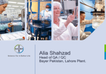 Alia Shahzad Head of QA / QC Bayer Pakistan, Lahore Plant. Introduction of Presenter Complete Name: Mrs. Alia Shahzad Qualification: B. Pharm (PU) M. Phil – Pharmacology (PU) Position in Bayer: Head of QA / QC Technical Experience: 17 years Areas of Interest: - Validations & Qualifications - Aseptic Processing - GMP Inspections & Compliance - Compendial Harmonization Alia Shahzad, Head of QA / QC Water for Injection Page 2 WATER FOR INJECTION STORAGE, SAMPLING, TESTING REQUIRTEMENTS AND QUALIFICATION Alia Shahzad, Head of QA / QC Water for Injection Page 3 Contents of the Presentation PART 1 Water Systems PART 2 Monitoring - Sampling and Testing Frequencies PART 3 Physical, Chemical and Microbiological Testing Parameters PART 4 Testing Methods and Requirements Alert and Action Levels Documentation and Trending of Data Monitored PART 5 Qualification and Requalification of Process Systems PART 6 Particular Considerations for Water Systems Alia Shahzad, Head of QA / QC Water for Injection Page 4 Definitions Water systems Water systems (water used for product compounding or final rinsing of surfaces which will contact the product), are typically operated in the temperate ranges hot, ambient and cold: ► Hot systems are operated above 70 °C ► Cold systems are operated in the range between 2°C and 10°C ► Ambient systems are operated in the range of the environment in which the system is located. Purified water systems can be operated at any temperature. WFI systems are preferably operated hot and with continuous recirculation to control microbial growth. When WFI is stored and distributed at cold or ambient temperatures, special precautions are taken to prevent the ingress and proliferation of microbial contaminants, as e.g. appropriate sanitization cycles which are defined as part of the system qualification Alia Shahzad, Head of QA / QC Water for Injection Page 5 Water Systems (1) The water system distribution Configuration should allow for the continuous flow of water in the piping by means of recirculation. points of use feed water The use of non-recirculating, dead-end, or one-way systems or systems segments should be avoided whenever possible. Alia Shahzad, Head of QA / QC Water for Injection Page 6 Water Systems (2) http://www.nayagara.net/ Pharmaceutical water - used for product compounding or final rinsing of surfaces - exists in different (compendial) qualities such as: Preparation of the different types of water must be performed according to current USP and/or European Pharmacopoeia requirements and - if applicable - according to other pharmacopoeias (e.g. Japanese) and local requirements. Alia Shahzad, Head of QA / QC Water for Injection Page 7 Contents of the Presentation PART 1 Water Systems PART 2 Monitoring - Sampling and Testing Frequencies PART 3 Physical, Chemical and Microbiological Testing Parameters PART 4 Testing Methods and Requirements Alert and Action Levels Documentation and Trending of Data Monitored PART 5 Qualification and Requalification of Process Systems PART 6 Particular Considerations for Water Systems Alia Shahzad, Head of QA / QC Water for Injection Page 8 Monitoring – General Requirements Water systems undergo periodic monitoring of the specified required characteristics. The monitoring program is based on the results of the qualification* work and/or according to the results of a risk assessment. Monitoring is performed according to written procedures, describing in sufficient detail the responsibilities for sampling, the sampling sites, and the sampling frequencies. Typical minimum sampling frequencies for process systems are described in slide 11-12. Higher or lower sampling frequencies for specific processes or products are justified according to the results of a risk assessment. Alia Shahzad, Head of QA / QC Water for Injection Page 9 Sampling Sampling sites must be selected based on a risk evaluation and / or as result of the initial qualification. Samples have to be taken from representative locations within the distribution and processing system. Selection of sampling sites must not compromise the quality (e.g.: microbiological status) of the system being monitored. The sampling plan has to be dynamic allowing for adjustments to sampling frequency and locations based on system performance trends. When routine monitoring points are reduced or increased, the reason for the change has to be documented. Sampling practice must simulate the use of a process system during manufacturing, for example where water for manufacturing is delivered through a hose, sampling has to be performed through this hose. Alia Shahzad, Head of QA / QC Water for Injection Page 10 Monitoring – Typical Minimum Sampling & Testing Frequencies 1 Alia Shahzad, Head of QA / QC Water for Injection Page 11 Monitoring – Typical Minimum Sampling & Testing Frequencies 2 Alia Shahzad, Head of QA / QC Water for Injection Page 12 Monitoring – Typical Minimum Sampling & Testing Frequencies 3 Sampling Point & Point of Use Sampling Point & Point of Use may or may not be the same (see the diagram below): sampling point sampling point Preparation Vessel point of use Alia Shahzad, Head of QA / QC point of use = sampling point Water for Injection Page 13 Monitoring – Typical Minimum Sampling & Testing Frequencies 4 Points of Use Feed Water Particle Filter Ventilation Filter Return Mixed ion exchange bed UV Disinfection unit Inflow UV disinfection unit Storage Tank Pump Particle Filter Alia Shahzad, Head of QA / QC Water for Injection Page 14 Monitoring – Typical Minimum Sampling & Testing Frequencies 5 System-specific sampling points ► depend on the construction and the technical conditions of the installation or system (e.g. begin and end [=return] of the distribution system). Relevant sampling points (API/Potable water) ► evenly distributed throughout the plant (e.g. one sampling point per floor). Critical points of use ► depend on the individual manufacturing proce