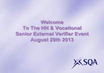 Welcome To The HN & Vocational Senior External Verifier Event August 29th 2013 Agenda Welcome & Overview Matthew Selection process for this session Alastair New Approach Forms and Guidance feedback David/Veronica BREAK 11am New online reporting system Juliette Report system familiarisation session Workshops LUNCH 12.30pm Updated guidance - summary of changes David Qualification Verifier Update Juliette Appointee Update Mark Hood Questions and close 9.30am 3.00pm QA Past, Present and Future…. And then…………… Your Role ‘A Senior External Verifier provides leadership and support to a team of external verifiers through the processes in accordance with SQA policy and instruction.’ Alastair Morton Operations Planning Manager (HN and Vocational Qualifications) Topics Review of Verification Activity 2012 – 13 College Review Future of Reporting Comments: 75 Holds reported (1st Aug 2012 – 31st July 2013) 54% of Allocated Events were Successful 38% of Events were updated as Not Running vs 36% Session 2011 - 12 Includes visits conducted under new approach Profile excludes China and International Centres How SQA plans to tackle this Colleges Provided Verification Plans to all other Scotland’s Colleges Process worked well with 10 partner colleges over last 2 sessions Colleges highlighting Not Running – internally select for accreditation purposes – SQA will set to Not Running First time this process has been considered ETPs Reviewed entry patterns for all approved SVQs over last 2 years Allowed SQA to identify areas of candidate activity Also allowed SQA to target individual Work Assessed units Will select -> de-select as per College process Longer Term IQA project – significant expenditure in designing complete system Profile of Verification Activity Comment: 150 more Successful events vs session 2011-12 (2112 vs 1962) Includes visits conducted under new approach Profile excludes China and International Centres. Comparing 2012-13 vs 2011-12: Type 2012-13 2011-12 Diff SVQ 963 1049 -86 HN G/U 378 376 2 HN 358 357 1 Impact of Verification Profile • Resource impact on Centres • Resource impact on Appointees • Missing assessment windows – (e.g. Semester 1) • • • • • Availability of candidate evidence at Centres may drive part of this profile Moving away from single allocation period -> quarterly allocations React to changing developments at centre / across subject area / industry Allocations will be issued throughout the session -> ongoing verification Initial concentration on ETPs – assessment often throughout year Scotland’s College Update Scotland’s Colleges Update Verification Planning • • • • • All Scotland’s Colleges – met / discussed finalised Verification plan Real focus on Entry information Discussed verification areas which have over / not verified Plans are agreed in partnership Swing from HN qualification to NCs College Mergers • Number of Colleges in process of merging • Sensitive to the transitional period, particularly around availability of candidate evidence across sites • Majority of merging centres have yet to finalise single SEED number and will be operating under original numbers for next 6 – 12 months Challenges of Changing Quality Assurance Approaches in Merging Colleges Scenario 2 Scenario 1 New New New New New Old New Old Scenario 3 New New Old Scenario 4 Old New New Old College Feedback Some Feedback sessions could be more comprehensive Verifiers using a College email address and not a private one…. More Comments need to be provided against Criteria Verifiers are not liaising with the SQA Coordinator Visit Plans are not being provided ahead of visit. Visit plans are issued less than 2 weeks before visit Sampling needs to be more widespread Some Verifiers are not using standard email templates for contacting / planning HN and VQ Approach to Quality Assurance Walkthrough Preparing Planning Verification Prepare EV+ Send Visit Plan Docs Request Information Accept Carrying Out Select Sample Contact Prepare for Visit Agree Agenda General Points Completing Report & Follow-Up Follow-up Flowchart Communicating Decision Plan Feedback Complete Report Reporting Flowchart Explain Decision Conduct Sampling Judge sufficiency Planning Accepting Centre Allocation on EV+ Verification allocations will only be provided via EV+ system Do’s • Accept allocation within 14 days Accept You will receive notification of allocation from EV+ via email. Decline • • • • If you decline the allocated visit, please provide a reason If you do not accept your allocation within 14 days, an automatic reminder email will be sent by EV+ SQA may re-allocate to another Verifier if no response is received within this timescale Please highlight any conflict of interest to QA Logistics Team • If you decline a visit, please provide a reason • Once you have registered, please remember keep your password safe. SQA will not provide you with a password. Don’ts Communicating Decision Plan to deliver balanced feedback Communicate verification decisions on criteria compliance and overall risk rating. Highlight positive aspects of visit, including good practice. Think clearly – what really is Good Practice ? No specific guidance on length of time required for feedback. Do’s • Consider confidentiality and location of feedback session • Give balanced feedback • Recognise centre’s efforts where sufficient evidence provided. • Take time out between making the decision and giving feedback Don’ts • Focus solely on Action Points Criteria Reporting – The Way ahead Evolution of Verification Outcome Reporting Pre 2010 Activity SEV Report EV8A Reports 2010-11 Activity 2012-Now Activity EV8A Reports New Verification Reports Count of Holds Senior Review SEV Report Count of Holds Senior Review SEV Report Detailed Analysis Detailed Analysis The Way Forward… Activity Database (QAMS) ONLINE WEB FORMATTED REPORT Benefits from this session: