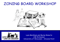 ZONING BOARD WORKSHOP Lynn Markham and Becky Roberts UW-Extension University of Wisconsin - Stevens Point Terminology State statutes define: – Counties have boards of adjustment s. 59.694, stats. for counties, s. 60.65 for towns – Cities & villages have boards of appeal s. 62.23(7)(e), stats. for cities, 61.35 for villages & 60.62 for towns with village powers Both are commonly referred to as: – Zoning Board – BOA – Different from the ‘zoning committee’ Who is here today? – Zoning board of adjustment or board of appeals members? – Members of the governing body? – Zoning committee members? – Planning or zoning staff? – Others? Do you have specific questions about zoning that you want us to cover today? Workshop Outline Part I: Organization and approach to keep you out of trouble • • • • • Zoning board authority and organization Meeting management Impartial decision makers Voting and recording decisions Open meetings and public notice • Break Workshop Outline Part II: Variances • Basics • New case law • Exercise: Would you grant the variance? Lunch Workshop Outline Part III: Other BOA decisions • Conditional Uses • Administrative Appeals • Improving Board Decisions Part IV: Open discussion Why do we have zoning? It is one tool to achieve community goals such as: – Public health, safety & welfare – Natural resource protection – Protection of investments – Aesthetics – Controlling costs of local government infrastructure and services? Zoning operates on 2 scales Landscape scale: – Minimize conflicts between incompatible land uses – Encourage mix of compatible uses Zoning operates on 2 scales Parcel scale: 30’ – Regulate intensity of development on a parcel • Lot size • Density Buildable area – Regulate size and location of buildings on parcel • Setbacks • Floor area ratios • Building height standards 75’ 10’ Who has zoning? Counties •Required to administer shoreland/wetland zoning •May adopt general zoning in unincorporated areas Towns •May adopt general zoning if no county zoning or after adoption of village powers •May adopt shoreland zoning if more restrictive than the county Cities/Villages •May adopt general zoning and extra-territorial zoning (applies 1.5-3 miles outside of boundaries) •May have shoreland or floodplain zoning (required in some circumstances) Who administers zoning? Elected Appointed County Board County Board Chair County Executive (optional) OR County Administrator (optional) Appoint Planning & Zoning Committee Supervise Zoning Administrator Zoning Board of Adjustment Who administers zoning? Conditional use permits? New ordinances or amendments Elected Appointed County Board Conditional use permits? Policy Recommendations Conditional use permits? Planning & Zoning Committee Regular permits (permitted uses) Supervise Zoning Administrator Variances Zoning Board of Adjustment Administrative appeals Zoning Board Authority, Organization and Procedures Zoning Board Authority State statutes define: – Counties (and towns) have boards of adjustment Wis. Stat. s. 59.694, stats. for counties, s. 60.65 for towns – Cities, villages (and towns) have boards of appeal Wis. Stat. s. 62.23(7)(e), stats. for cities, s. 61.35 for villages, s. 60.62 for towns with village powers Both are commonly referred to as: – Zoning Board – BOA, ZBA – Different from the ‘zoning committee’ Zoning Board Organization County Board of Adjustment: 3-5 members Members must reside in an unincorporated area of the county No more than 1 member from each town Town Board of Adjustment: 3 members Members must reside in the town No more than 1 town board member City, Village or Town Board of Appeal: 5 members See Chapter 3 of the Zoning Board Handbook for more details Zoning Board Organization • Counties, cities, villages and towns with village powers shall appoint 2 alternate members to the BOA - 2005 Wisconsin Act 34 – 1st Alternate shall act with full power when a member cannot vote due to conflict of interest or absence – 2nd Alternate only acts when 1st alternate or multiple BOA members cannot vote Zoning Board Organization • Members serve staggered 3-year terms • Vacancies filled for the remainder of a term • We recommend that members of the governing body not serve on the BOA – Difficult to perform both legislative and quasijudicial role Zoning Board Organization • Chief elected official selects BOA members and chair, subject to governing body approval – – – – County board chair Town board chair Village president Mayor Exceptions: – If present, the County Executive or Administrator appoints BOA members – County BOA members choose their own chair and may also select vice chair and secretary Duties of Officers • Chairperson – It is important to have a skilled chair who knows how to run a meeting, not just someone who has seniority or is taking their turn. – Open and close meeting and hearings – Manage the agenda (and amend if necessary) – Describe hearing procedures (role of zoning board, order of events, time limits on testimony, etc.) – Manage input from applicant, staff and witnesses – Manage discussion of zoning board – Call for motions and votes See Chapter 10 of the Zoning Board Handbook for a Hearing Checklist Duties of Officers • Secretary – Perform record keeping and clerical duties – Provide notice of public meetings and hearings – Ensure compliance with Wisconsin’s Open Meetings Law, Public Records Law, etc. – BOA may use zoning staff or retain its own clerical staff if authorized by governing body. – ZA or other person who represents municipality and provides testimony should not serve as secretary. Duties of Members • Zoning Board Members – Be familiar with the material -- don't open your packet at the meeting – Have a public discussion -- don't pass notes or whisper – Explain yourself -- why are you voting this way? – Make 