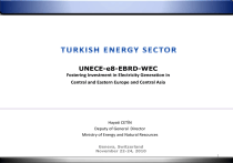UNECE-e8-EBRD-WEC Fostering Investment in Electricity Generation in Central and Eastern Europe and Central Asia Hayati CETİN Deputy of General Director Ministry of Energy and Natural Resources Geneva, Switzerland November 22-24, 2010 1 OUTLINE •Energy Policy, Strategies –energy security- • Legislations, Market Regulations •Renewable Developments in the Sector –hydro-windbiomass …•Energy power plants, •Conclusion 2 Highlights on Past Decade OVER THE LAST DECADE • Rapidly growing economy, • The economy expanded on average by 4.9% a year 2000-2007, • The 17th largest economy of the world. • Turkey’s total primary energy supply (TPES) was 99.5 million tonnes of oil equivalent in 2008 . • From 1990 to 2008, TPES increased by 87%, while the economy doubled. • Turkey depends on imports for %73 of its TPES, including for practically all oil and natural gas and most coal. • in 2009, Total final electricity demand reached 196 TWh. Demand has grown very rapidly in the past two decades. Strong growth particularly from 2001 to 2008, averaging 8.8% per year • Rate of Foreign Dependence (2000-2008) 3 Strategies in The Energy Sector: “Major Aspects” Further diversification in primary energy supply, in terms of energy sources, imports, technologies and infrastructures Development of renewable and introduction of nuclear power Competition oriented market structures in electricity, natural gas and petroleum sectors Energy efficiency along the supply-demand chain Mitigation of GHG emissions from the energy sector Oil and gas pipelines (domestic and cross-border) & electricity interconnections 4 Legislation-Strategy: invesment environment Since taking effect of Law No. 4628 on March 3, 2001, our country has taken substantial steps toward creating a competitive and functioning market in the electricity energy sector, restructuring public institutions operating the sector, and implementing those market rules that will ensure liberalization of the sector. Being a short- and medium-term roadmap in the area of sector reform and privatization, the Electricity Energy Sector Reform and Privatization Strategy Paper was publicized on March 17, 2004. Liberalization in the electricity energy sector, the main purpose of the restructuring initiative is to create an investment environment which allows for those investments that are required for supply security, and to reflect onto consumers all gains that will be made through efficiency increase to be brought about by a competitive environment. 5 Legislation (1/3) • 2001 : – – • Electricity Market Law (No:4628) Natural Gas Market Law (No:4646) 2003 – Petroleum Market Law (No:5015) • 2004: Strategy Paper as Road Map of the Electricity Market Reform & Transition • • 2005: LPG Market Law (No: 5307) 2005 : Law on Utilization of Renewables in Electricity Generation • 2007 : Energy Efficiency Law (No:5627) • Amendments to the Law on Utilization of Renewables in Electricity Generation • 2007: Geothermal Law (No:5686) • 2007 : Nuclear Investments Law (No:5710) • 2008 : Significant Amendments to the Electricity Market Law (No:5784) • 2009: Strategy Paper on Electricity Market Reform, & Security of Supply -- Draft Amendments to the Law on Utilization of Renewables in Electricity Generation Legislation; Law on Utilization of Renewable Energy Sources for the Purpose of Generating Electrical Energy-Law Nu: 5346 (2/3) Definitions and Abbreviations. “Renewable Energy Sources” means such non-fossil energy sources as hydro, wind, solar, geothermal, biomass, biogas, wave, flow and tidal energy. “Biomass” means the solid, liquid or gaseous fuels obtained from organic wastes agricultural and forestry products including waste products of agricultural harvesting and vegetal oil waste as well as from the by-products formed after their processing. 7 Legislation; Law on Utilization of Renewable Energy Sources for the Purpose of Generating Electrical Energy-Law No: 5346 (3/3) The legal framework for promoting electricity generation from renewable sources and include the following main instruments: Feed-in tariffs and purchase obligations Reduced license fees Connection priority Reduced fees related to project preparation and land acquisition Since 2007, all these support mechanisms are in force for ten years. License obligation exemptions for small-scale generators The tariff : EUR 5.5 cent per kWh. 8 Strategies in The Energy Sector-1 • OBJECTIVE AND PRINCIPLES To ensure delivery of electricity, which plays an undisputable role in our economic and social lives, to consumers in an adequate, high-quality, uninterrupted, low cost, and environment-friendly manner. Efforts will continue for creating a competitive market; effectiveness will be brought to initiatives aiming at making new demand-driven electricity production investments sustainable, compatible with market structure, and harmonized with resource priorities of energy policy; Measures will be taken to ensure that electricity transmission and distribution services are offered at such quality and in such amounts as to guarantee consumer satisfaction; • Production and distribution privatizations, which are among tools for creating a competitive market, will be finalized; • • A competitive electricity energy market which functions according to free market rules will be created. Physical integration with the EU internal energy market – Harmonization 9 Strategies in The Energy Sector-2 In structuring of the electricity energy sector, and functioning of the market, the following principles will be adhered to: Creation and maintenance of market structure and market activities in a way to ensure supply security; Toward the target of creating a sustainable electricity energy market, taking into consideration climate change and environmental impacts in activities in all areas of the industry; Minimizing losses during production, transmission, distribution and utilizatio