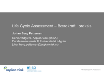 Life Cycle Assessment – Bærekraft i praksis Johan Berg Pettersen Seniorrådgiver, Asplan Viak (MiSA) Førsteamanuensis II, Universitetet i Agder johanberg.pettersen@asplanviak.no PROSIN 2014: Pettersen Miljøregnskap Klima, energi, mineralressurser, vann, utslipp Scope 1 direkteutslipp Scope 3 indirekte, anskaffelser Metals and materials Scope 2 indirekte, energi Transport services and travel, rented vehicles Fuel combustion and use of own vehicles Internal electricity use Production and manufacture at suppliers Services Food and agriculture Insurance, buildings, rent, finance costs, administration, computer services, marketing, outsourced activities, …. PROSIN 2014: Pettersen Klimaregnskapet til norske industrisektorer Mineralverk Olje & gass Transport PROSIN 2014: Pettersen Klimaregnskapet til norske industrisektorer Anskaffelser er det dominerende miljøstyringstiltaket Mineralverk Olje & gass Transport PROSIN 2014: Pettersen Hvor er vi nå? • Dokumentasjon Miljøvaredeklarasjoner (EPD): «påkrevd» for byggevarer (Statsbygg) Product Environmental Footprint (EUs felles EPD-system, på trappene) ISO14001: revidert standard inkluderer verdikjeder WBC/WCSD & GHG Protocol: Corporate value chain & Product life cycle Nye standarder for produkter (PCR) og konsekvenser (klimaspor) Miljøteknologiordningen, Eco-innovation • Regelverk EU direktiver for ecodesign (EuP og ErP), avfall, drivstoff, utslippstillatelser (BAT) • Bærekraftsarbeid: system og kvantifisering Leverandørutvikling, miljørettede anskaffelser Eksternt kommunikasjon, miljøfordeler i produkter, CSR Sårbarhet og risikovurdering for verdikjeden • Strategisk arbeid: vet du hvor skoen din trykker PROSIN 2014: Pettersen Hvor er vi nå? • Dokumentasjon Miljøvaredeklarasjoner (EPD): «påkrevd» for byggevarer (Statsbygg) Product Environmental Footprint (EUs felles EPD-system, på trappene) ISO14001: revidert standard inkluderer verdikjeder WBC/WCSD & GHG Protocol: Corporate value chain & Product life cycle krav om dokumentasjon Nye standarder •for Økende produkter (PCR) og konsekvenser (klimaspor) • UlikeEco-innovation standarder, ulike formål, ulike verktøy Miljøteknologiordningen, • Regelverk • Mer fokus på verdikjeden og verdikjedeansvar EU direktiver for ecodesign (EuP og ErP), avfall, drivstoff, utslippstillatelser (BAT) Dokumentasjonsbyrde eller Forretningsmulighet ? • Bærekraftsarbeid: system og kvantifisering Leverandørutvikling, miljørettede anskaffelser Eksternt kommunikasjon, miljøfordeler i produkter, CSR Sårbarhet og risikovurdering for verdikjeden • Strategisk arbeid: vet du hvor skoen din trykker PROSIN 2014: Pettersen PROSIN 2014: Pettersen Livsløpsvurdering (LCA) • Miljø og bærekraft i verdikjeden til produkter • Livsløpsperspektivet: vugge-til-grav • Energi, klima, ressursforbruk, utslippskonsekvenser • Social-LCA: samfunnsansvar i verdikjeden • LCC: Life Cycle Costing, livsløpskostnader PROSIN 2014: Pettersen Livsløpsvurdering (LCA) Mål bestemmer gjerne relevante regler og metode Mål og omfang • Klimaspor, carbon footprint • Miljøvaredeklarasjoner (EPD) • Product Environmental Footprint (PEF) • Kommunikasjon og markedsføring • Teknologivurdering • Best available technique (BAT) • Utredninger og policy • ISO14040/44 Life cycle assessment (LCA) prinsipper • … PROSIN 2014: Pettersen Livsløpsvurdering (LCA) Mål og omfang En skog av verktøy og kilder Inventar for innsatsfaktorer Energi Materialer Prosesser Egne utslipp • LCA-programvare (SimaPro…) og databaser (Ecoinvent…) • Sektorrettet: www.klimaregnskap.no • Industriens egne verktøy: GHG Protocol, NO: møbler, betong… • Ulike grunndata, antagelser Ofte begrensninger i omfang: datagrunnlag og miljømetoder PROSIN 2014: Pettersen CO2 Livsløpsvurdering (LCA) 1 CH4 23 N2O 296 CO2-equiv 1,4-DCB-equiv. Global warming Human toxic impacts Mål og omfang Inventar for innsatsfaktorer Energi Materialer Prosesser Egne utslipp Miljøpåvirkninger Klima: CO2-ekv Energibruk: MJ Utslipp: PM/NOX… Arealbruk: m2år Ressursbruk: metaller Ressursbruk: vann PROSIN 2014: Pettersen Livsløpsvurdering (LCA) Mål og omfang Anvendelse Klimaspor/Carbon Footprint Eco-design EPD & PCR Dokumentasjon ISO14001 Strategiske utvikling Iterativ prosess Inventar for innsatsfaktorer Energi Materialer Prosesser Egne utslipp Miljøpåvirkninger Klima: CO2-ekv Energibruk: MJ Utslipp: PM/NOX… Arealbruk: m2år Ressursbruk: metaller Ressursbruk: vann Fortolkning PROSIN 2014: Pettersen Livsløpsvurdering (LCA) Application Mål og omfang Iterativ prosess LCI Livsløpsinventar LCIA Miljøkonsekvensvurdering Life cycle interpretation PROSIN 2014: Pettersen PROSIN 2014: Pettersen Hammervold, Pettersen, Bjørnbet. ICAA 2014 Eksempel resirkulering av aluminium: kontrollarm • • • • Front lower vehicle control arm Lifetime vehicle distance: 200 000 km Currently: Primary aluminium Wrought to wrought scenario: Mix of primary and secondary aluminium PROSIN 2014: Pettersen Hammervold, Pettersen, Bjørnbet. ICAA 2014 Eksempel resirkulering av aluminium: kontrollarm • • • • Front lower vehicle control arm Lifetime vehicle distance: 200 000 km Currently: Primary aluminium Wrought to wrought scenario: Mix of primary and secondary aluminium 5 scrap treatment strategies investigated, in addition to current situation: 1. Current practice: 100% primary 2. Sorting out highly suitable post-consumer scrap, 25% primary dilution 3. Sorting out relatively suitable post-consumer scrap (different sorting tech.), 25 % primary dilution 4. Unsuitable scrap, simple refining (refining with LT electrolysis and fluxing + 25% primary dilution) 5. Refining of unsuitable scrap (Hoopes process, dilution with 25% primary) PROSIN 2014: Pettersen Primary aluminium melt Hammervold, Pettersen, Bjørnbet. ICAA 2014 Current practice: 100%: Production of aluminium rod Production of aluminium part Assembly of control arm Assembly of vehicl