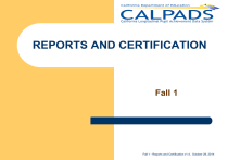 REPORTS AND CERTIFICATION Fall 1 Fall 1 - Reports and Certification v1.4, October 29, 2014 Who’s Supposed to Be Here Individuals assigned to CALPADS maintenance 2 Supervisor of staff assigned to CALPADS Fall 1 - Reports and Certification v1.4, October 29, 2014 Training Sequence Essential 1: Data Coordinator Orientation Essential 2: Interface & Administration Essential 3: Data Submission Essential 4: Anomalies Fall 1 Fall 2 Data Population Fall 2 End of Year 1 & 4 3 End of Year 2 & 3 Fall 1 - Reports and Certification v1.4, October 29, 2014 Courtesy Guidelines Mute yourself Silence cellphones HOLD 1 conversation at a time 4 Fall 1 - Reports and Certification v1.4, October 29, 2014 Agenda 5 Requirements Data Submission Certification Reports Wrap-Up 2 Hours Fall 1 - Reports and Certification v1.4, October 29, 2014 Fall 1 Accounts and Roles Role Allows user to Fall 1 Data collection Certifier View certification status and level 1 certify Superintendent Certifier View certification status and level 2 certify SENR View and submit enrollment data SINF View and submit demographic data SELA View and submit ELAS data SPRG View and submit program data Free Reduced Lunch View and submit NSLP related data including Foster Youth Counts, FRPM, SED *Foster Youth View Foster Youth CDSS matches and reports Authorizing LEA View County/Authorizing LEA Reports County View County/Authorizing LEA Reports (visible to COEs only) Reminders 6 Daily use account LEA Admin cannot certify * This role will become available with one of the upcoming releases this fall. Fall 1 - Reports and Certification v1.4, October 29, 2014 Important Dates Census Day Oct. 1st Certification deadline Amendment Window CALPADS Calendar: http://www.cde.ca.gov/ds/sp/cl/rptcalendar.asp 7 Fall 1 - Reports and Certification v1.4, October 29, 2014 What To Submit Order 1 2 3 4 Online Student Enrollment Student Information Student ELA Student Programs Batch SENR SINF* SELA* SPRG • * Only update as needed to report changes from last year. • Student Enrollment must be posted before submitting other files or you may receive GERR005 errors. See CALPADS Error List on the Resources slide for details. 8 Fall 1 - Reports and Certification v1.4, October 29, 2014 Record Relationships SSID Enrollment SSID Student Information Student ELA Student Program Submitting files out of order may cause GERR005 errors. See CALPADS Error List on the Resources slide for details. 9 Fall 1 - Reports and Certification v1.4, October 29, 2014 Fall Data Reported Active Enrollment Completers + Student Subgroups Dropouts 10 Fall 1 - Reports and Certification v1.4, October 29, 2014 Enrollment Status Reported Active Enrollment Completers • Census Day • Enrollment Status – 10 & 30 • 8/16 (prior year) - 8/15 (reporting year) • No-shows: Exited 5/15 (prior year) - 8/15 (prior year) Dropouts • Other: Exited 8/16 (prior year) - 8/15 (reporting year) • Lost transfers: Exited 8/16 (prior year) - 8/15 (reporting year) not re-enrolled by Census day 11 Fall 1 - Reports and Certification v1.4, October 29, 2014 Key Fields Active Enrollment Record SENR Element(s) Values and/or Notes Student School Start Date On or before Information Day Student School Exit Date On or after Information Day Grade Level Code K-12 Completer Record SENR Element(s) Values and/or Notes Enrollment Status Code 10 or 40 Student School Exit Date On or after 8/16/13, but on or before 8/15/14 Student Exit Reason Code E230 Student School Completion Status 100, 106, 108, 120, 250, 320, 330 See the CALPADS File Specifications (Forms) on the Resources slide near the end of the presentation for detailed field requirements 12 Fall 1 - Reports and Certification v1.4, October 29, 2014 Key Fields No-show Dropout Record SENR Element(s) Values and/or Notes Student School Exit Date On or after 5/15/13, but on or before 8/15/13 Student Exit Reason Code N470 Grade Level Code 7-12 Other Dropout Record Element(s) Values and/or Notes Student School Exit Date On or after 8/16/13, but on or before 8/15/14 Student Exit Reason Code E140, E300, E400, T270, T380, E230 (if Student School Completion Status = 104 or 360) Student School Completion Status Required if Student Exit Reason Code = E230 Grade Level Code 7-12 SENR Lost Transfer* Record SENR Element(s) Values and/or Notes Student School Exit Date On or after 8/16/13, but on or before 8/15/14 Student Exit Reason Code T160, T165, T167 Grade Level Code 7-12 * Only students who meet these criteria and are also not reported as enrolled in a California school by Census day will be counted 13 Fall 1 - Reports and Certification v1.4, October 29, 2014 Key Field - Enrollment SENR – Student School Transfer Code (1.31) • • • • • • 1 (Revised)- Formal Interdistrict Transfer Agreement 2 - NCLB Public School Choice - Program Improvement 3 - NCLB Public School Choice Transfer - Persistently Dangerous 4 - District of Choice Transfer 5 - (New) Disciplinary COE School Transfer 6 - (New) Other Transfer * Refer to the CALPADS Code sets on the Resources slide at the end of the presentation for complete definitions of new and existing codes 14 Fall 1 - Reports and Certification v1.4, October 29, 2014 Student Subgroups Reported Count Source: GATE Student Program Special Ed Student Information Foster Youth Student ELA English Language Acquisition Status (ELAS) Active Enrollments Completers Dropouts Migrant Ed Homeless Title III Eligible Immigrants Parent Level of Education 15 * Free & CALPADS Weekly CDSS Match * Socio-Economically Disadvantaged (SED) is defined as: 1. Free or Reduced Price Meal (181182) or 2. Parent Level of Education = 14 Reduced Meal Program Fall 1 - Reports and Certification v1.4, October 29, 2014 FRPM Eligible Reported Count Source: Student Program Homeless Direct Certification (Nov) Foster Placement Migrant Ed CALPADS Weekly CDSS Match Free or ReducedPrice Meal (FRPM) Eligible Direct Certification (Nov) 16 Free or Reduced-price Meal Program Fall 1 - Reports and