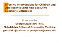 Effective Interventions for Children and Adolescents Exhibiting Executive Functions Difficulties Presented by George McCloskey, Ph.D. Philadelphia College of Osteopathic Medicine gmccloskz@aol.com or georgemcc@pcom.edu 1 2 The Wisdom of Kurt Lewin “There is nothing more practical than a good theory.” Known for his field theory of behavior that posits that human behavior is a function of an individual’s psychological environment. 3 Key Concept Executive Functions: Directive 4 capacities of the mind Multiple in nature, not a single capacity Part of neural circuits that are routed through the frontal lobes Cue the use of other mental capacities Direct and control perceptions, thoughts, actions, and to some degree emotions Thoughts EFs Emotions Perceptions Actions Co-Conductors in a Holarchical Model of EF ef ef ef ef ef ef Trans-Self Integration EF Self-Generation ef Self-Realization ef EF ef ef ef ef ef ef ef ef ef ef ef ef ef Self-Determination ef ef ef ef ef ef ef ef ef ef Self-Regulation Activation Self-Activation EF Tiers within the Holarchical Model of Executive Functions EF Trans-Self Integration Self-Generation EF Self-Realization ef Self-Awareness Other-Awareness Self-Analysis ef Self-Determination Goal setting Long-range Planning & Foresight Self-Regulation ef ef ef ef ef ef ef ef ef ef ef ef ef ef ef ef ef ef ef ef ef ef Activation ef ef ef ef ef ef ef Perceive Focus Sustain Energize Initiate Inhibit Stop Interrupt Flexible Shift Modulate Monitor Correct Balance Gauge Anticipate Estimate Time Analyze Generate Associate Organize Prioritize Self-Activation Plan Evaluate/Compare Decide Sense Time Pace Sequence Execute Hold Manipulate Store Retrieve Key Concept It is important to distinguish between Executive Skills and Executive Functions. 8 Self Regulation Executive Skills Executive Skills involve the use of neural networks routed throughout the brain to perform specific tasks (e.g., attending, inhibiting, modulating, planning, organizing, associating). 9 Self Regulation Executive Functions Executive Functions involve the part of the executive network that is routed through the frontal lobes and that is used to cue, direct, and coordinate the use of executive skills and other mental capacities. 10 Co-Conductors in a Holarchical Model of EF EF Executive Capacities EF ef Executive Functions ef Executive Skills ef ef ef ef ef ef ef ef ef ef ef ef ef ef ef ef ef ef ef ef ef ef ef ef ef ef ef ef ef ef ef ef ef ef ef ef ef ef ef ef ef ef ef ef ef ef ef ef ef ef ef ef ef ef ef ef ef ef 33 Self-Regulation EFs Perceive Focus Sustain Energize Initiate Inhibit Stop Interrupt Flexible Shift Modulate Balance Monitor Correct Gauge Anticipate Est Time Analyze Generate Associate Plan Organize Prioritize Compare/Eval Decide Sense Time Pace Sequence Execute Hold Manipulate Store Retrieve Key Concept Self-regulation Executive Functions can be organized into 7 basic clusters. 13 SREF “Clusters” Attention Engagement Optimization Efficiency Memory Inquiry Solution Self Regulation Executive Function “Clusters” ENGAGEMENT ATTENTION Perceive Focus Sustain MEMORY Hold Manipulate Store Retrieve Energize Initiate Inhibit Stop Pause Flexible Shift OPTIMIZATION EFFICIENCY Sense Time Monitor Pace Modulate Sequence Balance Execute Correct INQUIRY Anticipate Gauge Analyze Estimate Time Compare SOLUTION Generate Associate Prioritize Plan Organize Decide 15 Key Concept Effective use of Executive Functions can vary by Arena of Involvement as well as by Domain of Functioning. 16 Arenas of Involvement Intrapersonal Control of Self in Relation to Self Interpersonal Control of Self in Relation to Others Environment Control of Self in Relation to Surroundings Symbol System Control of Self in Relation to Academics (Reading, Writing, Math) Executive Function Development Some EF-based clinical syndromes, such as ADHD, demonstrate clear patterns of delayed developmental progression. Barkley (1998) estimates developmental delays of about 30% associated with various EF processes such as Inhibit, Manipulate, Shift, Sustain, Time, Monitor, Correct. 18 Developmental Progression with a 30% Delay 100 90 80 E F 70 A G E 50 E Q 20 60 40 30 10 0 6 8 10 15 21 30 Chronological Age 60 90 19 EF Development does not progress by continuous equal intervals 20 Key Concept Virtually all individuals who struggle with psychological disorders exhibit executive function difficulties. 21 Executive Functions and Clinical Diagnoses “Deficits in PFC [prefrontal cortex, aka frontal lobes] function are evident in every neuropsychiatric disorder (indeed, the term “psychiatric problem” seems synonymous with PFC dysfunction).” Arnsten & Robbins 2002 in Principles of Frontal Lobe Function Executive Functions and Clinical Diagnoses Most of the clinical conditions described in the DSM-V reflect some form of Executive Dysfunction The DSM-V can be thought of as “A User’s Guide to All the Things That Can Go Wrong With the Frontal Lobes” Executive Functions and Clinical Diagnoses A sampling of conditions involving EF deficits: Autism Asperger’s Syndrome ADHD and ADD Conduct Disorder Oppositional Defiant Disorder Depression and/or Anxiety Obsessive-Compulsive Disorder Fetal Alcohol Syndrome Key Concept Executive Functions and the Nucleus Accumbens both influence emotional states. 25 Engagement of Self-Regulation External Demand Pathway Executive Functions Teach how to selfregulate in a way that increases the desire to self-regulate Internal Command ??? Nucleus Accumbens Internal Command Pathway: Intrinsically Rewarding External Demand Extrinsic Rewards & Punishments 26 Internal versus External Control The neural circuits for executive function activation are routed differently depending on whether the activation is based on an internally driven desire or command versus an external demand. 27 Internal versus External Control Because internally driven production is much easier to accomplish than externally demanded production for childre