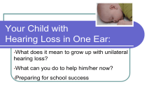 Your Child with Hearing Loss in One Ear: •What does it mean to grow up with unilateral hearing loss? •What can you do to help him/her now? •Preparing for school success Learning Outcomes At the end of this presentation you will be able to: Describe the possible effects of unilateral hearing loss on learning and future hearing 2. Use analogies to help understand potential effects and the need for action 3. Know how to use available materials and services to strive for best child outcomes 1. You expected your baby to be perfect Parents dream of who their babies will be, the joy they will bring and their possible futures, all before they are ever born. Your baby came with a surprise you never expected or thought about – hearing loss. You don’t want to believe it. It doesn’t seem real that your baby could have any problem. You want to believe your baby is perfect It is real. You have a baby with a hearing loss in one ear that will never go away. Maybe that ear looks different. Maybe it looks perfect – just like the other ear. The hearing loss will be a part of him every day of his life. You are thankful that hearing loss is only in one ear but don’t want him to have it at all. It is hard to accept your baby is not perfect When a baby is so young it is hard to believe that hearing tests can be accurate. Hearing tests are very accurate, even when babies are only days or weeks old. Whether you child has some hearing in that ear or no hearing, there is a hearing loss that is part of who she is now and part of the child and adult she will become. Your child is who she or he is. Hearing loss in one ear is as much a part of who she is as her eye and hair color. She will need your love, care and guidance just as if she had no hearing loss. She is a whole person, even if she has a hearing loss in one ear. As parents, you will want to understand what it means to have good hearing in only one ear. How bad can it be? The good ear will compensate for the bad ear, won’t it? Hearing loss is invisible and difficult to understand, especially when someone seems to hear most sounds or most times but not always. It is very common to think that because we have two ears that if something is wrong with one ear, the other ear will do the work of two ears. In reality, we need both ears to perform well in all listening situations. An analogy to help us understand. Think about a child who was born with only ½ of one foot. We require two feet to equally support the weight of our bodies as we walk. With only one normal foot, a child will still learn to walk and run, but likely not as fast or smoothly as children with 2 normal feet; especially in rough terrain or when competing in a race. Can the one good foot really compensate for the ½ foot? No, but having only one good foot works fine in many situations. What to expect at home Your baby can hear normally with one ear. As you diaper him, feed him, play with him you will see him respond to sound. He CAN hear. You are close to him. It is quiet. He is interested in what you are doing. Thinking about our analogy, this is like walking on flat ground with plenty of time to get where you want to go. Rugged terrain Think again of the child with ½ foot playing with other children in a large park with grassy areas, rocky climbing areas, and an obstacle course to jump, skip and hop. She can play anywhere she likes with the other children, have fun and get exercise. She will have difficulty experiencing some of the things to do at the park. She may need to work harder, may avoid some, or may be able to do it all, only at a slower pace. A foot and ear are not the same The analogy of the child with ½ foot is a starting place to understand that 2 ears are really needed, and one ear cannot do the job of two ears. There is at least one big difference as we think about the child with only one normal foot and your child with only one normal ear – listening is strongly tied to the ability to learn at home and at school! A foot problem will likely not impact learning. Language learning, every hour a child is awake, every day, everywhere. Babies learn language by hearing it around them every day. Parents don’t ‘teach’ children to learn how to talk. Your child will learn language whenever you interact with him and as he sees you communicate with other people. Language is caught, not taught. Rugged listening terrain So “rugged listening terrain” would be any situation in which listening is not easy, specifically: DISTANCE & BACKGROUND NOISE. Every day listening with 2 ears Hearing is a distance sense. We monitor what is going on around us with our hearing. Think about all you hear right now – in the room you are in, sounds from other places in the building, sound from outside. Two ears working together hear just a bit better than one ear working alone. We turn our heads to use both ears to locate where sound is coming from. Summation effect. Binaural effect. Distance The concept of the LISTENING BUBBLE Not in listening range In listening range! How ‘far’ can a child hear? It depends! How interested is the child in the sound? How much background noise? She may hear the cookie jar opening from the next room because she loves cookies. He may not seem to hear when spoken to from the same room if he is very interested in what he is doing. BUT children with only one ear do not hear as well as children who have 2 ears that work together. Observing child behavior when presented with contrived listening activities at different distances Try the Early Listening Function activities across the room and in the next room 12 Activities: 4 quiet, 4 typical loudness, 4 loud Loudness calibration is not critical – parent participation in typical environments is critical Quiet and noise: develop awareness of how having the TV always on limits the child’s perception of other sounds http://www.kandersonaudconsulting.com/uploads/ELF_Questionnaire.pd f Early Listening Func